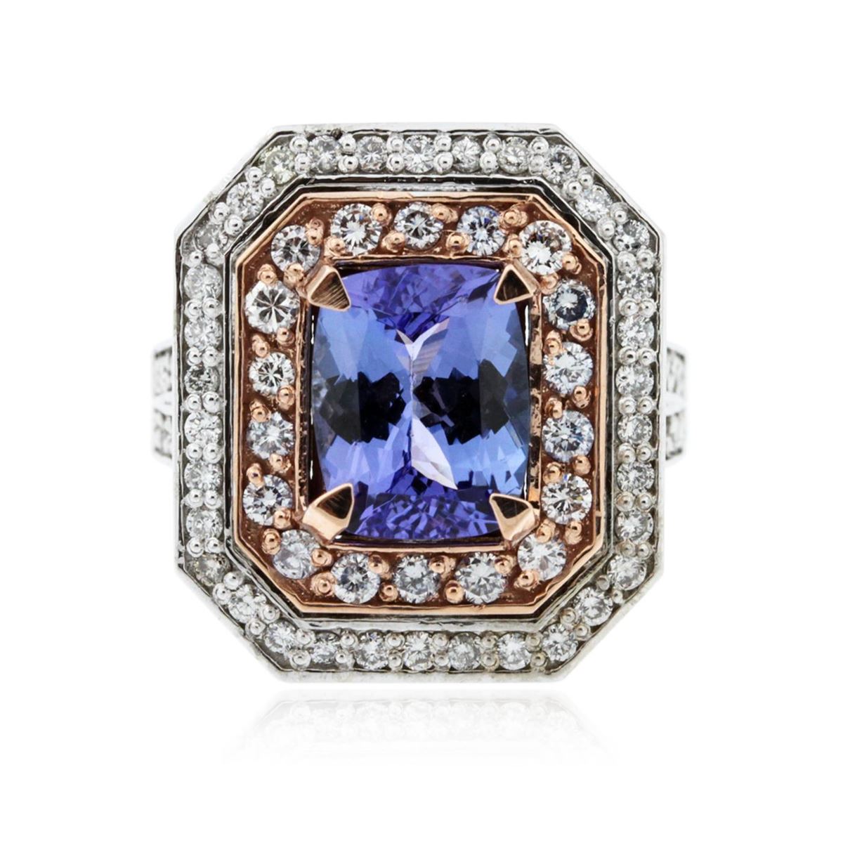 One electronically tested 14KT rose and white gold Ladies combination cast & assembled ring with a bright polish finish. Condition is new. Identified with markings of "K14". Containing: One prong set rectangular cushion modified brilliant cut natural tanzanite, measuring 9.92 x 8.44 x 4.70mm, approximate weight of 3.10ct., clarity is eye clean, type I, medium, very slightly grayish, violet color, (GIA V 5/3), cut is very good. Colored gemstones are presumed to have been subjected to commonly used color/clarity enhancement processes. Seventy-Four prong set round brilliant cut diamonds, measuring 1.40 - 1.40 x 0.46mm (depth est.) approximate. Total Weight of 74 Stones = 0.41ct. Clarity: SI-2 to I-1. Color: H - I, Cut is Good. Total Weight of Colored Stones 3.10ct. Total Weight of Diamonds 0.41ct. Total Weight of Ring 11.60 grams. GGL Appraised at $9,150.00.