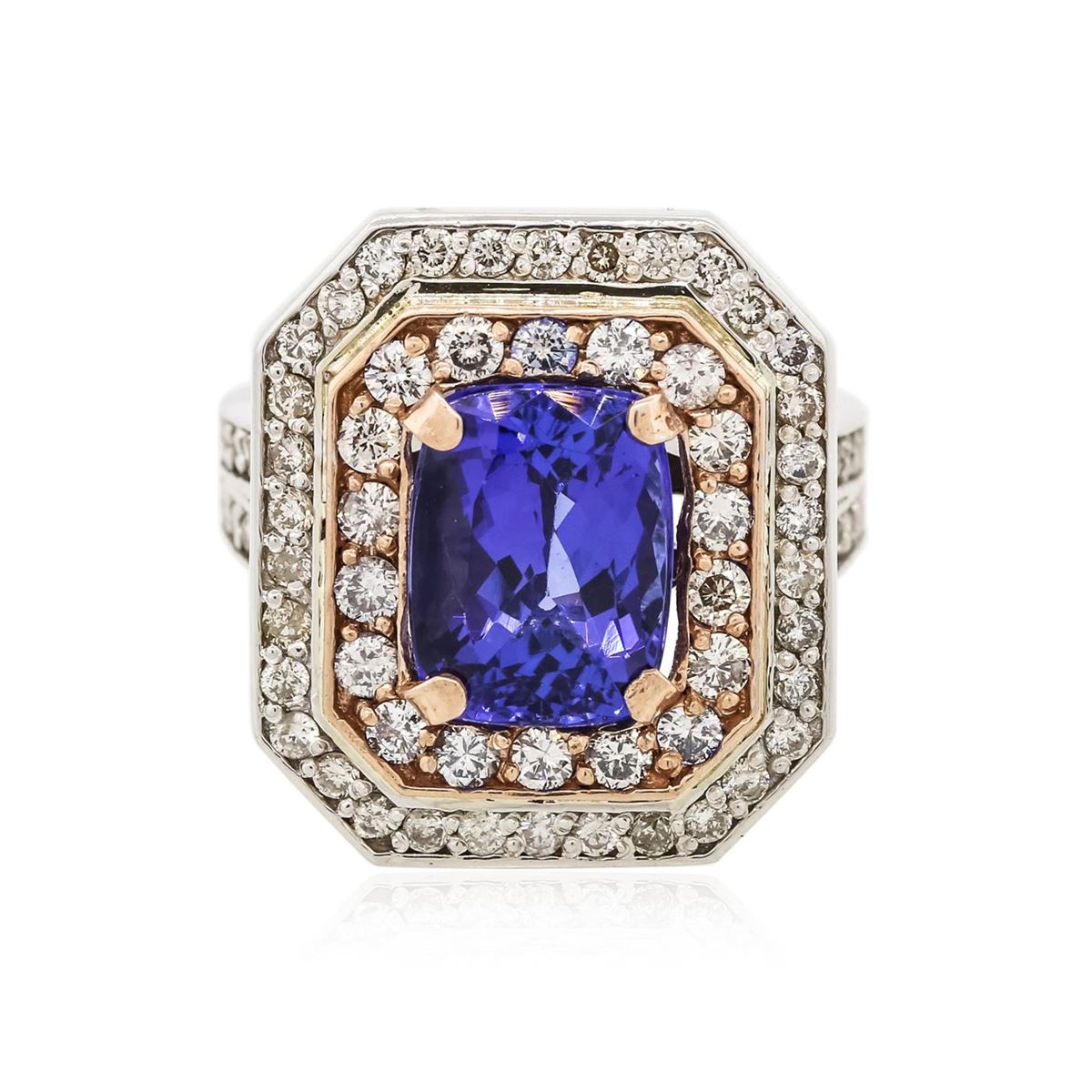 One electronically tested 14KT rose and white gold Ladies combination cast & assembled ring with a bright polish finish. Condition is new. Identified with markings of "14K". Containing: One prong set rectangular cushion modified brilliant cut natural tanzanite, measuring 10.20 x 8.49 x 6.30mm, approximate weight of 4.29ct., clarity is eye clean, type I, medium, moderately strong, violetish blue color, (GIA vB 5/4), cut is very good. Colored gemstones are presumed to have been subjected to commonly used color/clarity enhancement processes. Thirty-Five prong set round brilliant cut diamonds, measuring 1.30 - 1.30 x 0.78mm (depth est.) approximate. Total Weight of 35 Stones = 0.35ct. Clarity: I-1 to I-2. Color: I - J, Cut is Good. Eighteen prong set round brilliant cut diamonds, measuring 1.80 - 1.80 x 1.08mm (depth est.) approximate. Total Weight of 18 Stones = 0.38ct. Clarity: I-1 to I-2. Color: I - J, Cut is Good. Total Weight of Colored Stones 4.29ct. Total Weight of Diamonds 0.73ct. Total Weight of Ring 11.30 grams. GGL Appraised at $10,950.00.