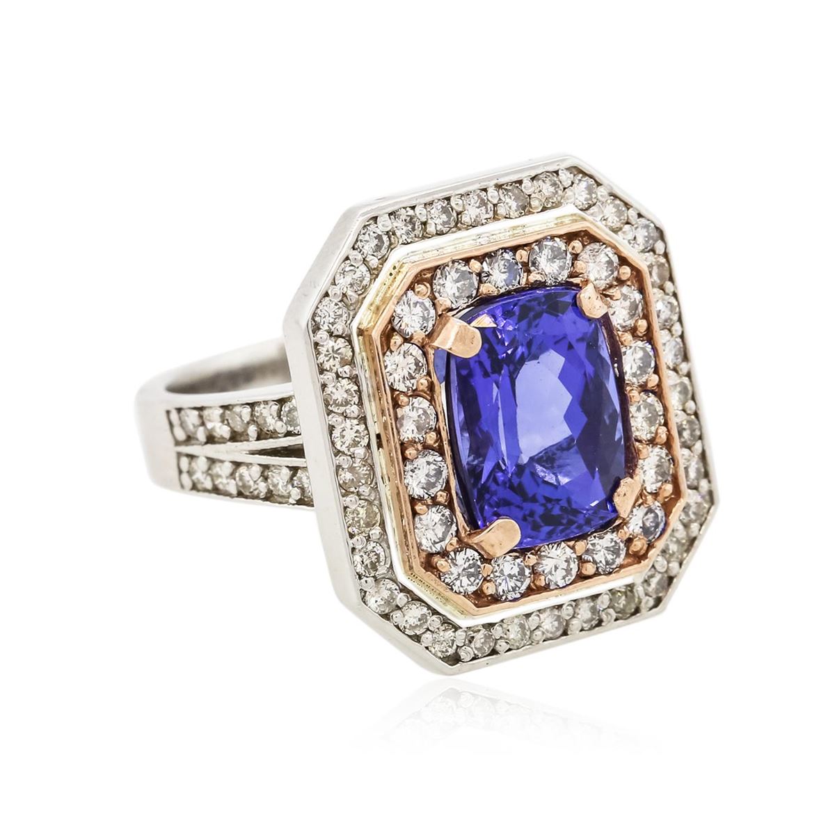 One electronically tested 14KT rose and white gold Ladies combination cast & assembled ring with a bright polish finish. Condition is new. Identified with markings of "14K". Containing: One prong set rectangular cushion modified brilliant cut natural tanzanite, measuring 10.20 x 8.49 x 6.30mm, approximate weight of 4.29ct., clarity is eye clean, type I, medium, moderately strong, violetish blue color, (GIA vB 5/4), cut is very good. Colored gemstones are presumed to have been subjected to commonly used color/clarity enhancement processes. Thirty-Five prong set round brilliant cut diamonds, measuring 1.30 - 1.30 x 0.78mm (depth est.) approximate. Total Weight of 35 Stones = 0.35ct. Clarity: I-1 to I-2. Color: I - J, Cut is Good. Eighteen prong set round brilliant cut diamonds, measuring 1.80 - 1.80 x 1.08mm (depth est.) approximate. Total Weight of 18 Stones = 0.38ct. Clarity: I-1 to I-2. Color: I - J, Cut is Good. Total Weight of Colored Stones 4.29ct. Total Weight of Diamonds 0.73ct. Total Weight of Ring 11.30 grams. GGL Appraised at $10,950.00.