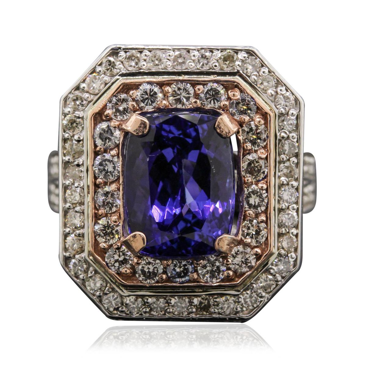 One electronically tested 14KT rose and white gold Ladies combination cast & assembled ring with a bright polish finish. Condition is new. Identified with markings of "14K". Containing: One prong set rectangular cushion modified brilliant cut natural tanzanite, measuring 10.20 x 8.49 x 6.30mm, approximate weight of 4.29ct., clarity is eye clean, type I, medium, moderately strong, violetish blue color, (GIA vB 5/4), cut is very good. Colored gemstones are presumed to have been subjected to commonly used color/clarity enhancement processes. Thirty-Five prong set round brilliant cut diamonds, measuring 1.30 - 1.30 x 0.78mm (depth est.) approximate. Total Weight of 35 Stones = 0.35ct. Clarity: I-1 to I-2. Color: I - J, Cut is Good. Eighteen prong set round brilliant cut diamonds, measuring 1.80 - 1.80 x 1.08mm (depth est.) approximate. Total Weight of 18 Stones = 0.38ct. Clarity: I-1 to I-2. Color: I - J, Cut is Good. Total Weight of Colored Stones 4.29ct. Total Weight of Diamonds 0.73ct. Total Weight of Ring 11.30 grams. GGL Appraised at $10,950.00.