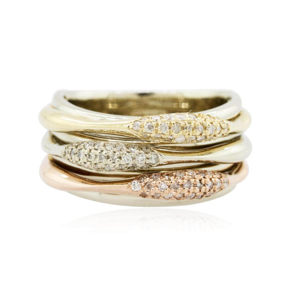 One electronically tested 14KT rose, yellow and white gold ladies combination cast & assembled diamond ring with a bright polish finish. Identified with markings of "14K". Condition is new. Containing: Seventy-Five prong set round brilliant cut diamonds, measuring 1.00 - 1.00 x 0.60mm (depth est.) approximate total weight of 75 Stones = 0.27ct. Clarity: I-1 to I-2. Color: I - J, Cut is Good. All diamonds are graded in the mounting, unless otherwise stated. Total Weight of Diamonds 0.27ct. Total Weight of Ring 9.10 grams. GGL Appraised at $3,500.00.