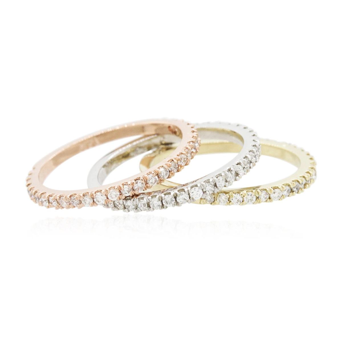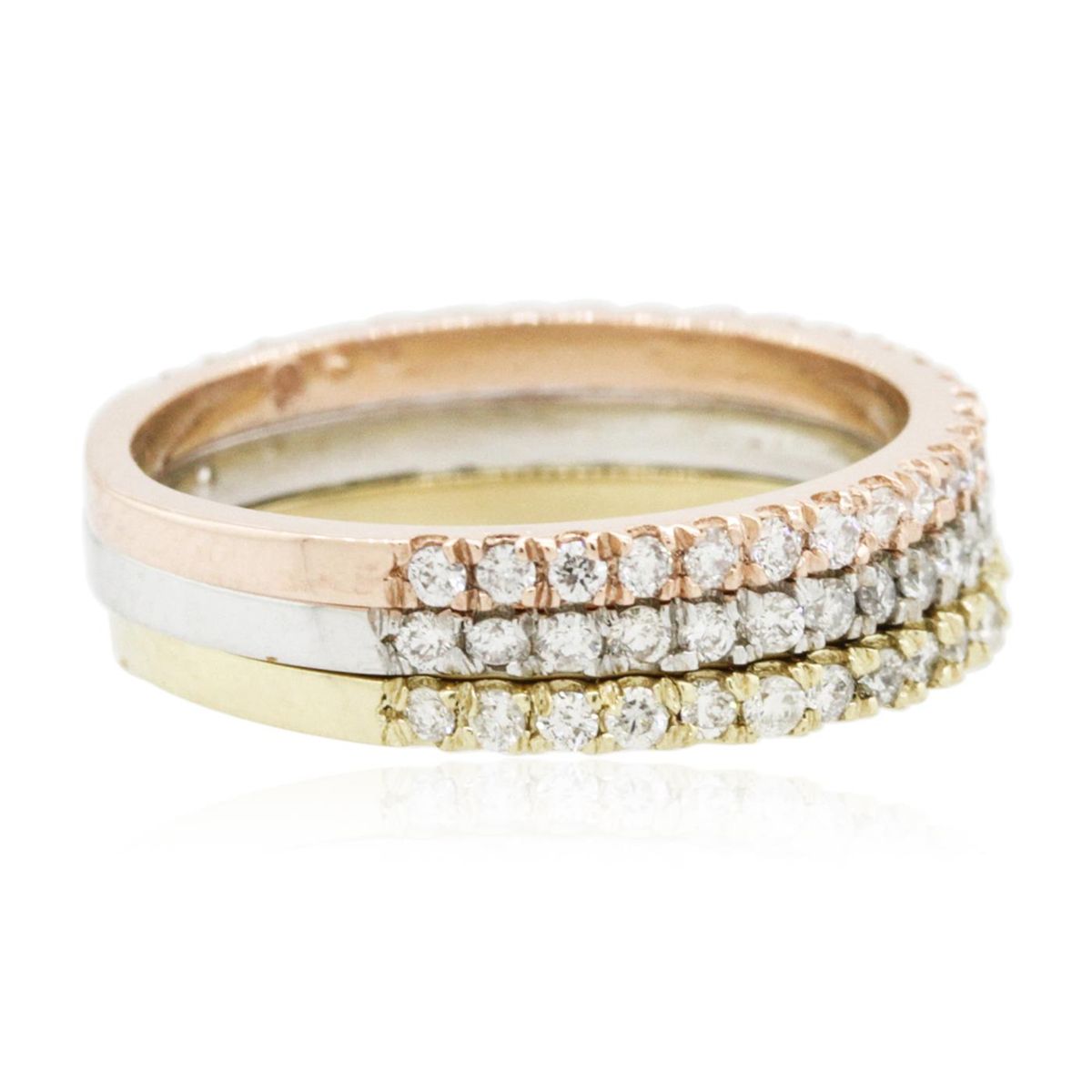 Three electronically tested 14KT rose, yellow and white gold ladies cast diamond wedding bands with a bright polish finish. Identified with markings of "14K". Condition is new. Containing: Eighty-Seven prong set round brilliant cut diamonds, measuring 1.30 - 1.30 x 0.78mm (depth est.) approximate total weight of 87 Stones = 0.70ct. Clarity: SI-2 to I-1. Color: I - J, Cut is Good. All diamonds are graded in the mounting, unless otherwise stated. Total Weight of Diamonds 0.70ct. Total Weight of Wedding Bands 4.00 grams. GGL Appraised at $3,135.00.