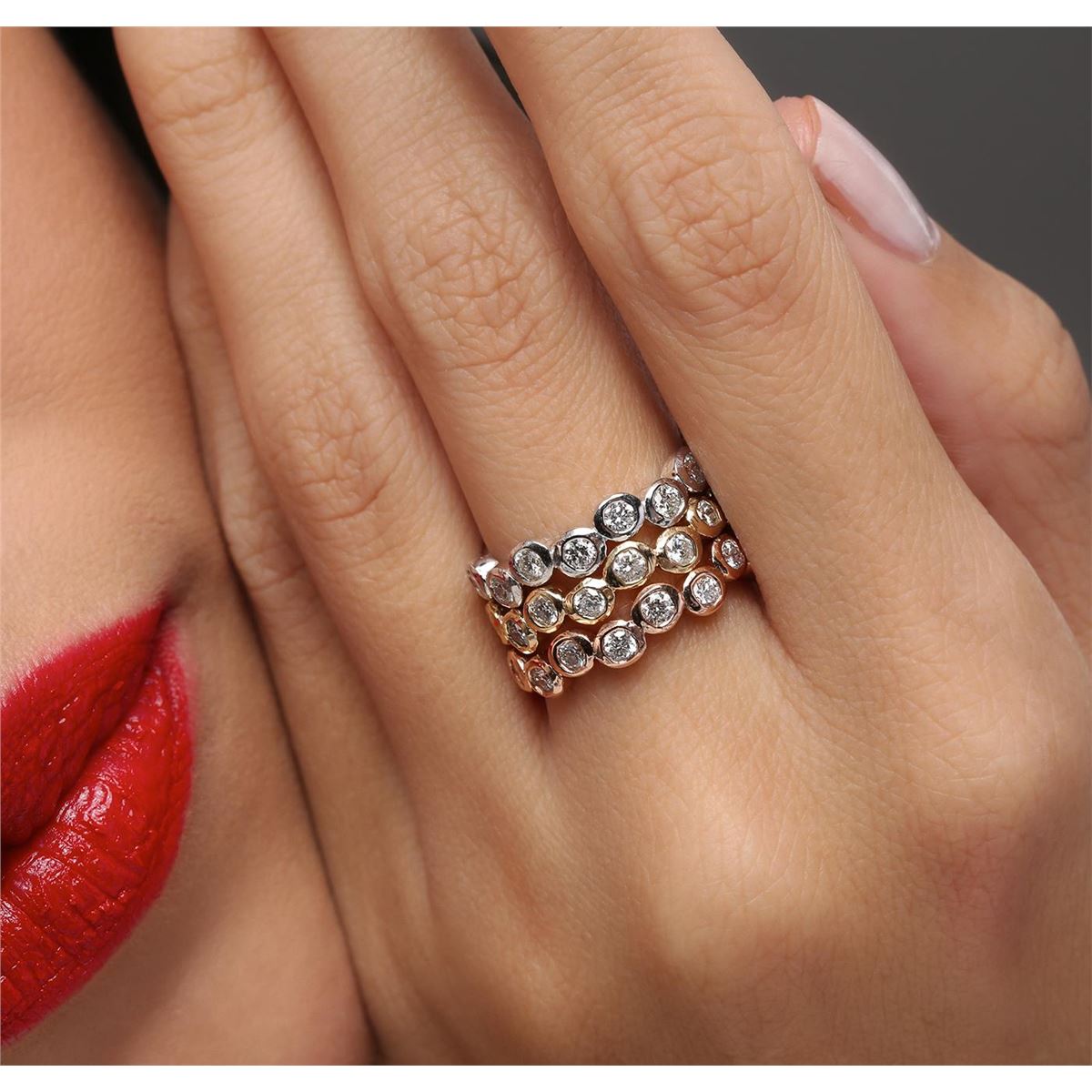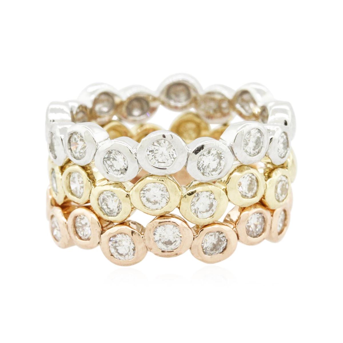 Three electronically tested 14KT rose, yellow and white gold ladies cast diamond wedding bands with a bright polish finish. Identified with markings of "14K". Condition is new. Containing: Twenty-Four bezel set round brilliant cut diamonds, measuring 2.50 - 2.50 x 1.50mm (depth est.) approximate total weight of 24 Stones = 1.37ct. Clarity: SI-1 to SI-2. Color: I - J, Cut is Good. All diamonds are graded in the mounting, unless otherwise stated. Total Weight of Diamonds 1.37ct. Total Weight of Wedding Bands 8.90 grams. GGL Appraised at $5,555.00.