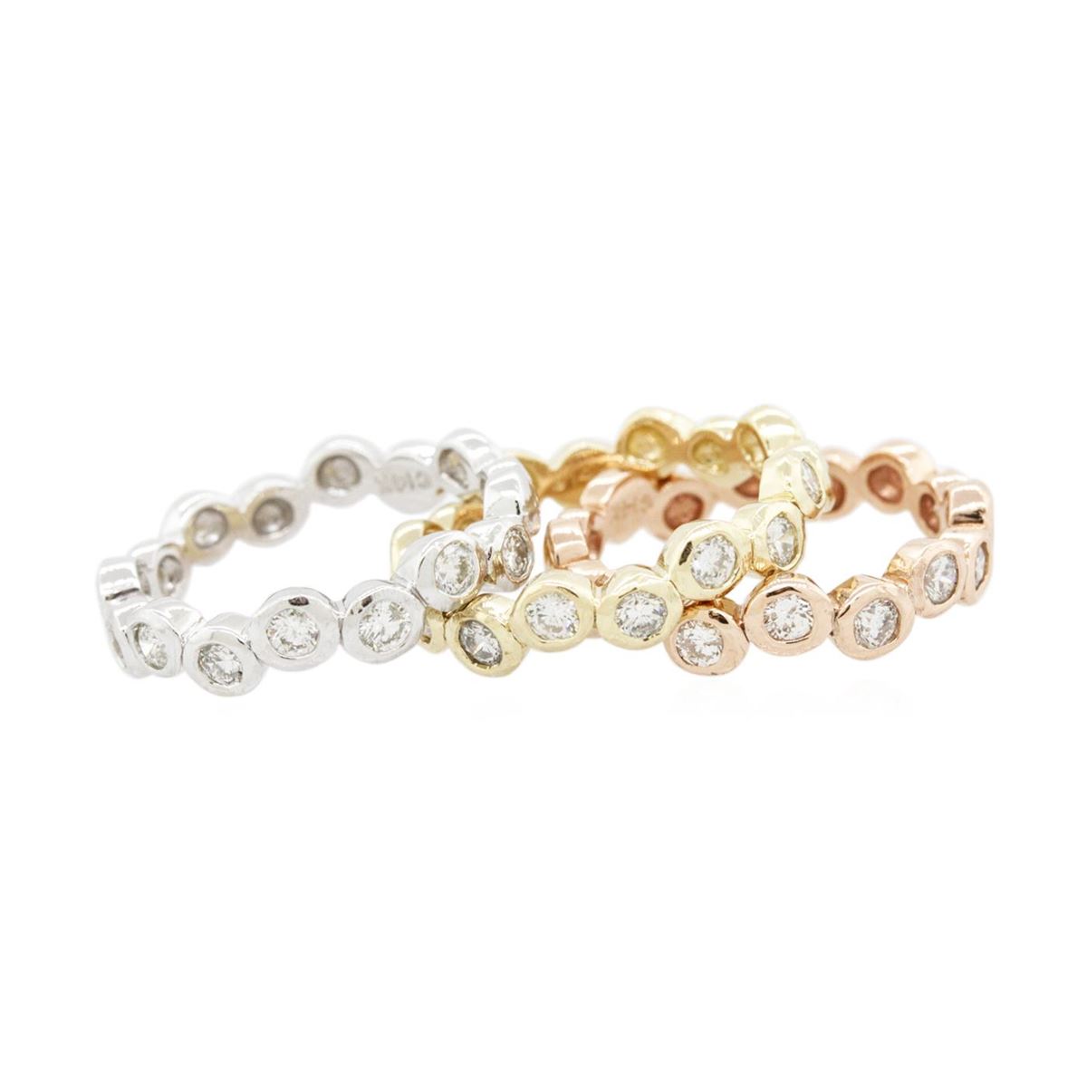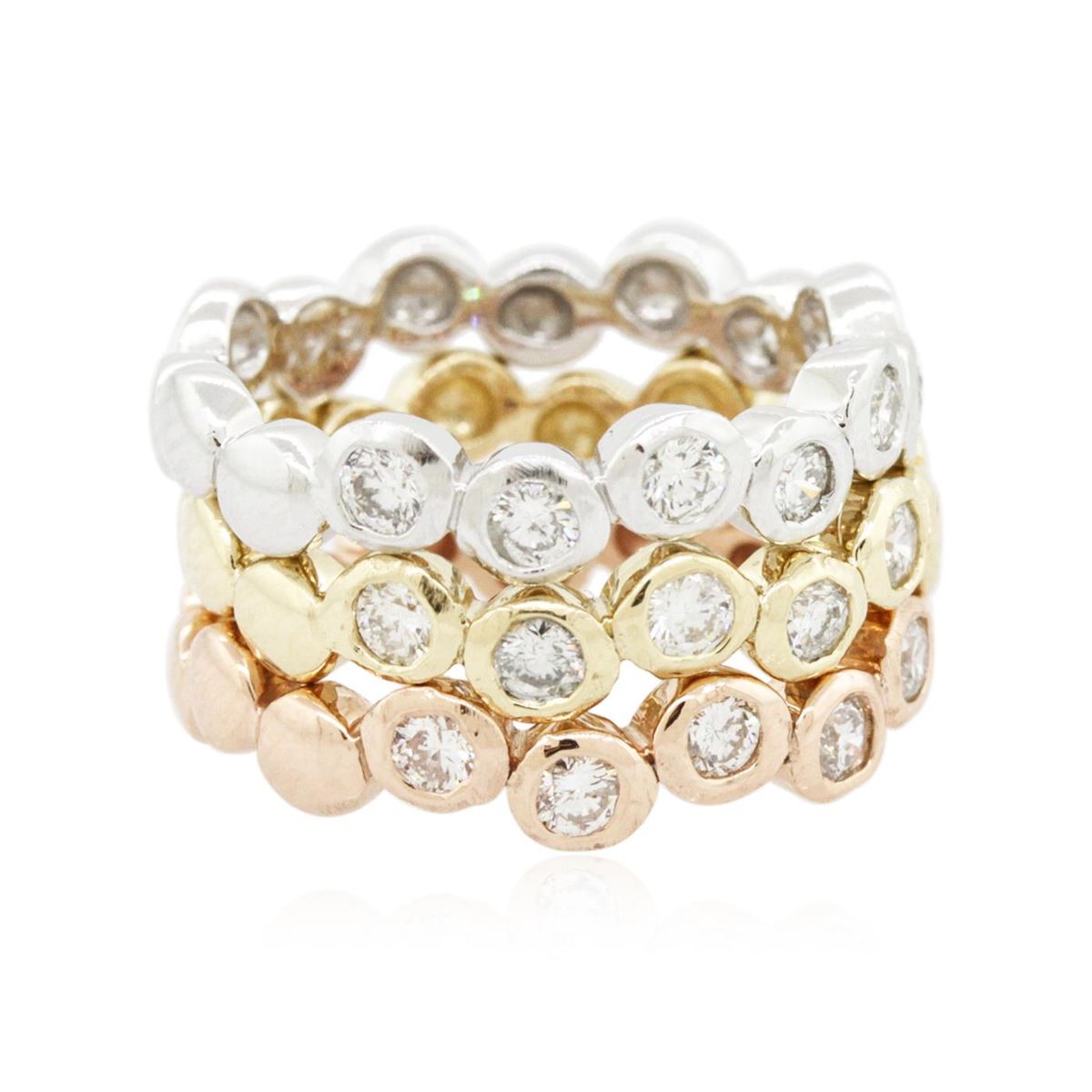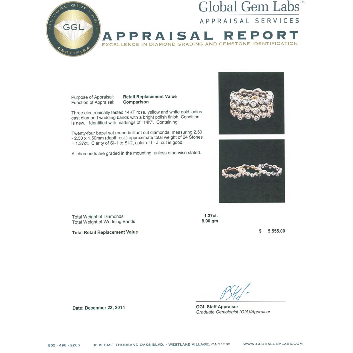 Three electronically tested 14KT rose, yellow and white gold ladies cast diamond wedding bands with a bright polish finish. Identified with markings of "14K". Condition is new. Containing: Twenty-Four bezel set round brilliant cut diamonds, measuring 2.50 - 2.50 x 1.50mm (depth est.) approximate total weight of 24 Stones = 1.37ct. Clarity: SI-1 to SI-2. Color: I - J, Cut is Good. All diamonds are graded in the mounting, unless otherwise stated. Total Weight of Diamonds 1.37ct. Total Weight of Wedding Bands 8.90 grams. GGL Appraised at $5,555.00.