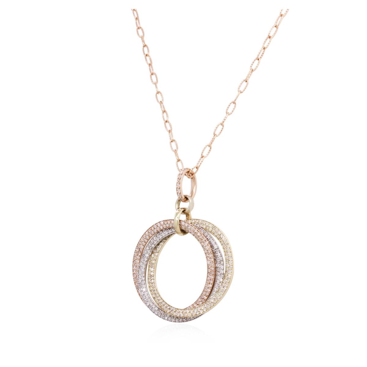 One electronically tested 14KT rose, yellow and white gold ladies combination cast & assembled diamond pendant & chain 18.0" long, figaro link with a lobster claw clasp with a bright polish finish. Identified with markings of "K14". Condition is new. Containing: Four Hundred Eight prong set round brilliant cut diamonds, measuring 1.00 - 1.00 x 0.60mm (depth est.) approximate total weight of 408 Stones = 1.47ct. Clarity: I-2 to I-3. Color: J - K. Eight prong set round brilliant cut diamonds, measuring 1.30 - 1.30 x 0.78mm (depth est.) approximate total weight of 8 Stones = 0.06ct. Clarity: I-2 to I-3. Color: I - J. All diamonds are graded in the mounting, unless otherwise stated. Total Weight of Diamonds 1.53ct. Total Weight of Pendant & Chain 15.70 grams. GGL Appraised at $8,975.00.
