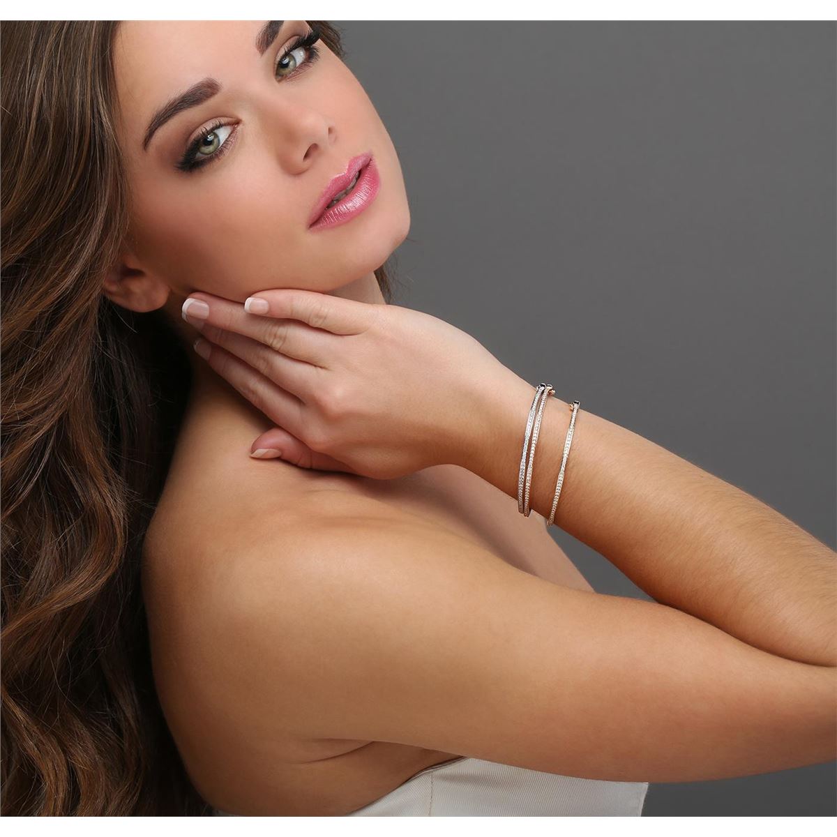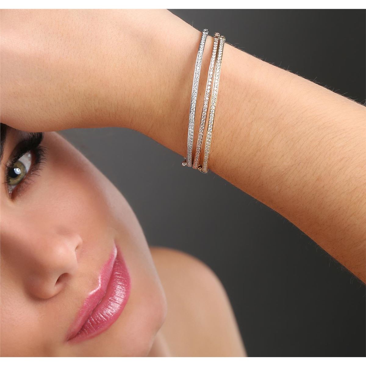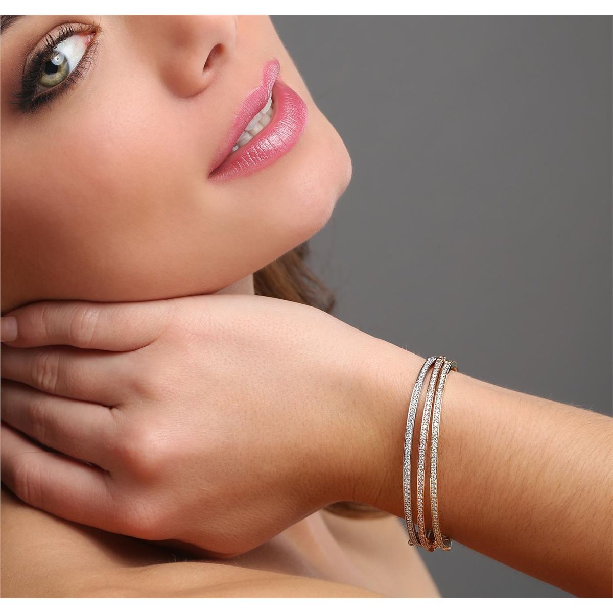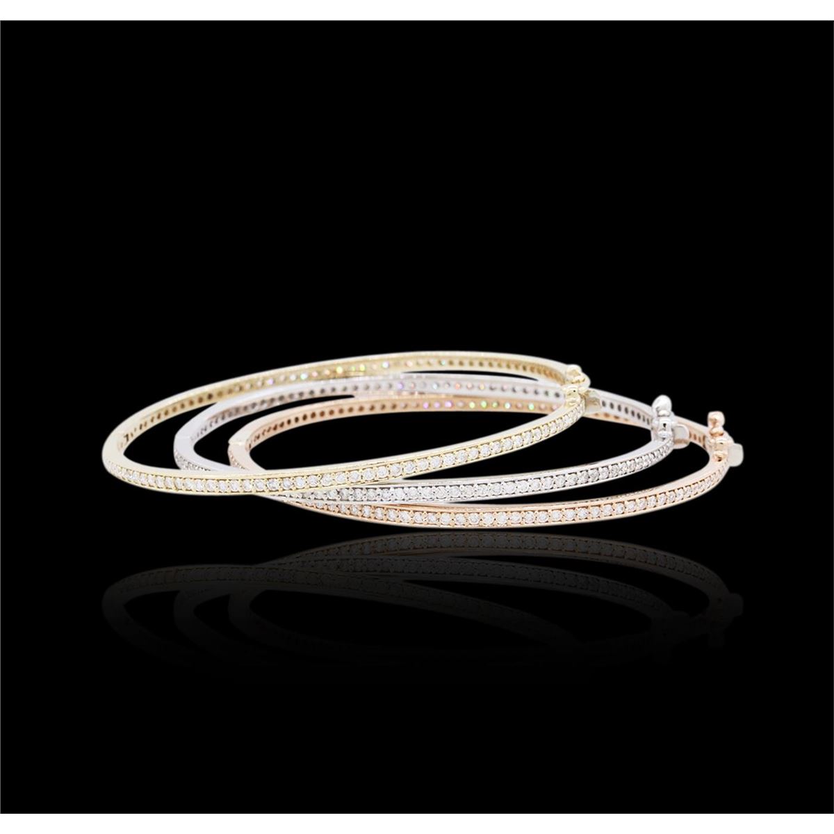 Three electronically tested 14KT yellow, white, and rose gold ladies cast diamond bangle bracelets with a hidden box clasp with safety closer with a bright polish finish. Condition is new. Inside diameter is 2-1/4 inches wide. Containing: Three hundred thirty prong set round brilliant cut diamonds, measuring 1.30 - 1.30 x 0.78mm (depth est.) approximate total weight of 330 Stones = 2.64ct. Clarity: SI-2 to I-2. Color: H - I, Cut is Good. All diamonds are graded in the mounting, unless otherwise stated. Total Weight of Diamonds 2.64ct. Total Weight of Bangle Bracelets 24.70 grams. GGL Appraised at $11,925.00.