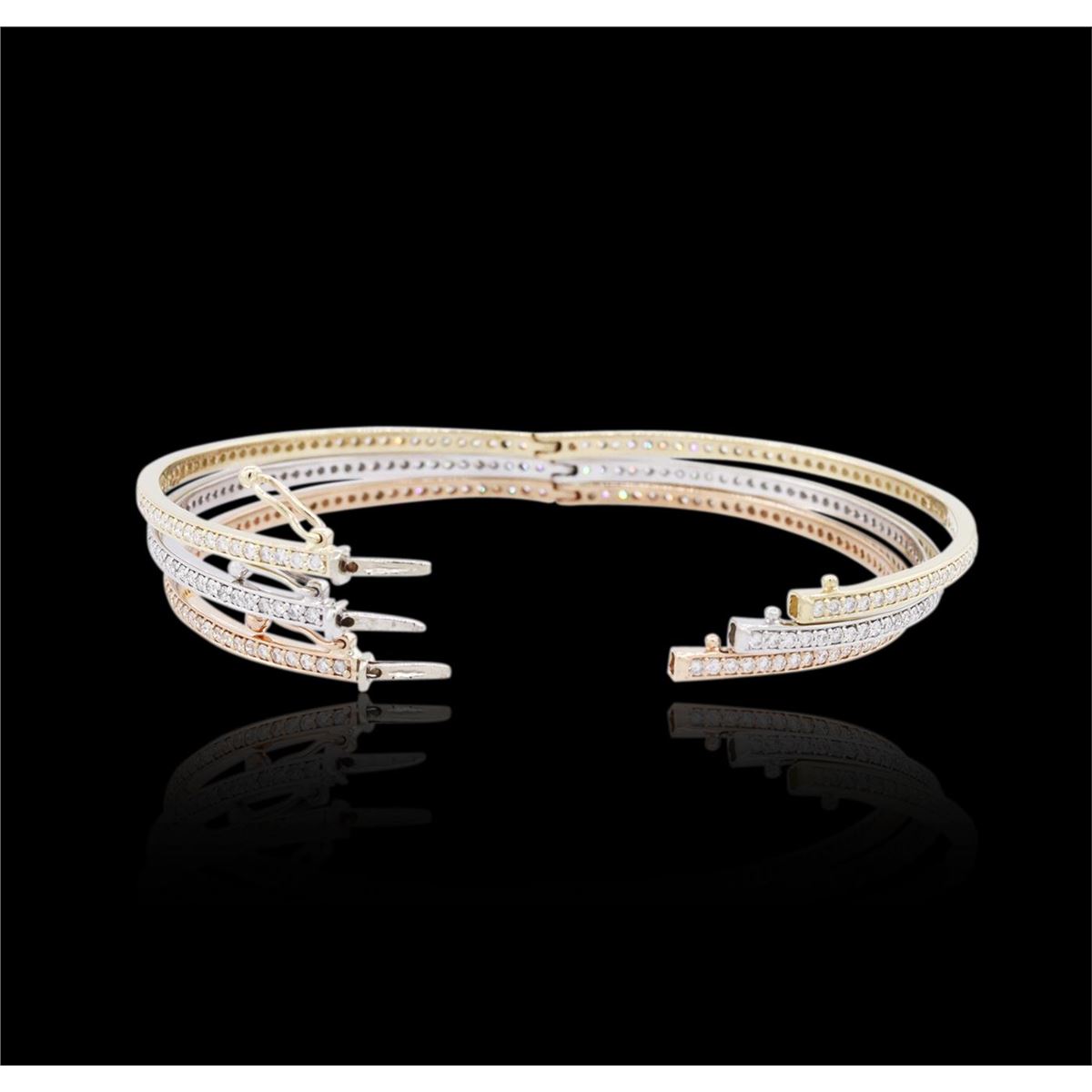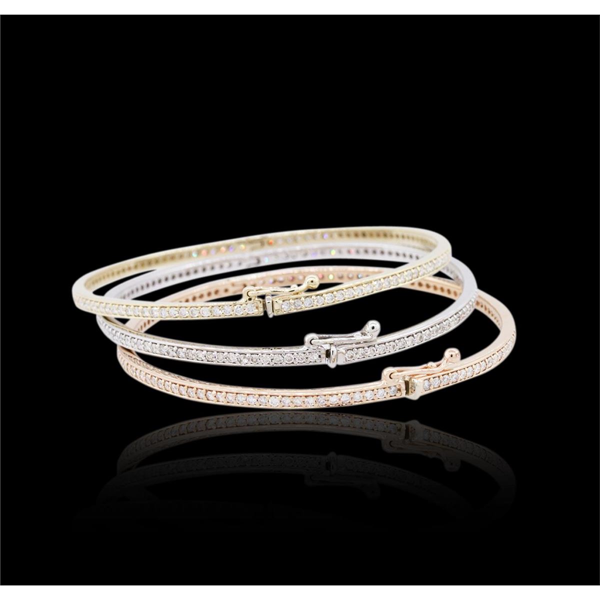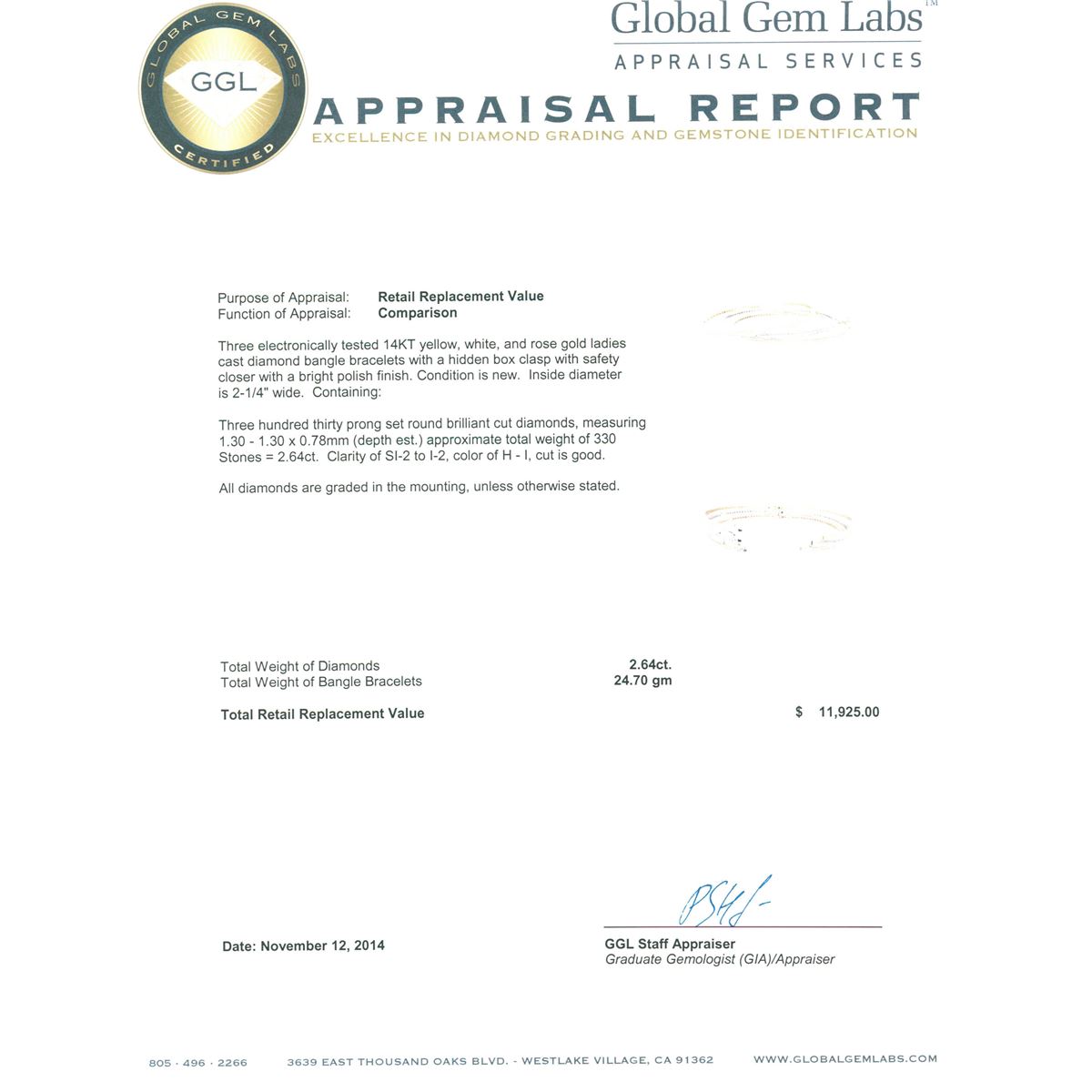 Three electronically tested 14KT yellow, white, and rose gold ladies cast diamond bangle bracelets with a hidden box clasp with safety closer with a bright polish finish. Condition is new. Inside diameter is 2-1/4 inches wide. Containing: Three hundred thirty prong set round brilliant cut diamonds, measuring 1.30 - 1.30 x 0.78mm (depth est.) approximate total weight of 330 Stones = 2.64ct. Clarity: SI-2 to I-2. Color: H - I, Cut is Good. All diamonds are graded in the mounting, unless otherwise stated. Total Weight of Diamonds 2.64ct. Total Weight of Bangle Bracelets 24.70 grams. GGL Appraised at $11,925.00.