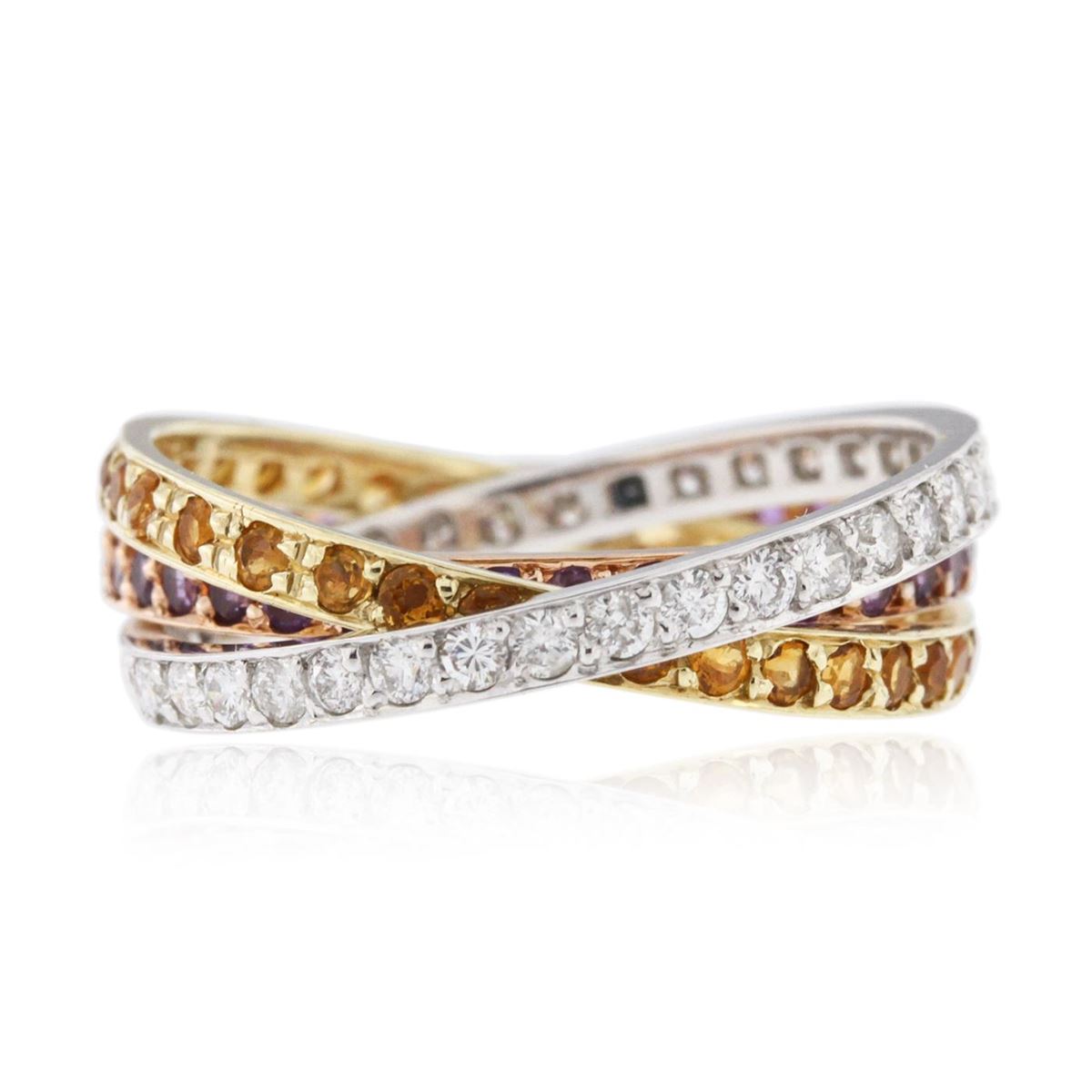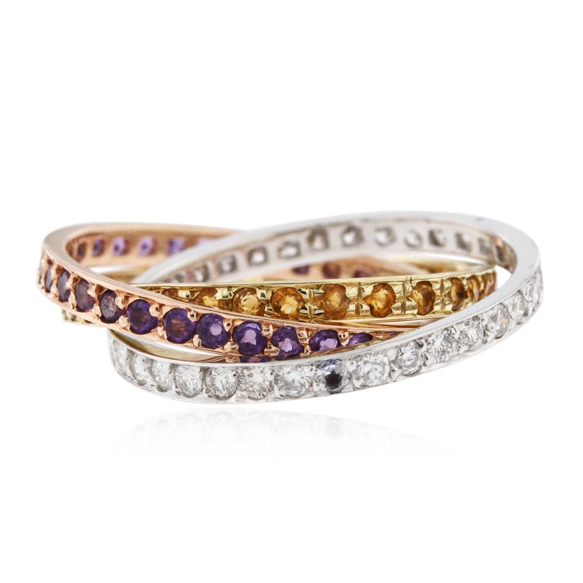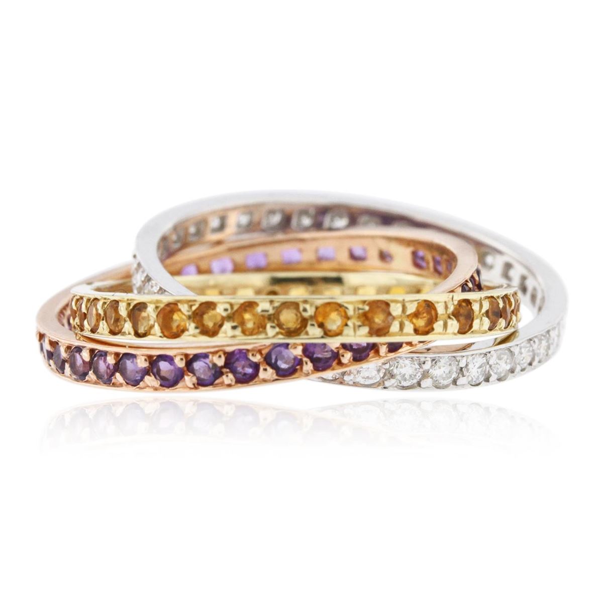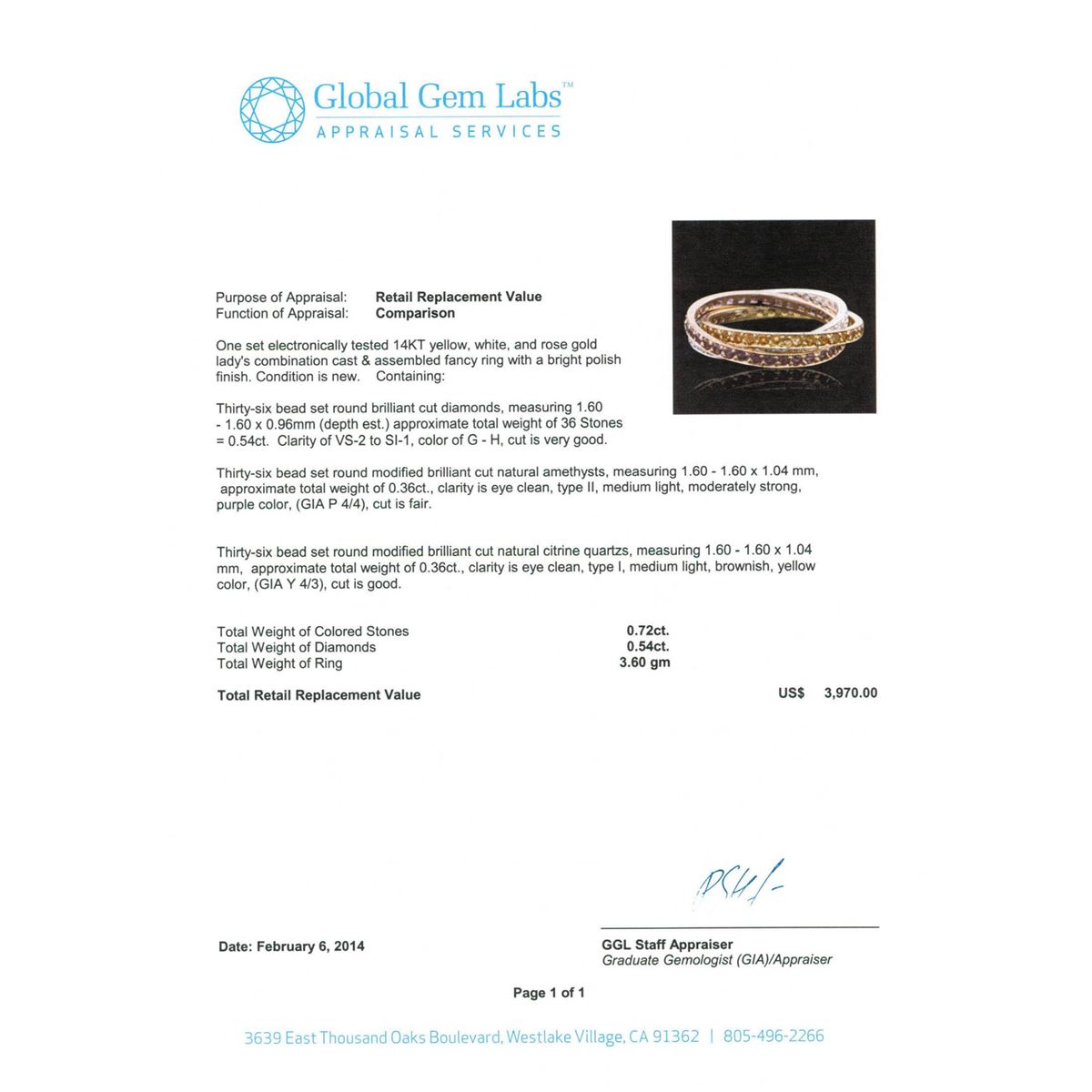 One set electronically tested 14KT yellow, white, and rose gold Ladies combination cast & assembled fancy ring with a bright polish finish. Condition is new. Containing: Thirty-Six bead set round brilliant cut diamonds, measuring 1.60 - 1.60 x 0.96mm (depth est.) approximate total weight of 36 Stones = 0.54ct. Clarity of VS-2 to SI-1, Color of G - H, Cut is Very Good. Thirty-six bead set round modified brilliant cut natural amethysts, measuring 1.60 - 1.60 x 1.04 mm, approximate total weight of 0.36ct., clarity is eye clean, type II, medium light, moderately strong, purple color, (GIA P 4/4), cut is fair. Thirty-six bead set round modified brilliant cut natural citrine quartz's, measuring 1.60 - 1.60 x 1.04 mm, approximate total weight of 0.36ct., clarity is eye clean, type I, medium light, brownish, yellow color, (GIA Y 4/3), cut is good. Total Weight of Colored Stones 0.72 ct. Total Weight of Diamonds 0.54ct. Total Weight of Ring 3.60gm. GGL Appraised at $3,970.00.