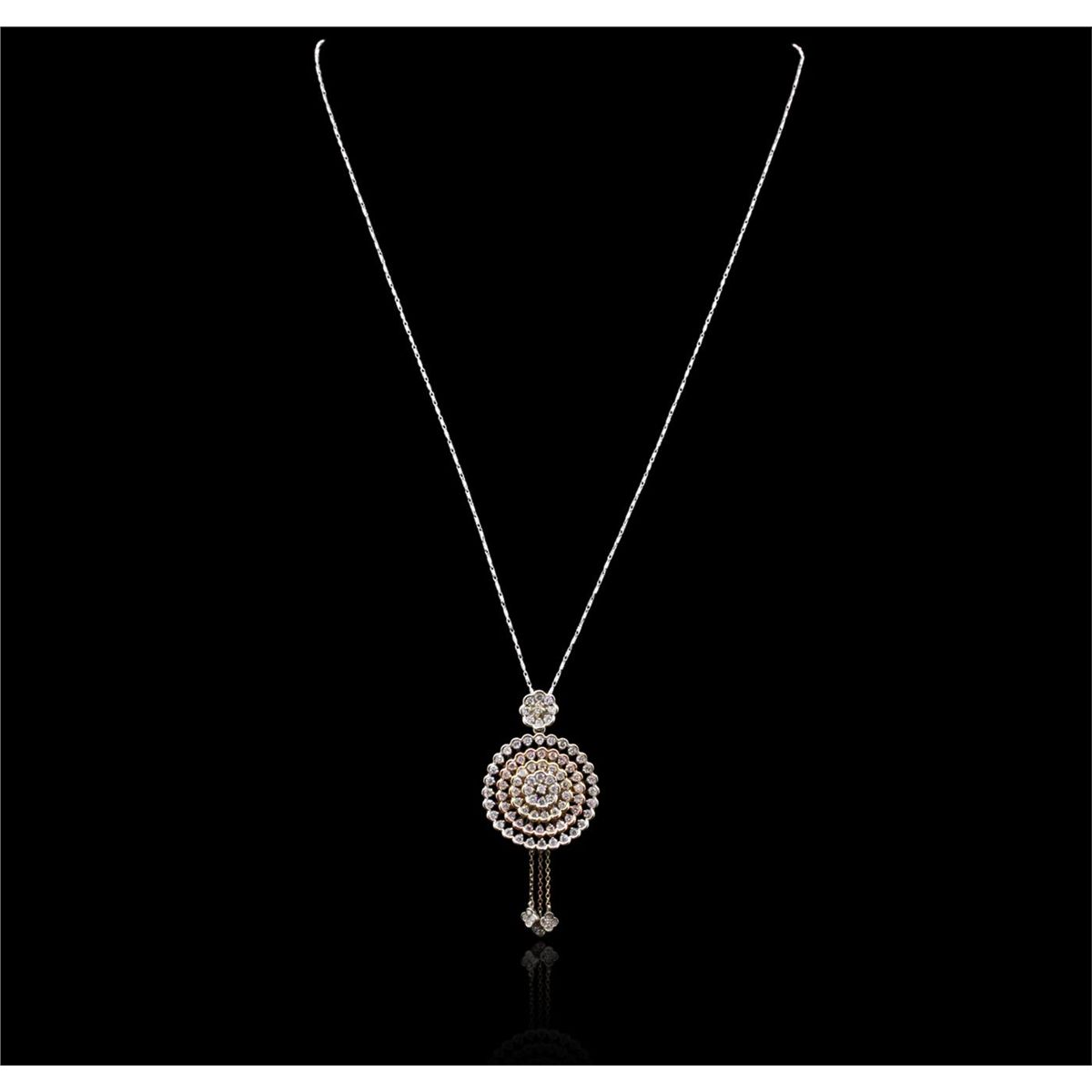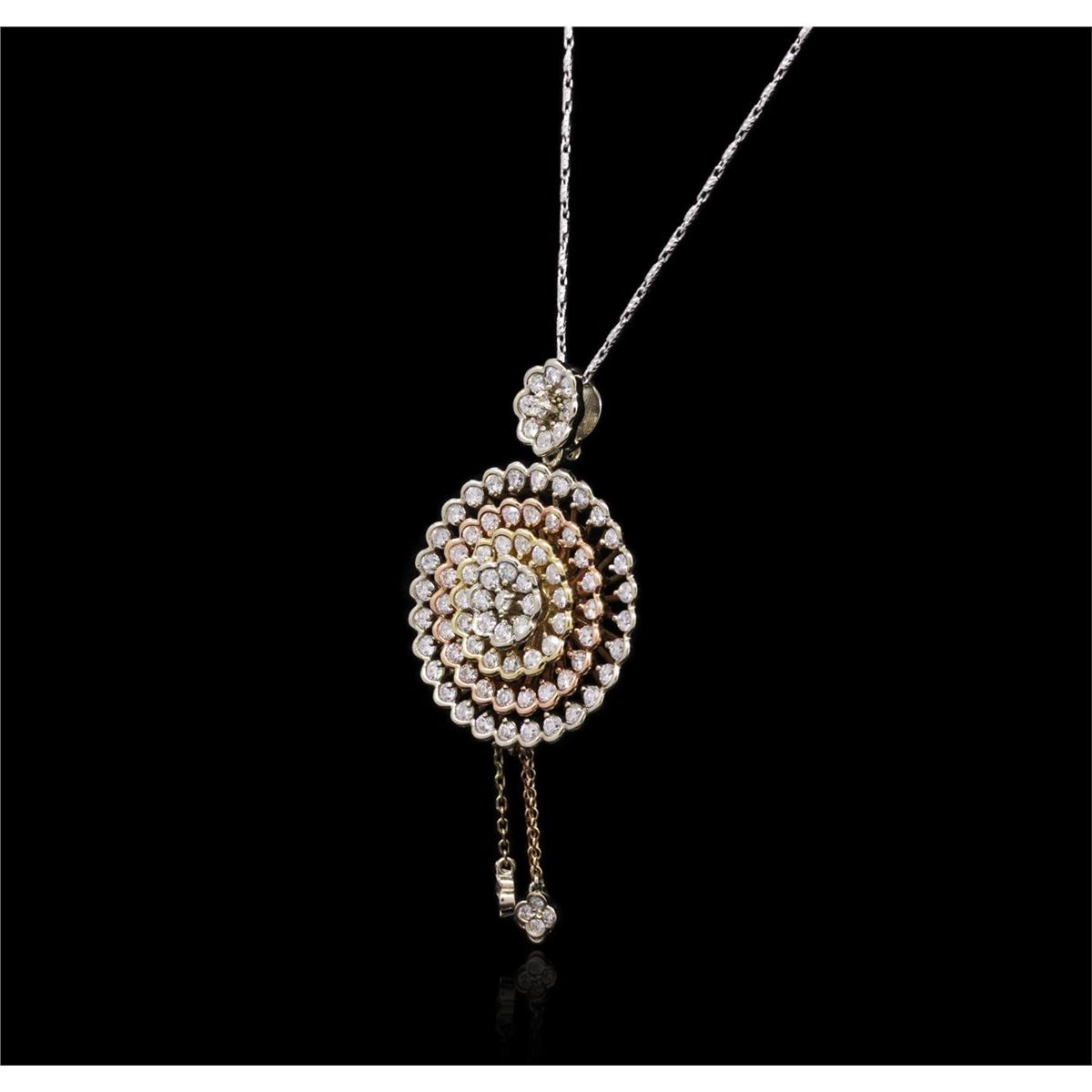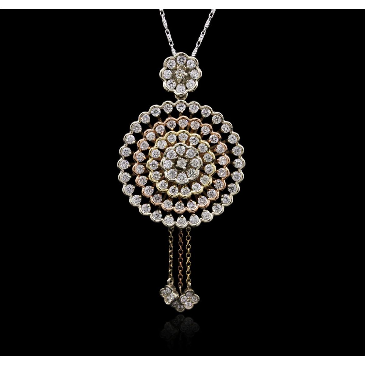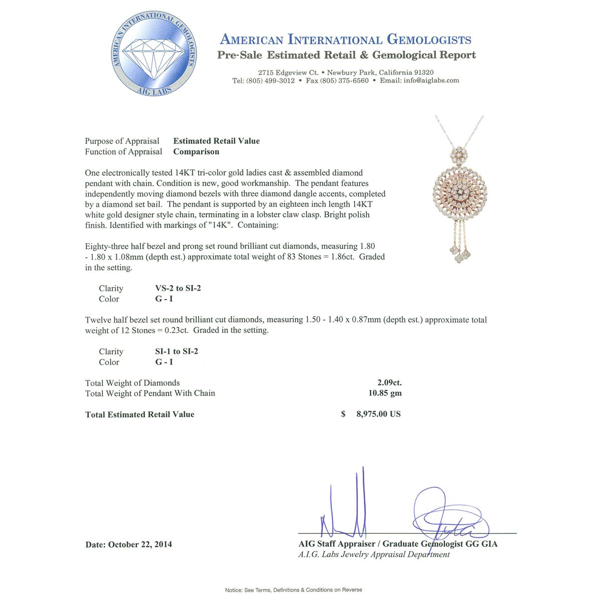 One electronically tested 14KT tri-color gold ladies cast & assembled diamond pendant with chain. The pendant features independently moving diamond bezels with three diamond dangle accents, completed by a diamond set bail. The pendant is supported by an eighteen inch length 14KT white gold designer style chain, terminating in a lobster claw clasp. Bright polish finish. Identified with markings of 14K. Condition is new, good workmanship. Containing: Eighty-Three half bezel and prong set round brilliant cut diamonds, measuring 1.80 - 1.80 x 1.08mm (depth est.) approximate total weight of 83 Stones = 1.86ct. Graded in the setting. Clarity: VS-2 to SI-2. Color: G - I Twelve half bezel set round brilliant cut diamonds, measuring 1.50 - 1.40 x 0.87mm (depth est.) approximate total weight of 12 Stones = 0.23ct. Graded in the setting. Clarity: SI-1 to SI-2. Color: G - I. Total Weight of Diamonds 2.09ct. Total Weight of Pendant With Chain 10.85 grams. AIG Appraised at $8,975.00.
