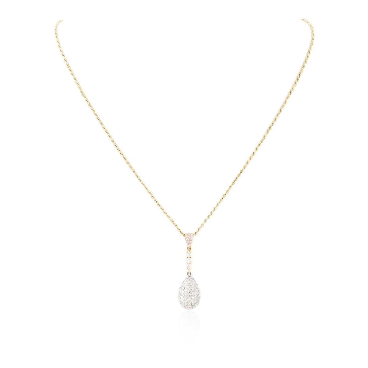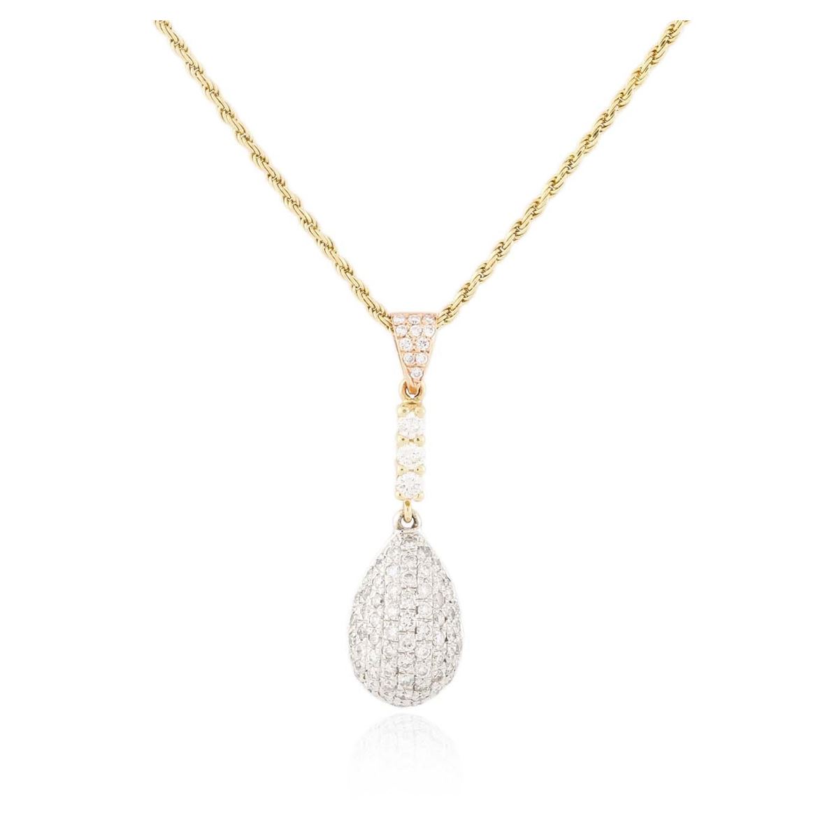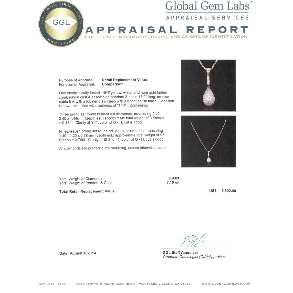 One electronically tested 14KT yellow, white, and rose gold ladies combination cast & assembled pendant & chain 15.0" long, medium cable link with a lobster claw clasp with a bright polish finish. Condition is new. Identified with markings of "14K". Containing: Three prong set round brilliant cut diamonds, measuring 2.40 - 2.40 x 1.44mm (depth est.) approximate. Total Weight of 3 Stones = 0.15ct. Clarity: SI-1. Color: G - H, Cut is Good. Ninety-Seven prong set round brilliant cut diamonds, measuring 1.40 - 1.20 x 0.78mm (depth est.) approximate. Total Weight of 97 Stones = 0.78ct. Clarity: SI-2 to I-1. Color: G - H, Cut is Good. All diamonds are graded in the mounting, unless otherwise stated. Total Weight of Diamonds 0.93ct. Total Weight of Pendant & Chain 7.10 grams. GGL Appraised at $5,690.00.