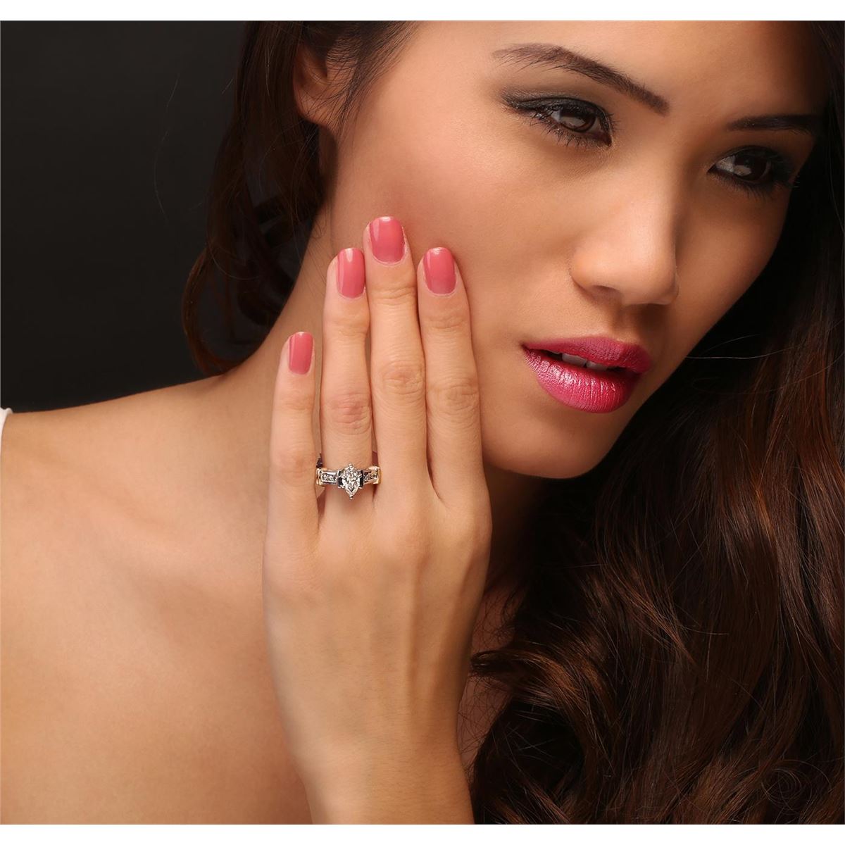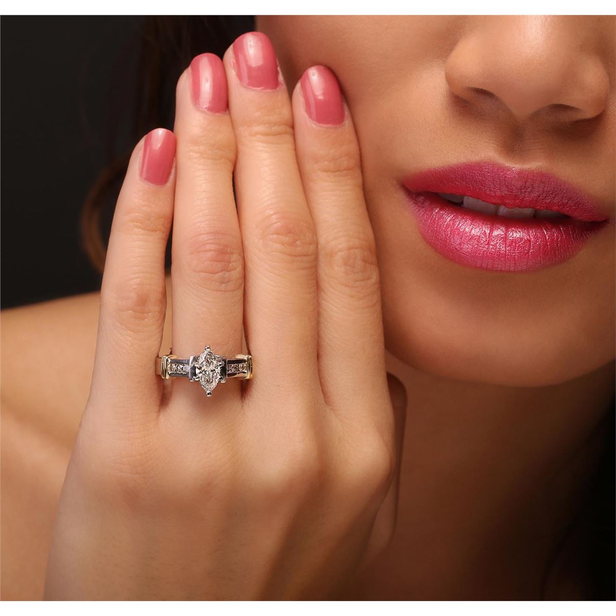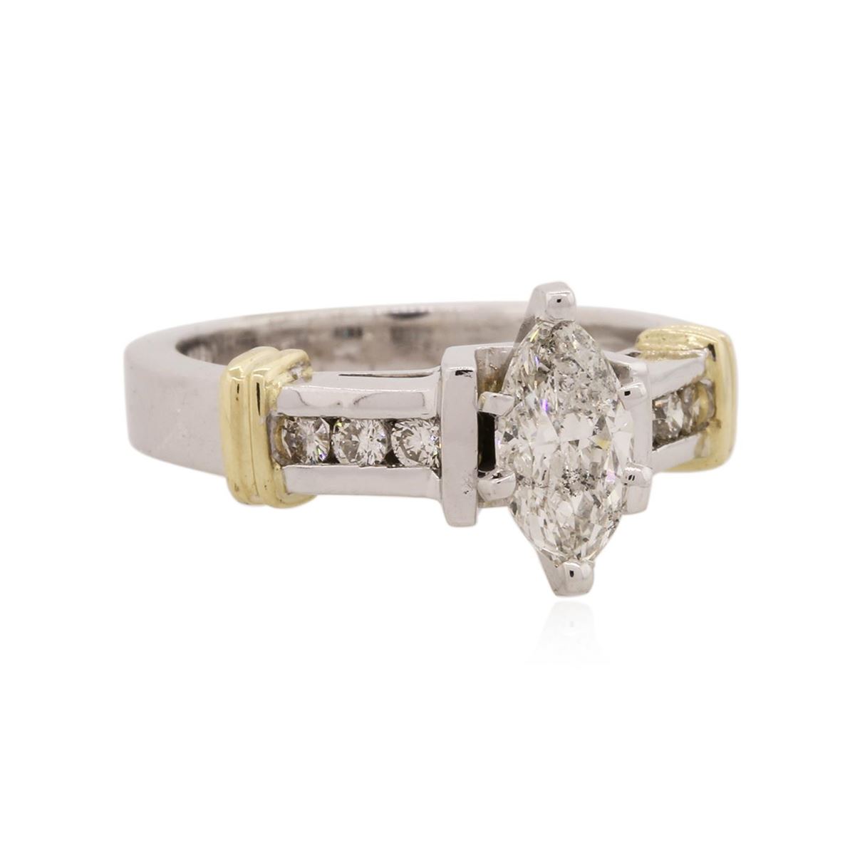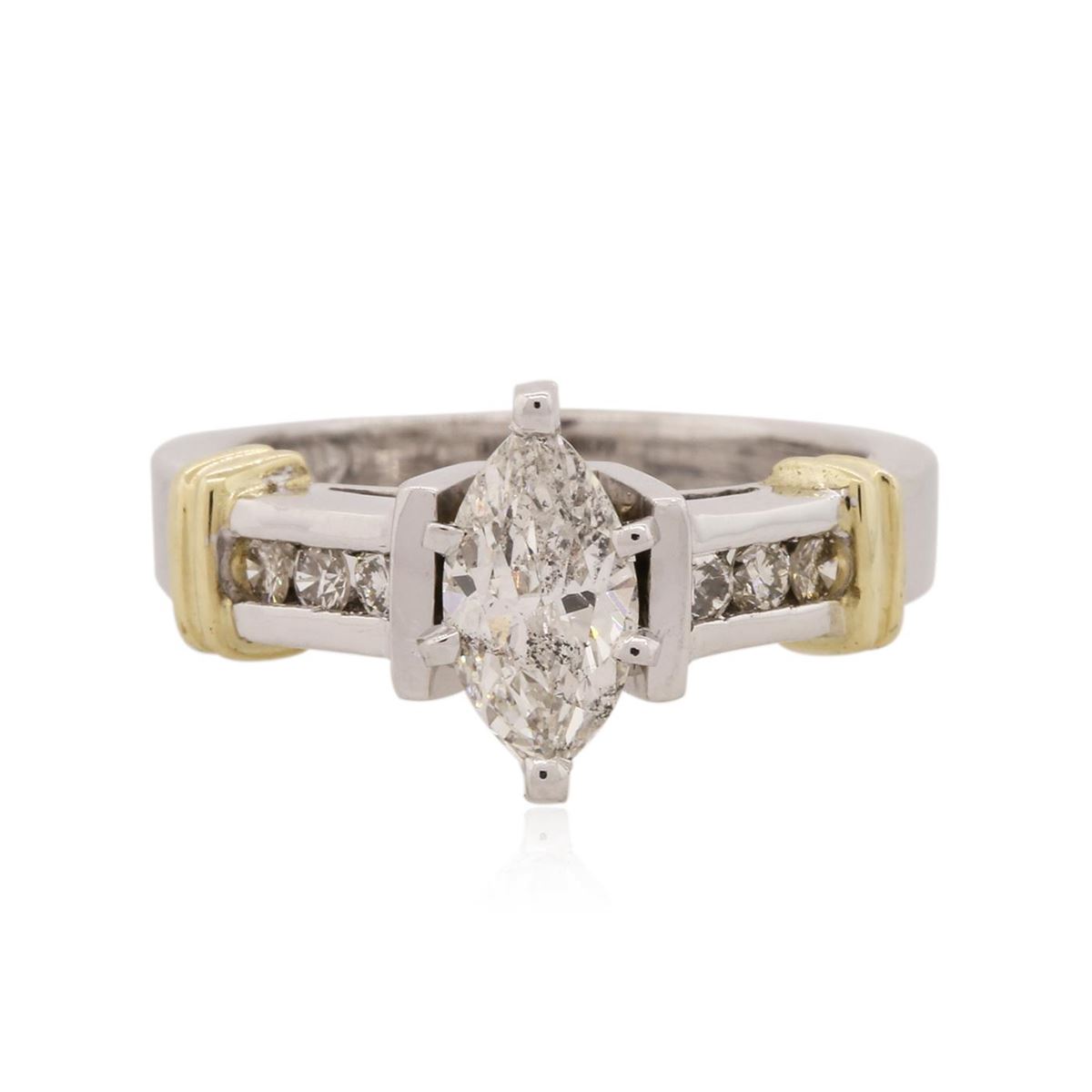 One electronically tested 14KT white and yellow gold Ladies combination cast & assembled engagement ring with a bright polish finish. Condition is new. Identified with markings of "14K". Containing: One prong set marquise shaped cut diamond, measuring 9.50 x 5.10 x 3.22mm (depth est.) approximate weight of 0.91ct. Clarity: I-1. Color: I, Cut is Good. Six channel set round brilliant cut diamonds, measuring 2.00 - 2.00 x 1.20mm (depth est.) approximate total weight of 6 Stones = 0.18ct. Clarity: SI-1 to SI-2. Color: J - K, Cut is Good. All diamonds are graded in the mounting, unless otherwise stated. Total Weight of Diamonds 1.08ct. Total Weight of Engagement Ring 7.00 grams. GGL Appraised at $8,015.00.