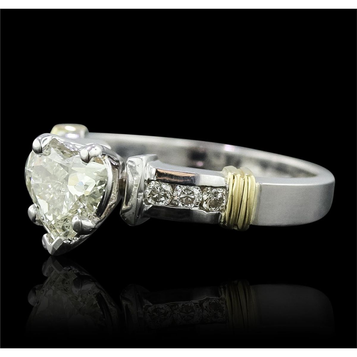 One electronically tested 14KT white and yellow gold Ladies combination cast & assembled engagement ring with a bright polish finish. Condition is new. Identified with markings of "14K". Containing: One prong set heart shaped cut diamond, measuring 7.40 x 6.50 x 4.10mm (depth est.) approximate weight of 1.16ct. Clarity: SI-1. Color: L, Cut is Good. Six channel set round brilliant cut diamonds, measuring 1.80 - 1.80 x 1.08mm (depth est.) approximate total weight of 6 Stones = 0.13ct. Clarity: SI-2. Color: I - J, Cut is Good. All diamonds are graded in the mounting, unless otherwise stated. Total Weight of Diamonds 1.29ct. Total Weight of Engagement Ring 4.30 grams. GGL Appraised at $9,815.00.