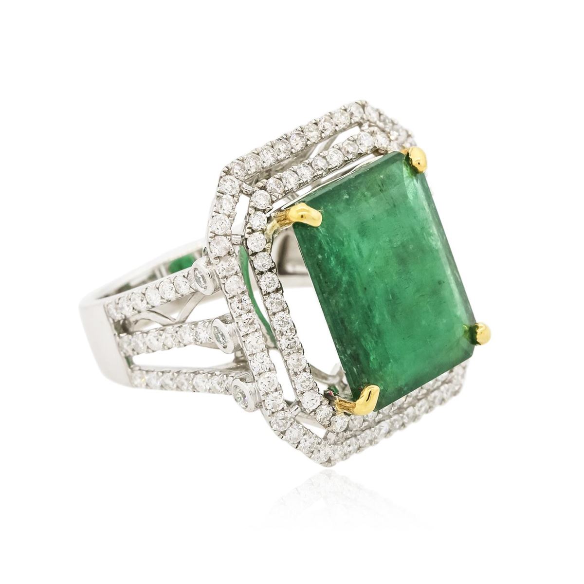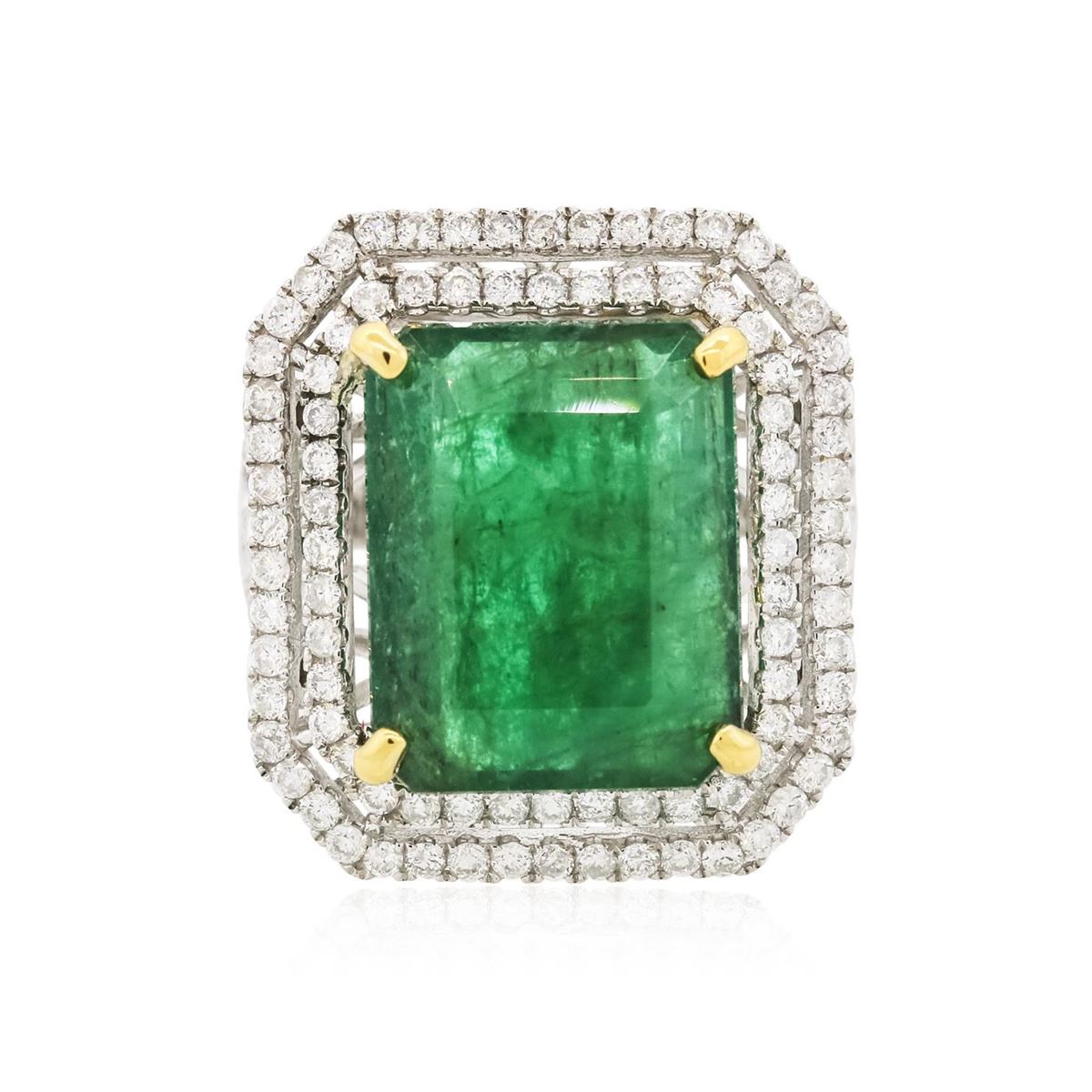 One electronically tested 14KT white and yellow gold Ladies combination cast & assembled ring with a bright polish finish. Condition is new. Identified with markings of "14K". Containing: One prong set emerald standard step cut natural emerald, measuring 15.74 x 12.51 x 7.50mm, approximate weight of 10.85ct., clarity is heavily included, type III, medium, moderately strong, green color, (GIA G 5/4), cut is good. Colored gemstones are presumed to have been subjected to commonly used color/clarity enhancement processes. One Hundred Thirty-Eight prong set round brilliant cut diamonds, measuring 1.30 - 1.30 x 0.78mm (depth est.) approximate. Total Weight of 138 Stones = 1.10ct. Clarity: I-1 to I-1. Color: I - J, Cut is Good. Total Weight of Colored Stones 10.85ct. Total Weight of Diamonds 1.10ct. Total Weight of Ring 10.79 grams. GGL Appraised at $15,925.00.
