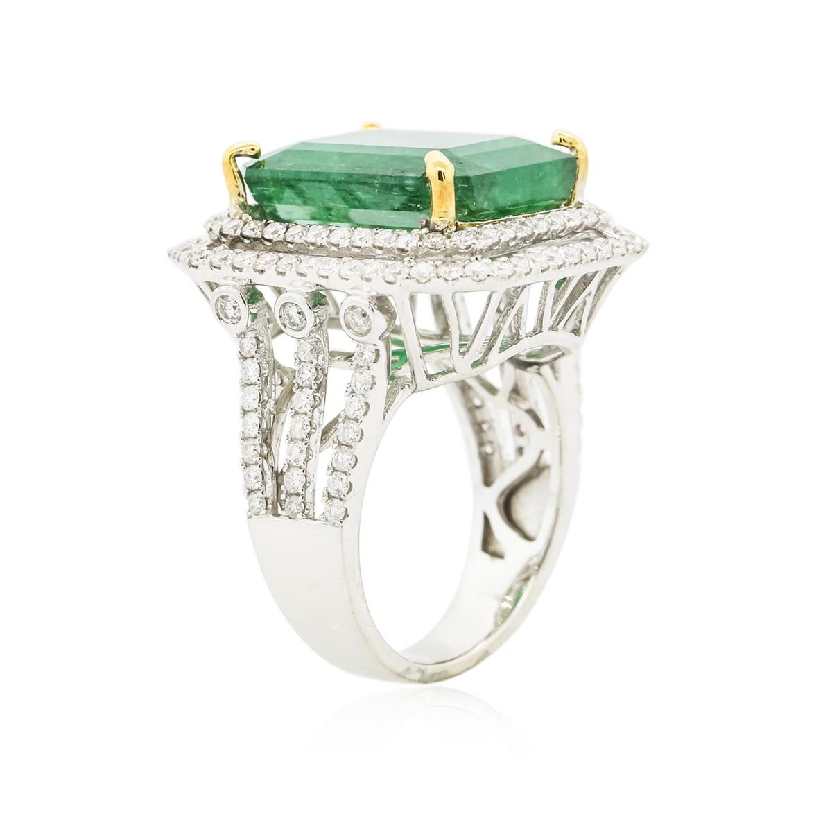 One electronically tested 14KT white and yellow gold Ladies combination cast & assembled ring with a bright polish finish. Condition is new. Identified with markings of "14K". Containing: One prong set emerald standard step cut natural emerald, measuring 15.74 x 12.51 x 7.50mm, approximate weight of 10.85ct., clarity is heavily included, type III, medium, moderately strong, green color, (GIA G 5/4), cut is good. Colored gemstones are presumed to have been subjected to commonly used color/clarity enhancement processes. One Hundred Thirty-Eight prong set round brilliant cut diamonds, measuring 1.30 - 1.30 x 0.78mm (depth est.) approximate. Total Weight of 138 Stones = 1.10ct. Clarity: I-1 to I-1. Color: I - J, Cut is Good. Total Weight of Colored Stones 10.85ct. Total Weight of Diamonds 1.10ct. Total Weight of Ring 10.79 grams. GGL Appraised at $15,925.00.