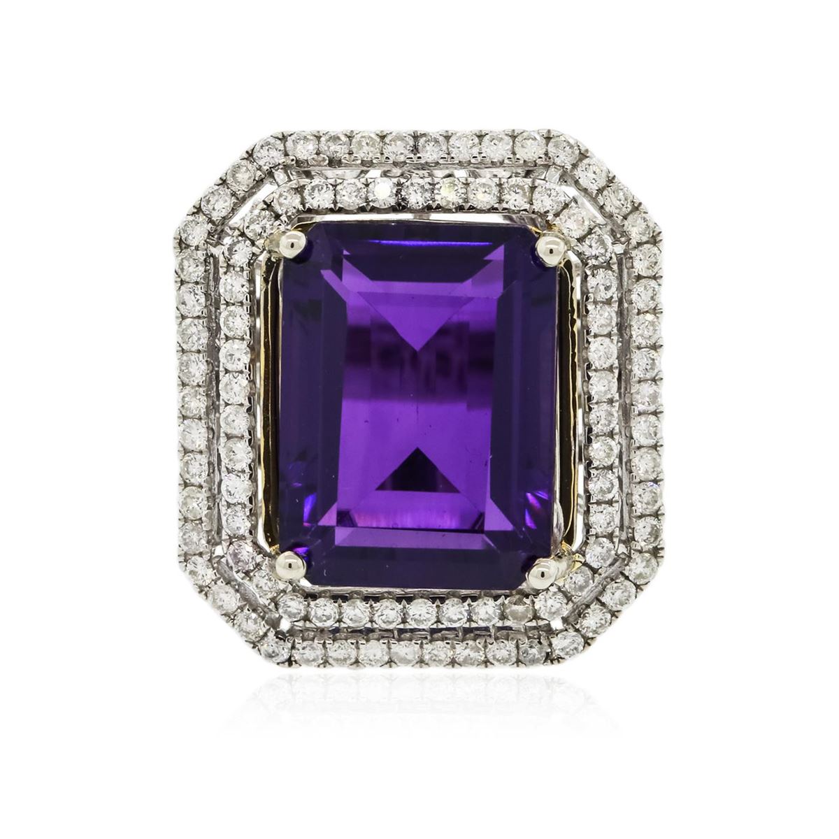 One electronically tested 14KT white and yellow gold Ladies combination cast & assembled ring with a bright polish finish. Condition is new. Identified with markings of "14K". Containing: One prong set emerald standard step cut natural amethyst, measuring 16.00 x 12.00 x 8.20mm, approximate weight of 11.31ct., clarity is eye clean, type II, medium dark, moderately strong, purple color, (GIA P 6/4), cut is good. Colored gemstones are presumed to have been subjected to commonly used color/clarity enhancement processes. Ninety-Two prong set round brilliant cut diamonds, measuring 1.50 - 1.30 x 0.84mm (depth est.) approximate. Total Weight of 92 Stones = 0.92ct. Clarity: I-1 to I-2. Color: I - J, Cut is Good. Total Weight of Colored Stones 11.31ct. Total Weight of Diamonds 0.92ct. Total Weight of Ring 12.20 grams. GGL Appraised at $8,755.00.