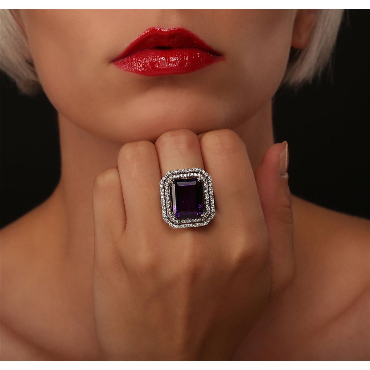 One electronically tested 14KT white and yellow gold Ladies combination cast & assembled ring with a bright polish finish. Condition is new. Identified with markings of "14K". Containing: One prong set emerald standard step cut natural amethyst, measuring 16.00 x 12.00 x 8.20mm, approximate weight of 11.31ct., clarity is eye clean, type II, medium dark, moderately strong, purple color, (GIA P 6/4), cut is good. Colored gemstones are presumed to have been subjected to commonly used color/clarity enhancement processes. Ninety-Two prong set round brilliant cut diamonds, measuring 1.50 - 1.30 x 0.84mm (depth est.) approximate. Total Weight of 92 Stones = 0.92ct. Clarity: I-1 to I-2. Color: I - J, Cut is Good. Total Weight of Colored Stones 11.31ct. Total Weight of Diamonds 0.92ct. Total Weight of Ring 12.20 grams. GGL Appraised at $8,755.00.