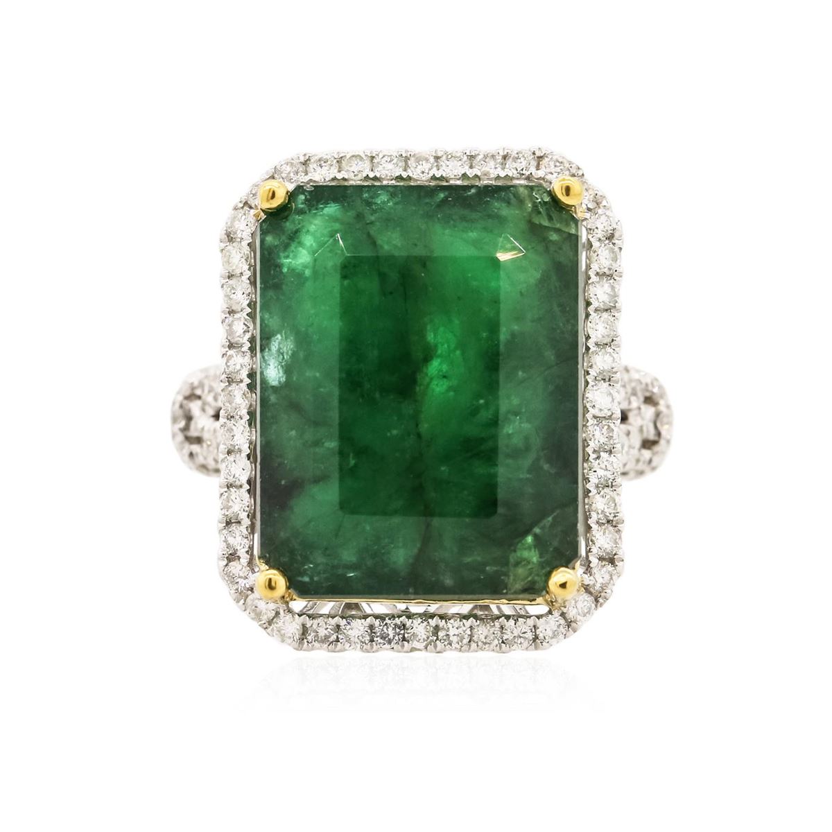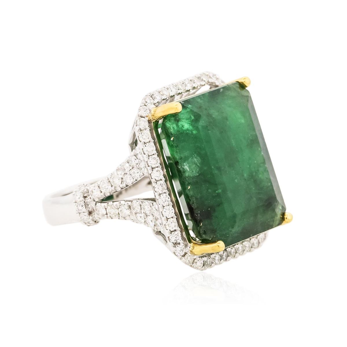 One electronically tested 14KT white and yellow gold Ladies combination cast & assembled ring with a bright polish finish. Condition is new. Identified with markings of "14K". Containing: One prong set emerald standard step cut natural emerald, measuring 17.91 x 13.88 x 9.03mm, approximate weight of 16.49ct., clarity is severely included, type III, medium, moderately strong, green color, (GIA G 5/4), cut is good. Colored gemstones are presumed to have been subjected to commonly used enhancement processes. All diamonds and colored gemstones are graded in the mounting, unless otherwise stated. Eighty-Six prong set round brilliant cut diamonds, measuring 1.30 - 1.30 x 0.78mm (depth est.) approximate total weight of 86 Stones = 0.75ct. Clarity: I-1 to I-2. Color: I - J, Cut is Good. Total Weight of Colored Stones 16.49ct. Total Weight of Diamonds 0.75ct. Total Weight of Ring 10.70 grams. GGL Appraised at $18,190.00.