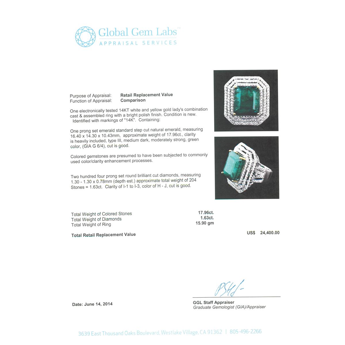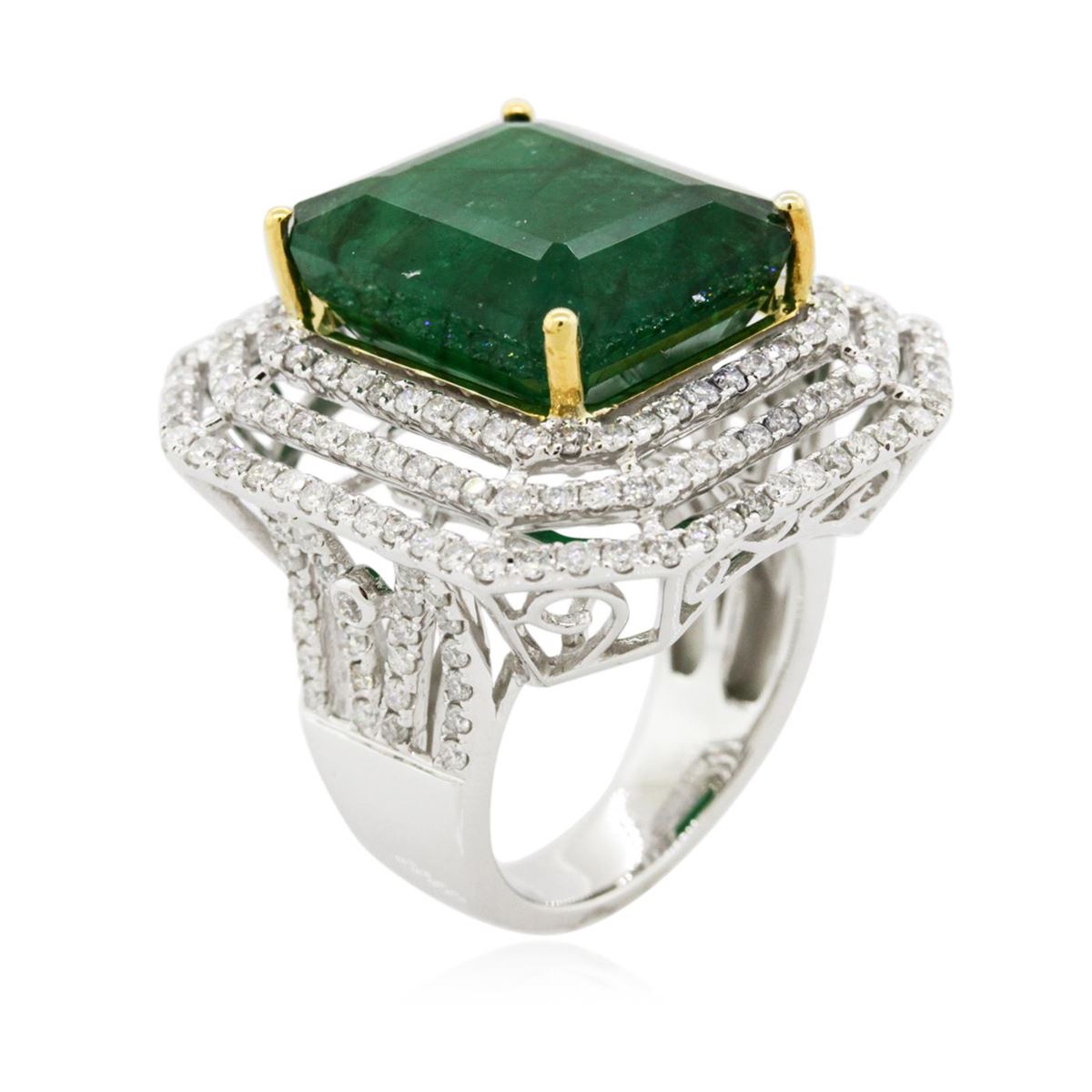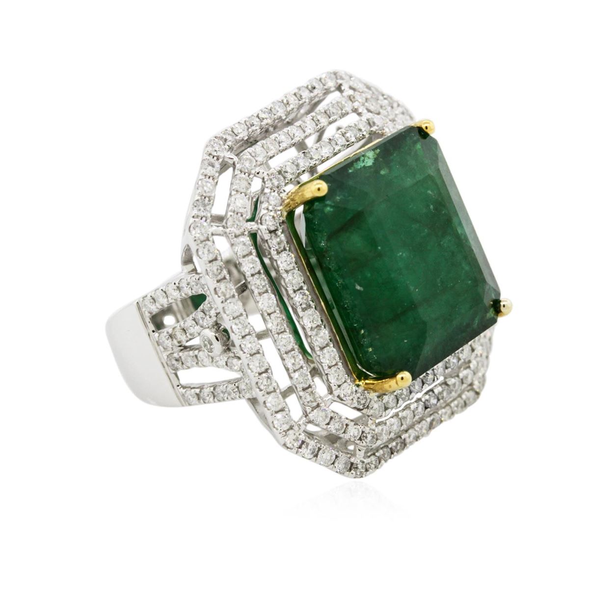 One electronically tested 14KT white and yellow gold Ladies combination cast & assembled ring with a bright polish finish. Condition is new. Identified with markings of "14K". Containing: One prong set emerald standard step cut natural emerald, measuring 16.40 x 14.30 x 10.43mm, approximate weight of 17.96ct., clarity is heavily included, type III, medium dark, moderately strong, green color, (GIA G 6/4), cut is good. Colored gemstones are presumed to have been subjected to commonly used color/clarity enhancement processes. Two Hundred Four prong set round brilliant cut diamonds, measuring 1.30 - 1.30 x 0.78mm (depth est.) approximate. Total Weight of 204 Stones = 1.63ct. Clarity: I-1 to I-3. Color: H - J, Cut is Good. Total Weight of Colored Stones 17.96ct. Total Weight of Diamonds 1.63ct. Total Weight of Ring 15.90 grams. GGL Appraised at $24,400.00.