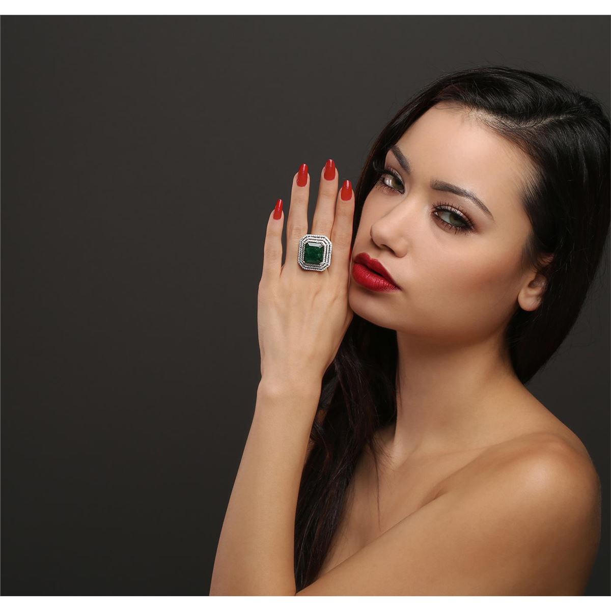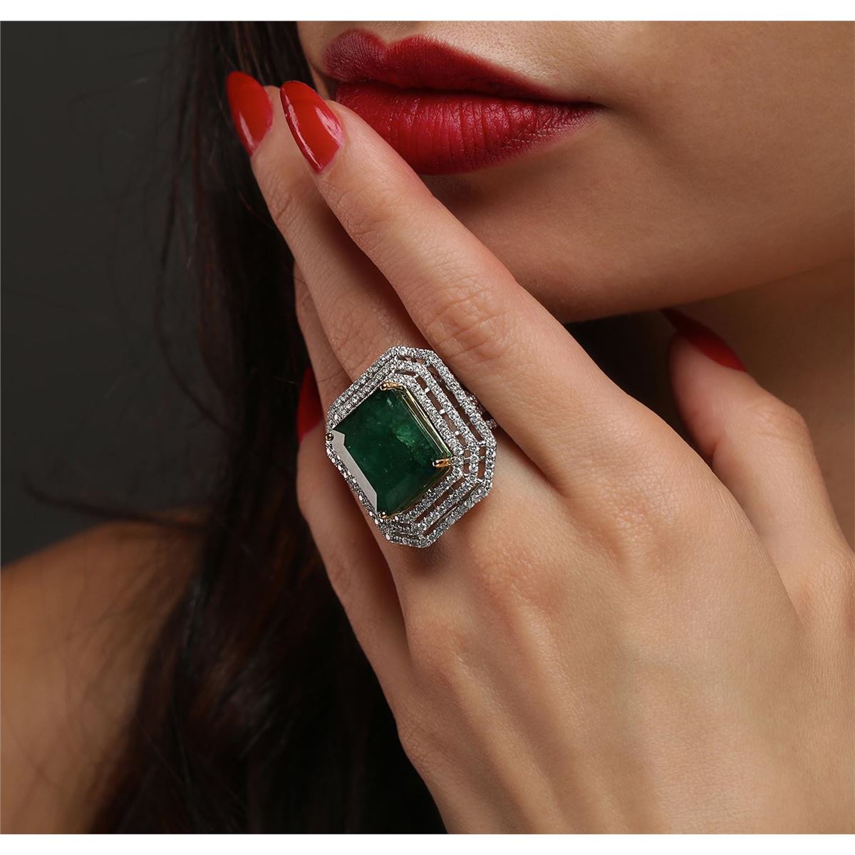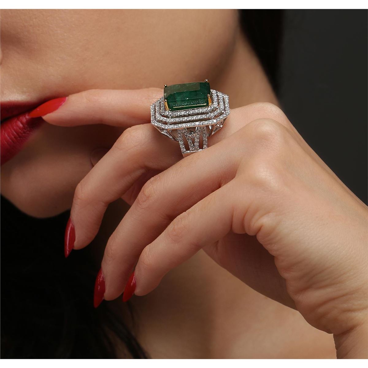 One electronically tested 14KT white and yellow gold Ladies combination cast & assembled ring with a bright polish finish. Condition is new. Identified with markings of "14K". Containing: One prong set emerald standard step cut natural emerald, measuring 16.40 x 14.30 x 10.43mm, approximate weight of 17.96ct., clarity is heavily included, type III, medium dark, moderately strong, green color, (GIA G 6/4), cut is good. Colored gemstones are presumed to have been subjected to commonly used color/clarity enhancement processes. Two Hundred Four prong set round brilliant cut diamonds, measuring 1.30 - 1.30 x 0.78mm (depth est.) approximate. Total Weight of 204 Stones = 1.63ct. Clarity: I-1 to I-3. Color: H - J, Cut is Good. Total Weight of Colored Stones 17.96ct. Total Weight of Diamonds 1.63ct. Total Weight of Ring 15.90 grams. GGL Appraised at $24,400.00.