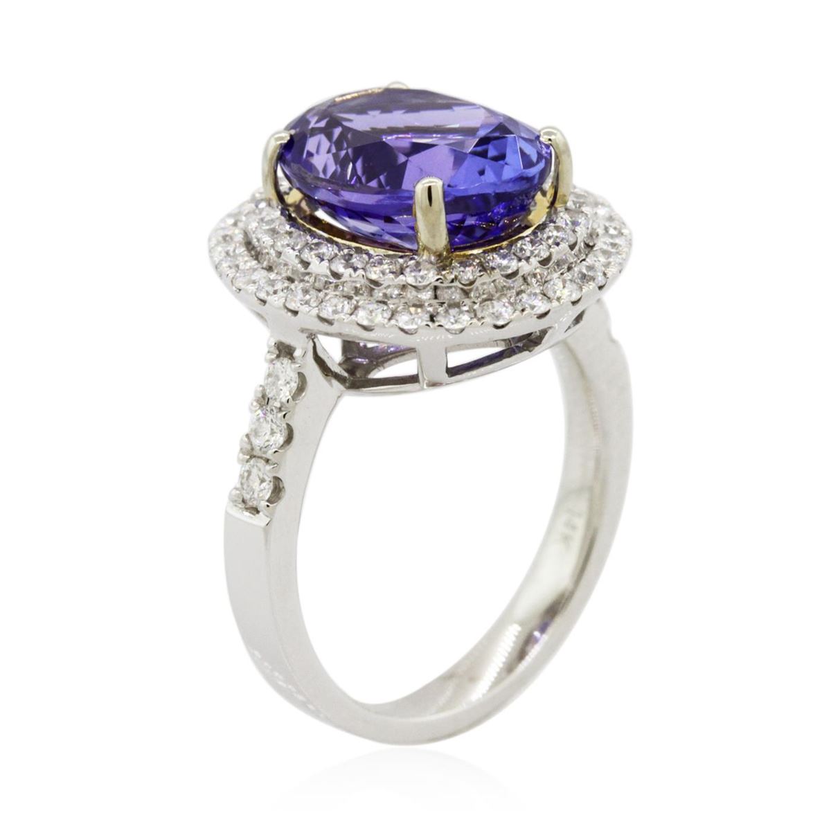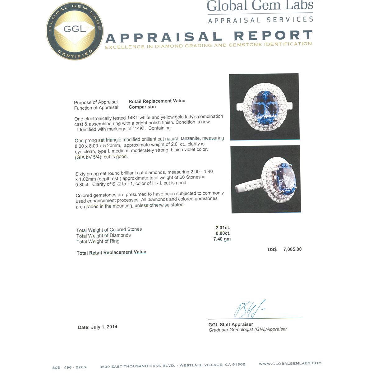 One electronically tested 14KT white and yellow gold Ladies combination cast & assembled ring with a bright polish finish. Condition is new. Identified with markings of "14K". Containing: One prong set triangle modified brilliant cut natural tanzanite, measuring 8.00 x 8.00 x 5.20mm, approximate weight of 2.01ct., clarity is eye clean, type I, medium, moderately strong, bluish violet color, (GIA bV 5/4), cut is good. Sixty prong set round brilliant cut diamonds, measuring 2.00 - 1.40 x 1.02mm (depth est.) approximate total weight of 60 Stones = 0.80ct. Clarity: SI-2 to I-1. Color: H - I, Cut is Good. Colored gemstones are presumed to have been subjected to commonly used enhancement processes. All diamonds and colored gemstones are graded in the mounting, unless otherwise stated. Total Weight of Colored Stones 2.01ct. Total Weight of Diamonds 0.80ct. Total Weight of Ring 7.40 grams. GGL Appraised at $7,085.00.