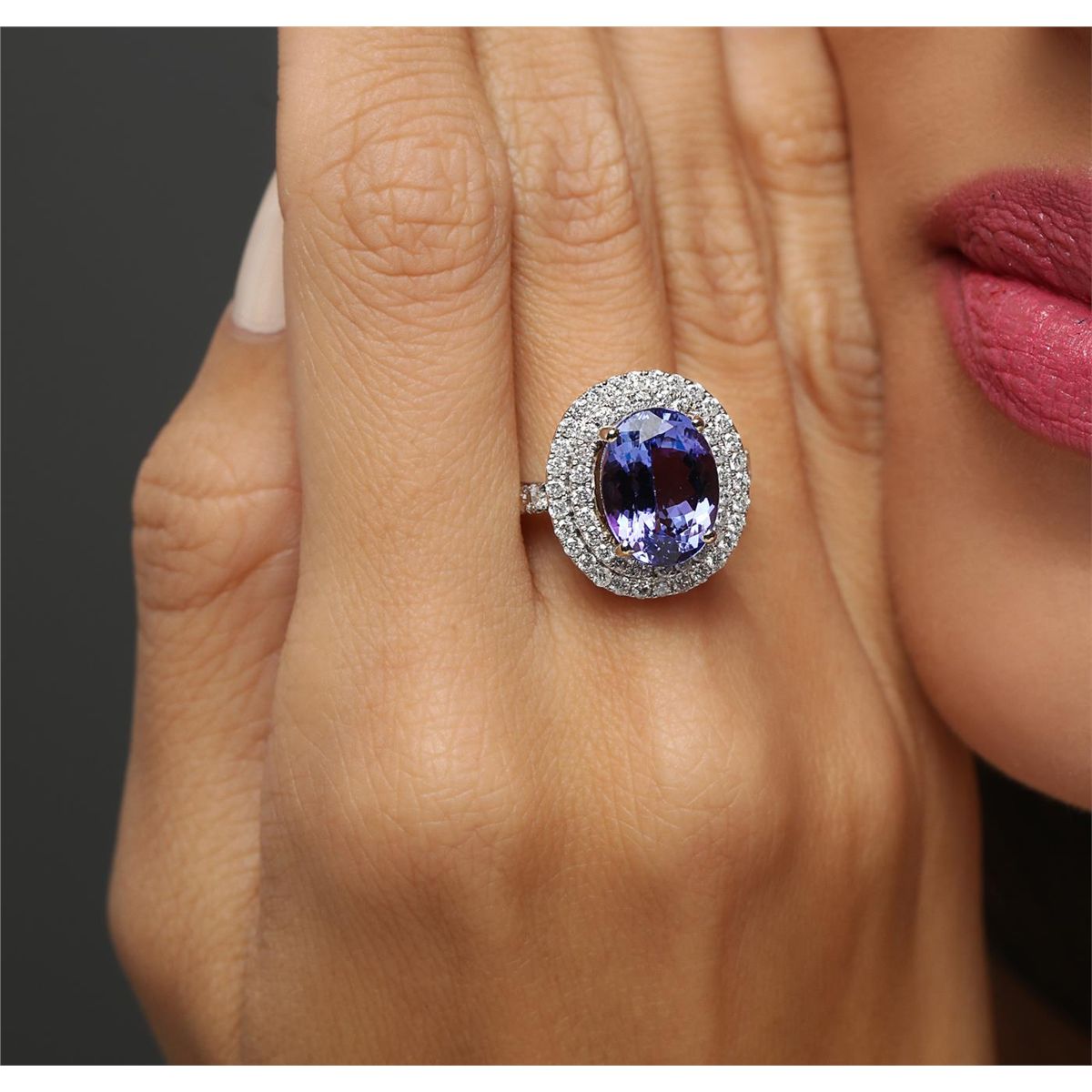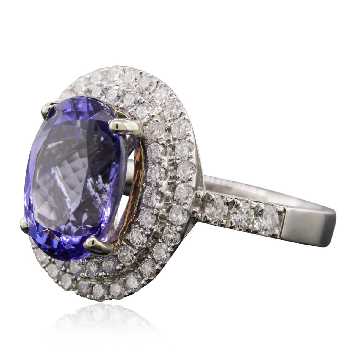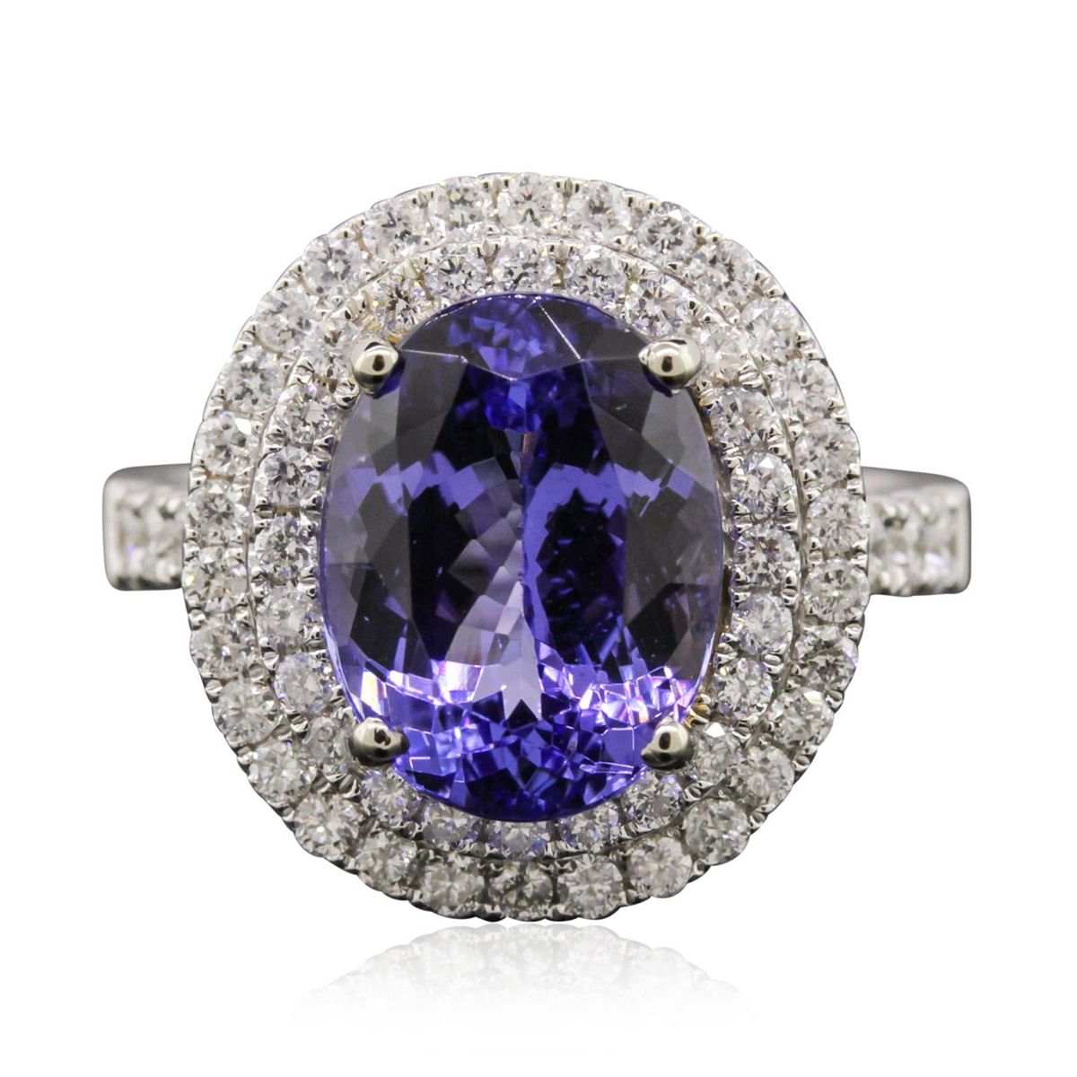 One electronically tested 14KT white and yellow gold Ladies combination cast & assembled ring with a bright polish finish. Condition is new. Identified with markings of "14K". Containing: One prong set triangle modified brilliant cut natural tanzanite, measuring 8.00 x 8.00 x 5.20mm, approximate weight of 2.01ct., clarity is eye clean, type I, medium, moderately strong, bluish violet color, (GIA bV 5/4), cut is good. Sixty prong set round brilliant cut diamonds, measuring 2.00 - 1.40 x 1.02mm (depth est.) approximate total weight of 60 Stones = 0.80ct. Clarity: SI-2 to I-1. Color: H - I, Cut is Good. Colored gemstones are presumed to have been subjected to commonly used enhancement processes. All diamonds and colored gemstones are graded in the mounting, unless otherwise stated. Total Weight of Colored Stones 2.01ct. Total Weight of Diamonds 0.80ct. Total Weight of Ring 7.40 grams. GGL Appraised at $7,085.00.