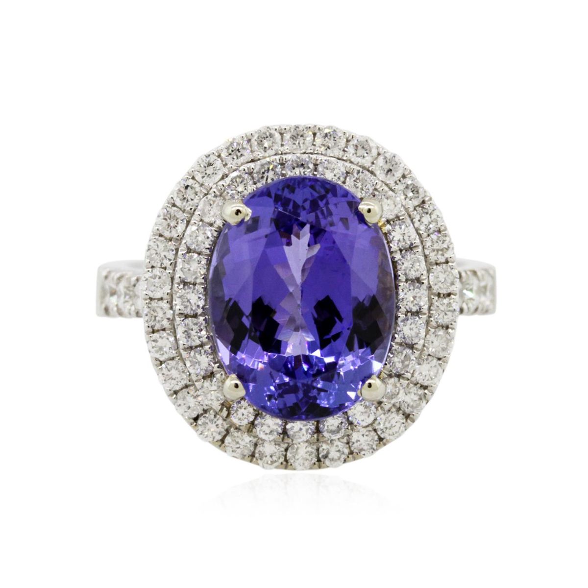 One electronically tested 14KT white and yellow gold Ladies combination cast & assembled ring with a bright polish finish. Condition is new. Identified with markings of "14K". Containing: One prong set triangle modified brilliant cut natural tanzanite, measuring 8.00 x 8.00 x 5.20mm, approximate weight of 2.01ct., clarity is eye clean, type I, medium, moderately strong, bluish violet color, (GIA bV 5/4), cut is good. Sixty prong set round brilliant cut diamonds, measuring 2.00 - 1.40 x 1.02mm (depth est.) approximate total weight of 60 Stones = 0.80ct. Clarity: SI-2 to I-1. Color: H - I, Cut is Good. Colored gemstones are presumed to have been subjected to commonly used enhancement processes. All diamonds and colored gemstones are graded in the mounting, unless otherwise stated. Total Weight of Colored Stones 2.01ct. Total Weight of Diamonds 0.80ct. Total Weight of Ring 7.40 grams. GGL Appraised at $7,085.00.