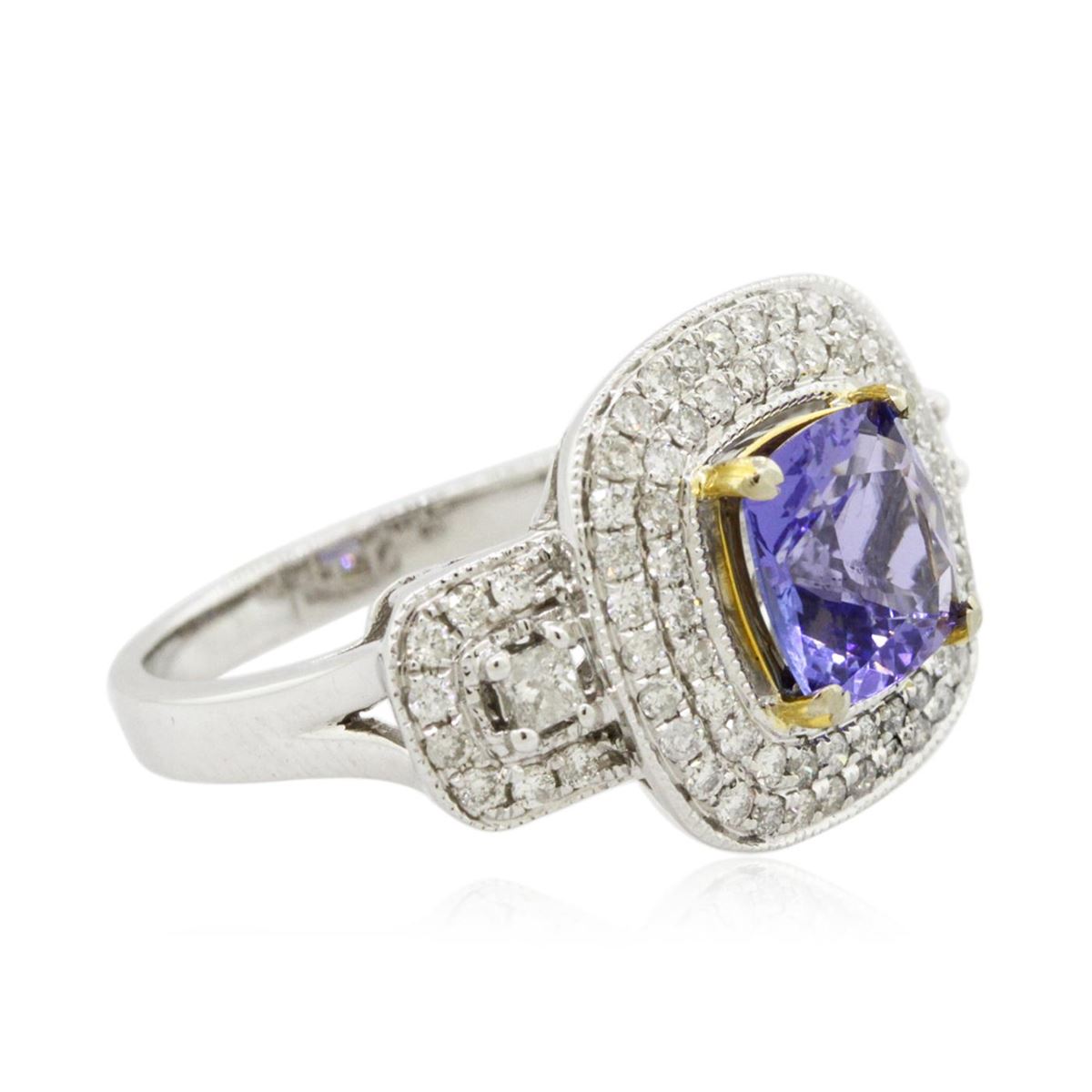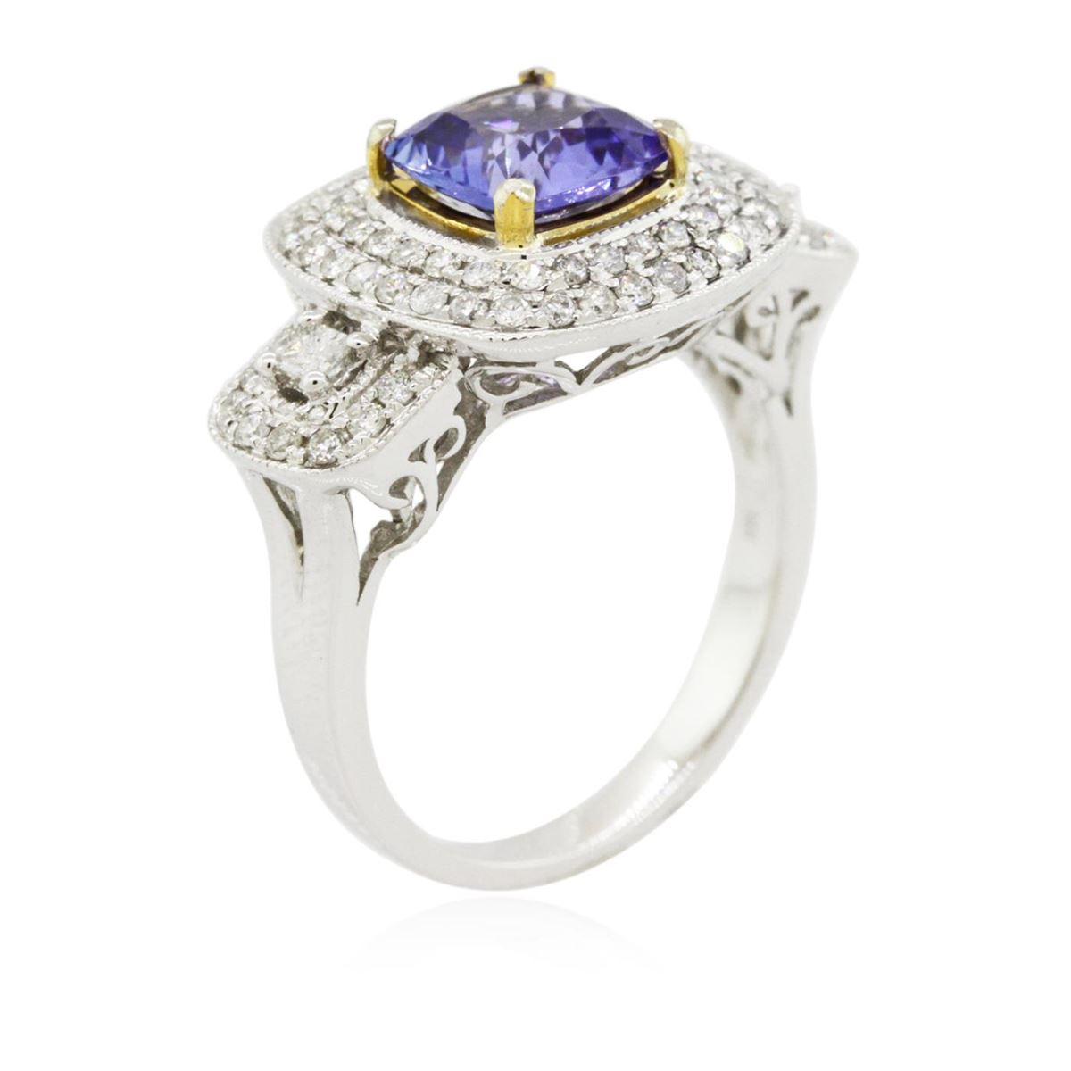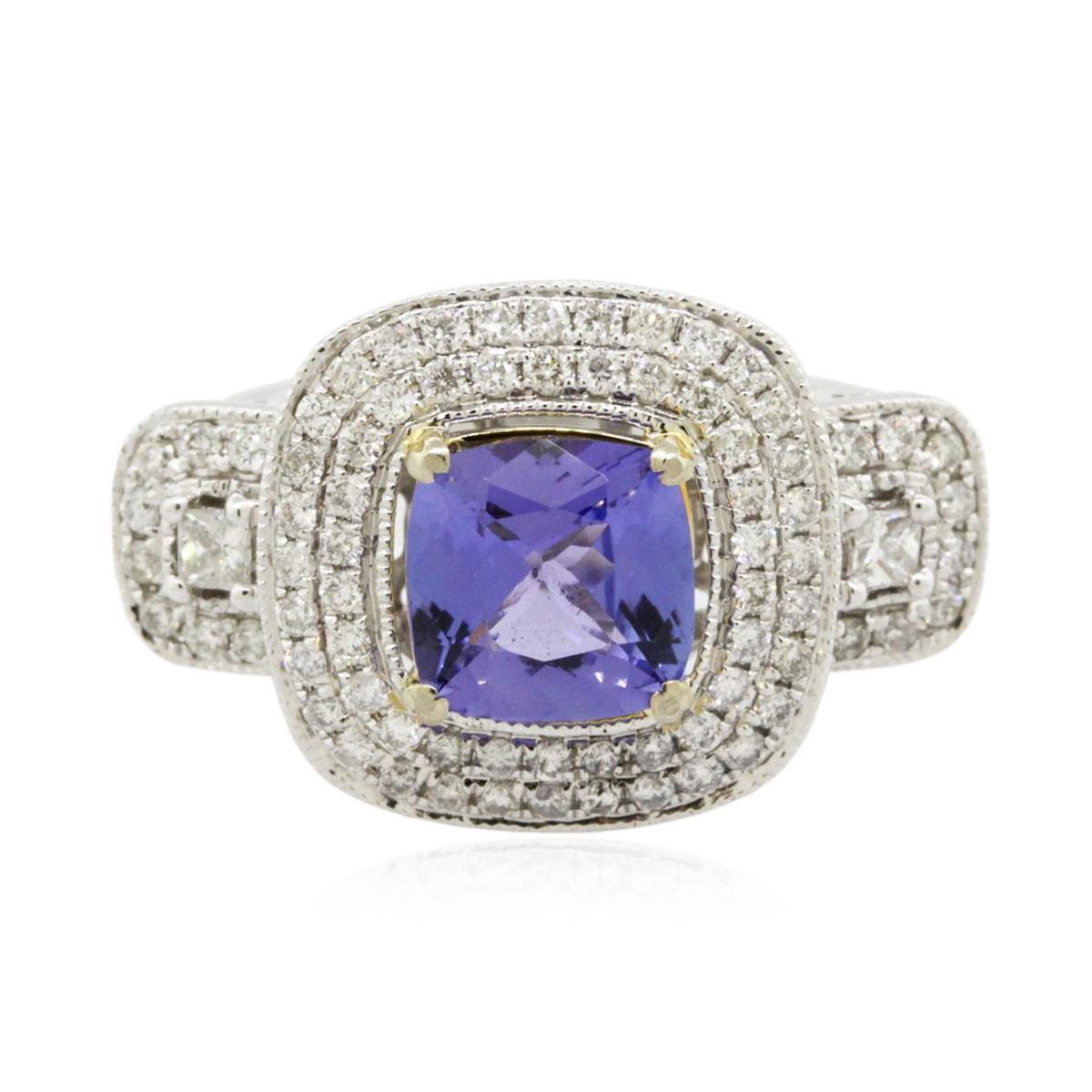 One electronically tested 14KT white and yellow gold Ladies combination cast & assembled ring with a bright polish finish. Condition is new. Identified with markings of "14K". Containing: One prong set square cushion modified brilliant cut natural tanzanite, measuring 7.40 x 7.40 x 4.81mm, approximate weight of 2.07ct., clarity is eye clean, type I, medium, moderately strong, violetish blue color, (GIA vB 5/4), cut is good. Colored gemstones are presumed to have been subjected to commonly used color/clarity enhancement processes. Seventy-Four prong set round brilliant cut diamonds, measuring 1.10 - 1.10 x 0.66mm (depth est.) approximate. Total Weight of 74 Stones = 0.36ct. Clarity: I-1 to I-2. Color: I - J, Cut is Good. Two prong set princess cut diamonds, measuring 2.00 x 2.00 x 1.50mm (depth est.) approximate. Total Weight of 2 Stones = 0.10ct. Clarity: I-1 to I-2. Color: H, Cut is Good. Total Weight of Colored Stones 2.07ct. Total Weight of Diamonds 0.45ct. Total Weight of Ring 6.20 grams. GGL Appraised at $6,700.00.