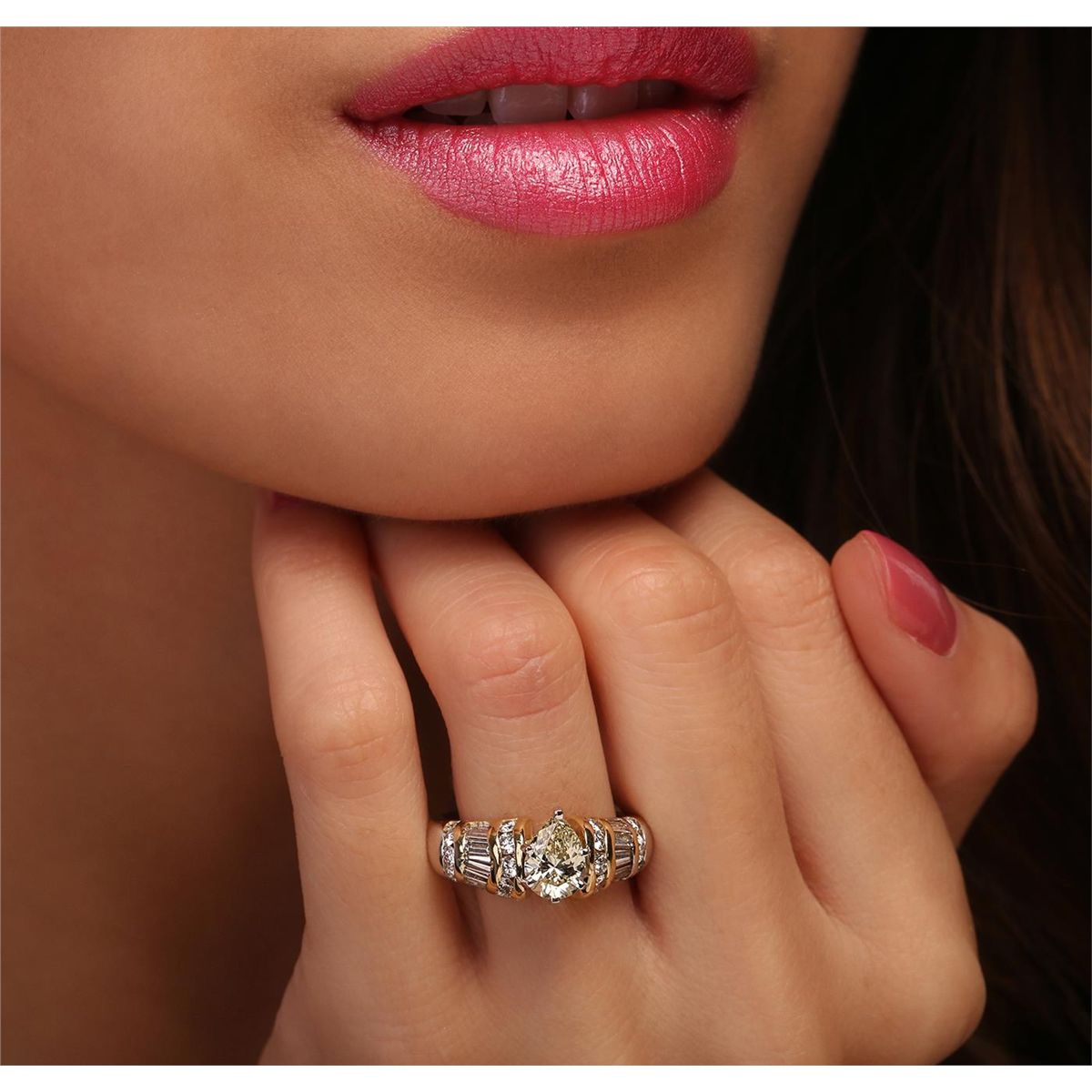 One electronically tested 14KT white and yellow gold Ladies combination cast & assembled engagement ring with a bright polish finish. Condition is new. Identified with markings of "14K". Containing: One prong set pear shaped cut diamond, measuring 8.50 x 6.00 x 3.78mm (depth est.) approximate weight of 1.16ct. Clarity: SI-2, Cut is Good. Twenty prong set round brilliant cut diamonds, measuring 2.00 - 2.00 x 1.20mm (depth est.) approximate total weight of 20 Stones = 0.58ct. Clarity: SI-2 to I-1. Color: I - J, Cut is Good. All diamonds are graded in the mounting, unless otherwise stated. Fourteen channel set baguette cut diamonds, measuring from 2.50 x 1.50 x 1.28mm (depth est.) to 3.00 x 1.50 x 1.28mm (depth est.) approximate total weight of 14 Stones = 0.68ct. Clarity: SI-1 to SI-2. Color: I - J, Cut is Good. All diamonds are graded in the mounting, unless otherwise stated. Total Weight of Diamonds 2.42ct. Total Weight of Engagement Ring 6.20 grams. GGL Appraised at $11,745.00.