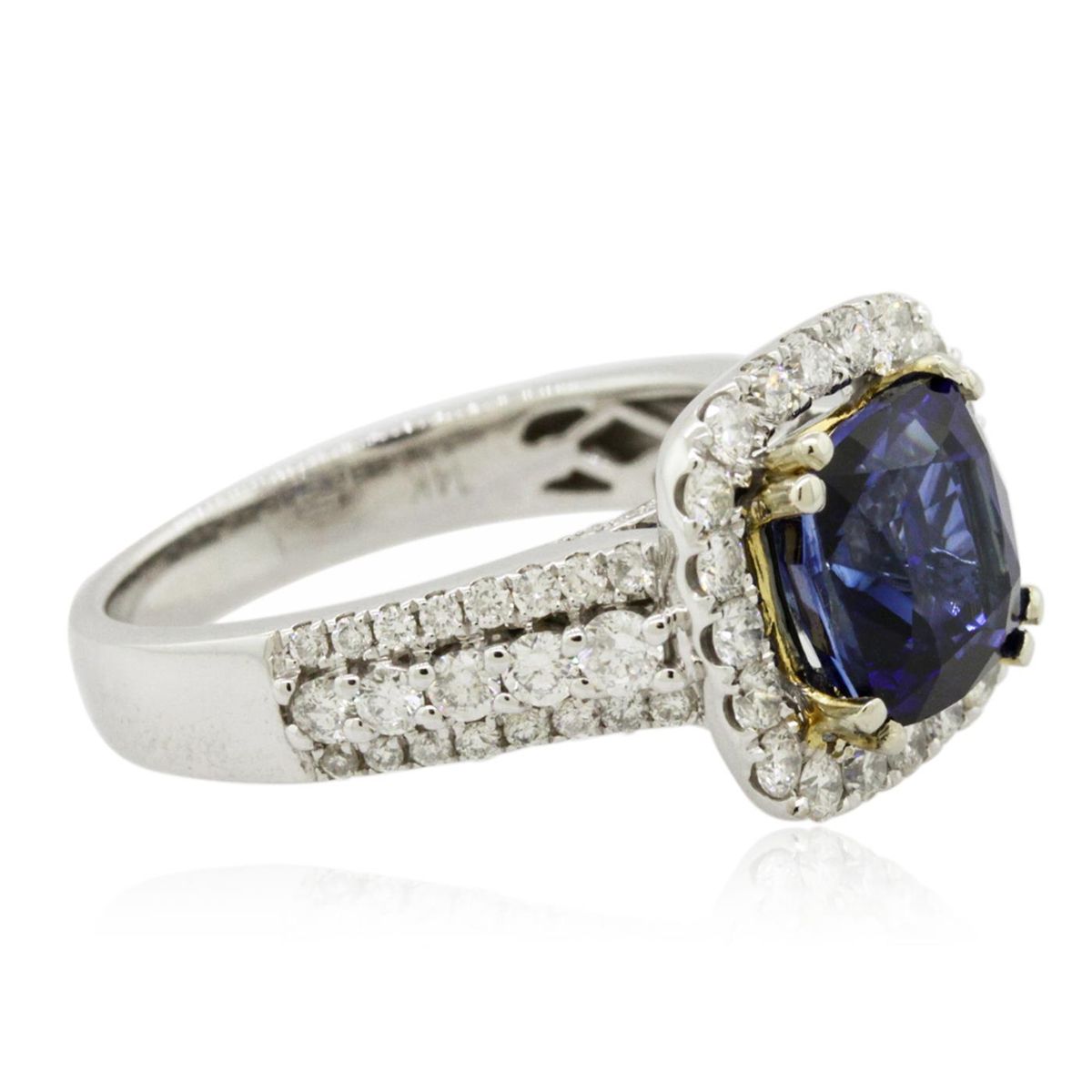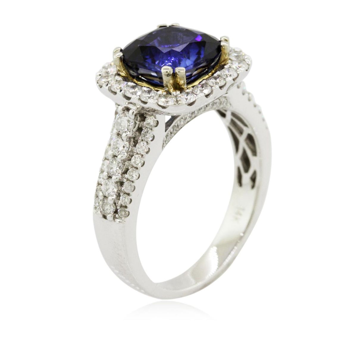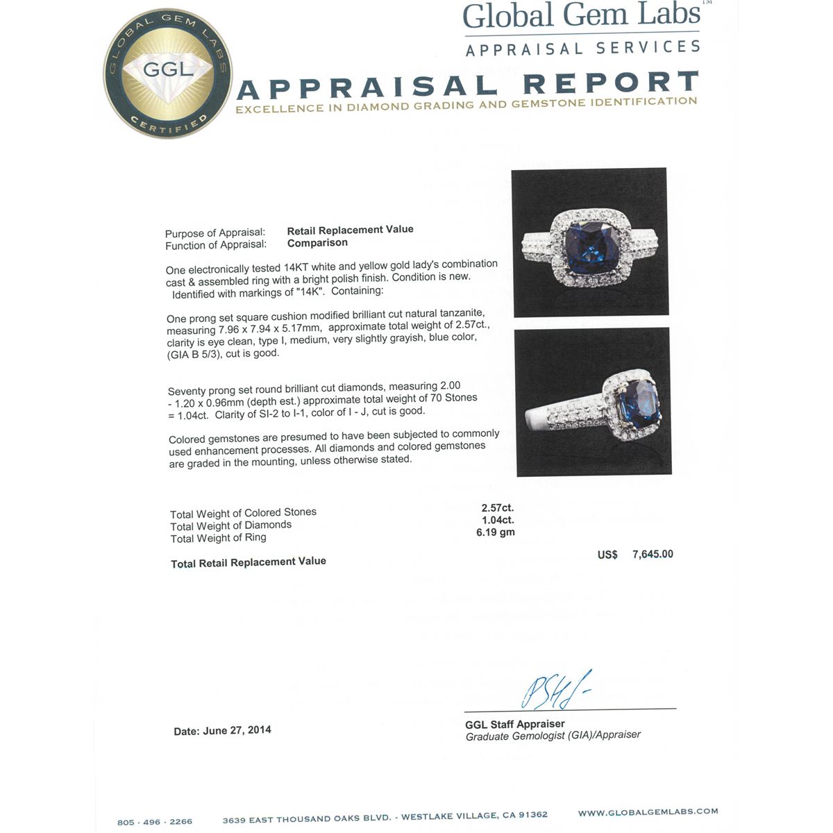 One electronically tested 14KT white and yellow gold Ladies combination cast & assembled ring with a bright polish finish. Condition is new. Identified with markings of "14K". Containing: One prong set square cushion modified brilliant cut natural tanzanite, measuring 7.96 x 7.94 x 5.17mm, approximate total weight of 2.57ct., clarity is eye clean, type I, medium, very slightly grayish, blue color, (GIA B 5/3), cut is good. Seventy prong set round brilliant cut diamonds, measuring 2.00 - 1.20 x 0.96mm (depth est.) approximate total weight of 70 Stones = 1.04ct. Clarity: SI-2 to I-1. Color: I - J, Cut is Good. Colored gemstones are presumed to have been subjected to commonly used enhancement processes. All diamonds and colored gemstones are graded in the mounting, unless otherwise stated. Total Weight of Colored Stones 2.57ct. Total Weight of Diamonds 1.04ct. Total Weight of Ring 6.19 grams. GGL Appraised at $7,645.00.