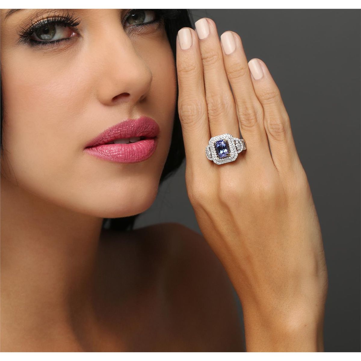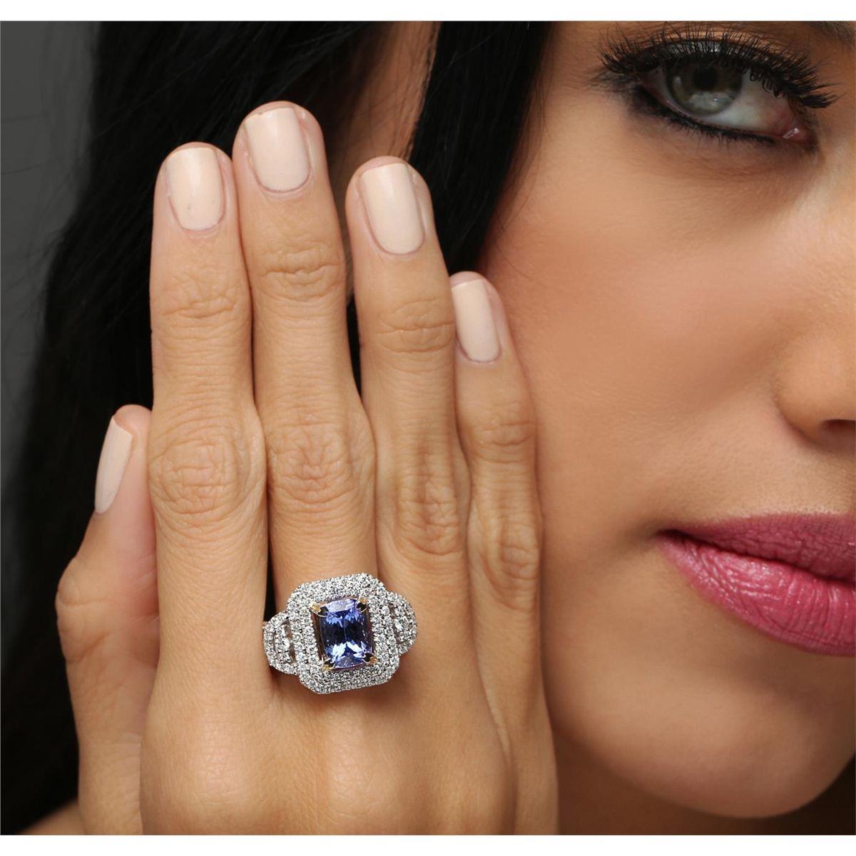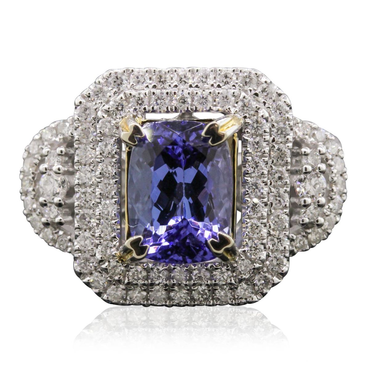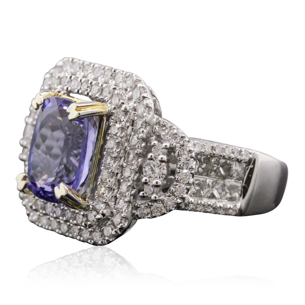 One electronically tested 14KT white and yellow gold Ladies combination cast & assembled ring with a bright polish finish. Condition is new. Identified with markings of "14K". Containing: One prong set square cushion modified brilliant cut natural tanzanite, measuring 9.57 x 6.76 x 5.31mm, approximate weight of 2.79ct., clarity is eye clean, type I, medium, moderately strong, bluish violet color, (GIA bV 5/4), cut is good. One Hundred Ten prong set round brilliant cut diamonds, measuring 2.00 - 1.30 x 0.99mm (depth est.) approximate total weight of 110 Stones = 1.20ct. Clarity: I-1 to I-2. Color: H - I, Cut is Good. Twelve invisible set princess cut diamonds, measuring 2.00 x 2.00 x 1.50mm (depth est.) approximate total weight of 12 Stones = 0.59ct. Clarity: SI-1 to I-1. Color: I - J, Cut is Good. Colored gemstones are presumed to have been subjected to commonly used enhancement processes. All diamonds and colored gemstones are graded in the mounting, unless otherwise stated. Total Weight of Colored Stones 2.79ct. Total Weight of Diamonds 1.79ct. Total Weight of Ring 8.90 grams. GGL Appraised at $9,660.00.
