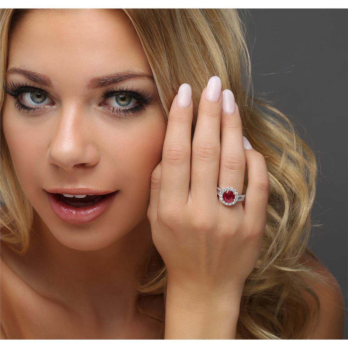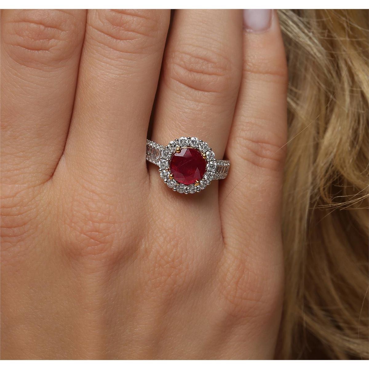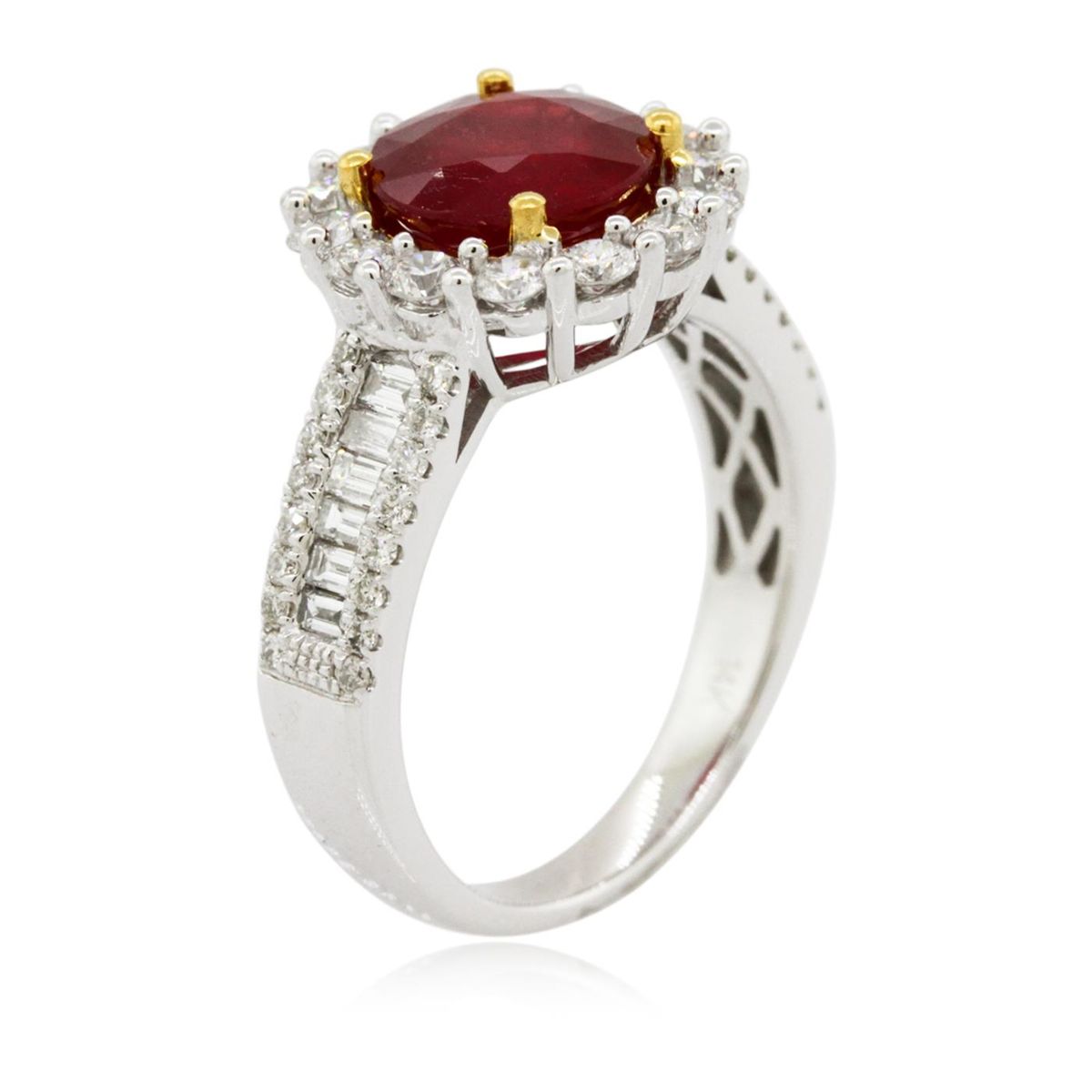 One electronically tested 14KT white and yellow gold Ladies combination cast & assembled ring with a bright polish finish. Condition is new. Identified with markings of "14K". Containing: One prong set round modified brilliant cut natural ruby, measuring 8.20 - 8.20 x 5.33 mm, approximate weight of 2.87ct., clarity is heavily included, type II, medium dark, moderately strong, strongly purplish red color, (GIA stpR 6/4), cut is good. Fourteen prong set round brilliant cut diamonds, measuring 2.00 - 2.00 x 1.20mm (depth est.) approximate total weight of 14 Stones = 0.41ct. Clarity: SI-2 to I-1. Color: I - J, Cut is Good. Thirty-Two prong set round brilliant cut diamonds, measuring 1.00 - 1.00 x 0.60mm (depth est.) approximate total weight of 32 Stones = 0.12ct. Clarity: SI-2 to I-1. Color: I - J, Cut is Good. Eleven channel set baguette cut diamonds, measuring from 1.90 x 1.30 x 1.11mm (depth est.) to 2.00 x 1.50 x 1.28mm (depth est.) approximate total weight of 11 Stones = 0.33ct. Clarity: SI-1 to SI-2. Color: I - J, Cut is Good. Colored gemstones are presumed to have been subjected to commonly used enhancement processes. All diamonds and colored gemstones are graded in the mounting, unless otherwise stated. Total Weight of Colored Stones 2.87ct. Total Weight of Diamonds 0.85ct. Total Weight of Ring 5.50 grams. GGL Appraised at $5,735.00.