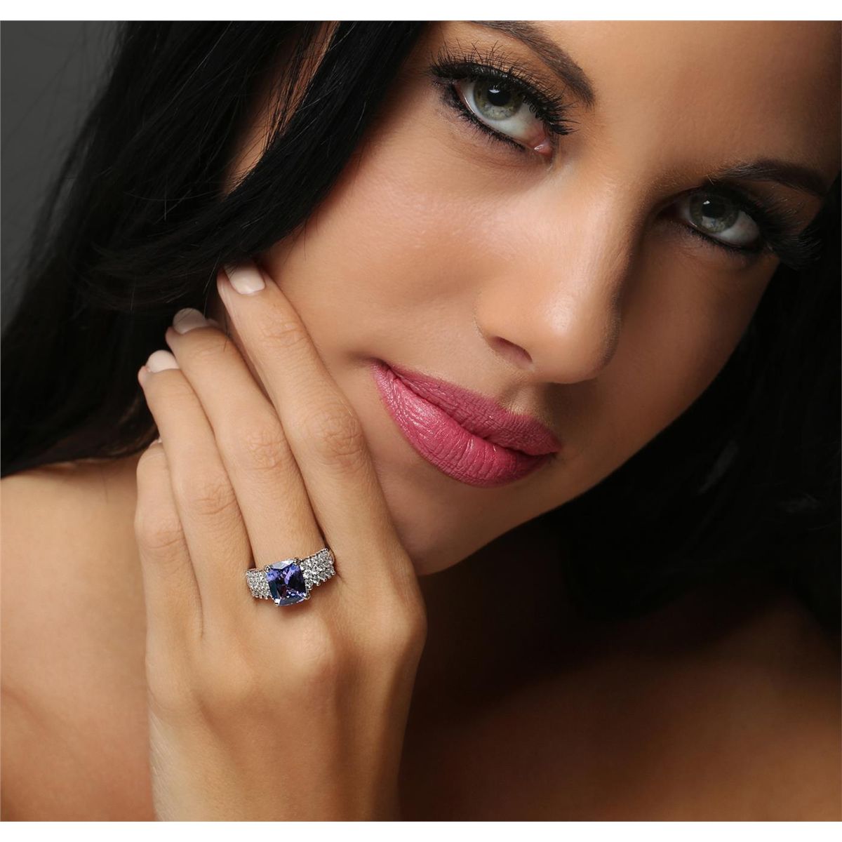 One electronically tested 14KT white and yellow gold Ladies combination cast & assembled ring with a bright polish finish. Condition is new. Identified with markings of "14K". Containing: One prong set rectangular cushion modified brilliant cut natural tanzanite, measuring 9.90 x 7.90 x 5.13mm, approximate total weight of 3.16ct., clarity is eye clean, type I, medium, moderately strong, bluish violet color, (GIA bV 5/4), cut is good. Thirty prong set round brilliant cut diamonds, measuring 1.80 - 1.80 x 1.08mm (depth est.) approximate total weight of 30 Stones = 0.64ct. Clarity: SI-2 to I-1. Color: I - J, Cut is Good. Colored gemstones are presumed to have been subjected to commonly used enhancement processes. All diamonds and colored gemstones are graded in the mounting, unless otherwise stated. Total Weight of Colored Stones 3.16ct. Total Weight of Diamonds 0.64ct. Total Weight of Ring 5.40 grams. GGL Appraised at $7,385.00.