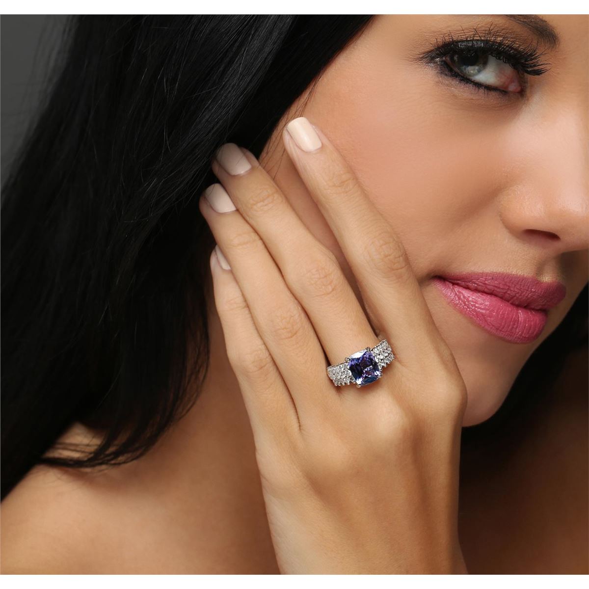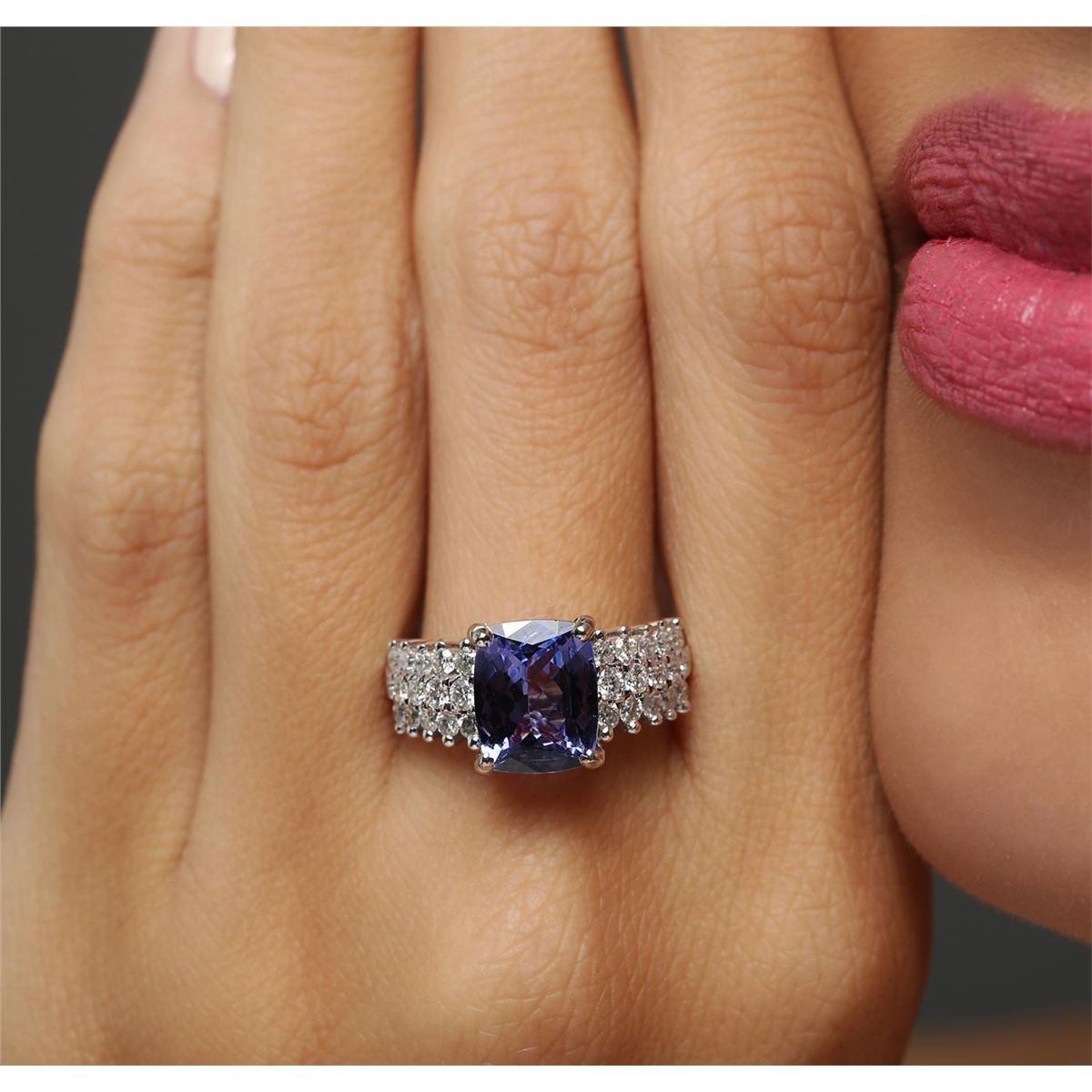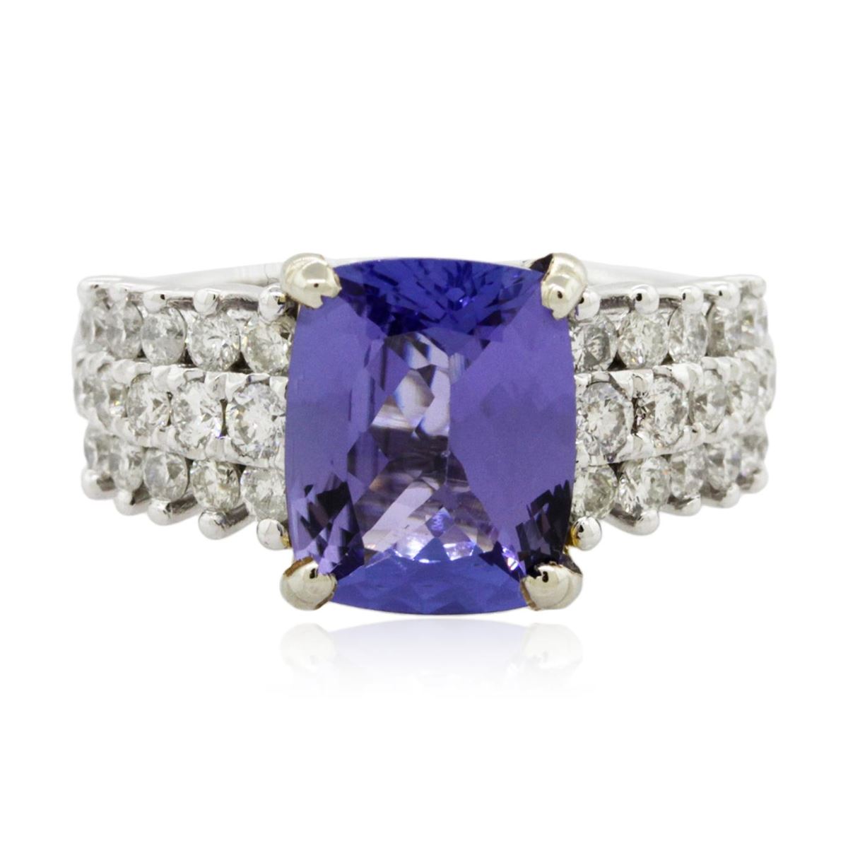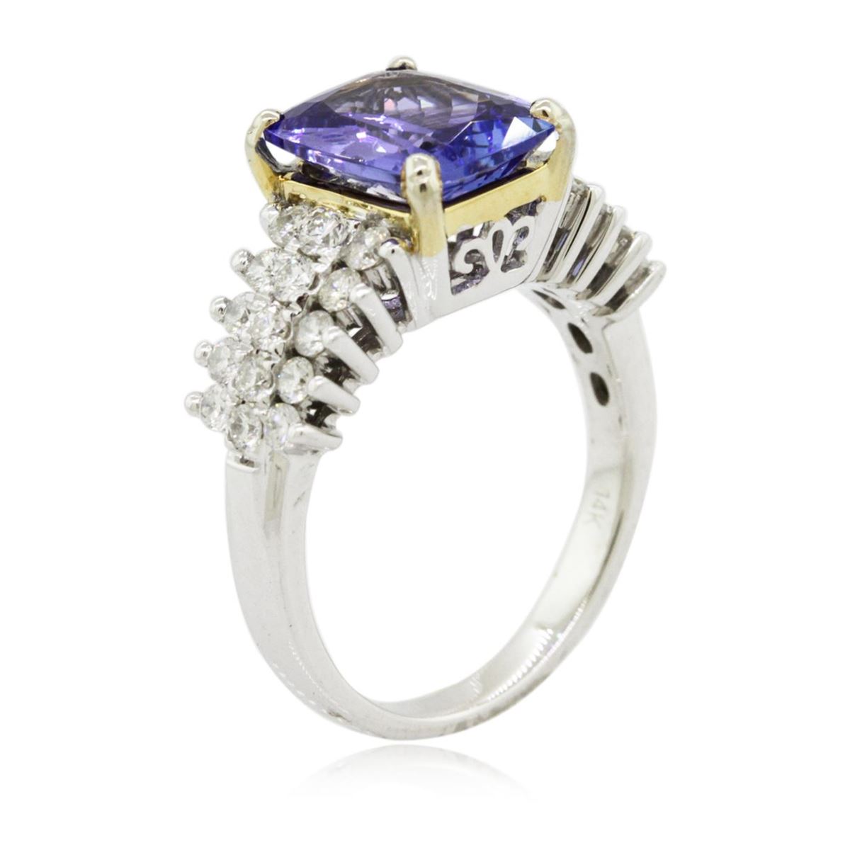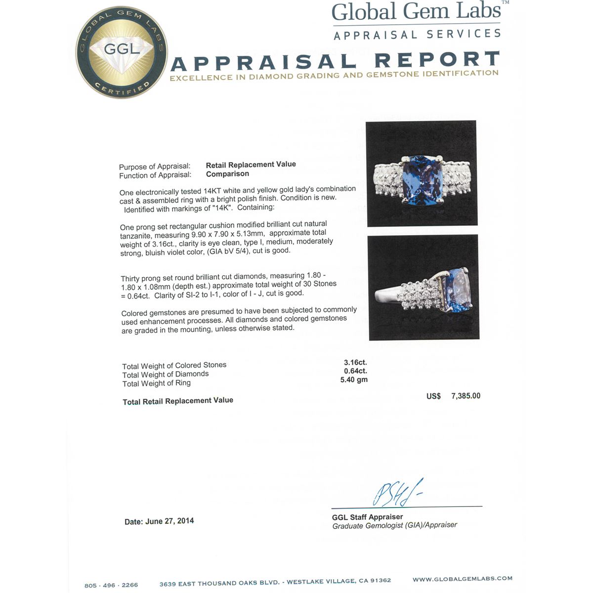 One electronically tested 14KT white and yellow gold Ladies combination cast & assembled ring with a bright polish finish. Condition is new. Identified with markings of "14K". Containing: One prong set rectangular cushion modified brilliant cut natural tanzanite, measuring 9.90 x 7.90 x 5.13mm, approximate total weight of 3.16ct., clarity is eye clean, type I, medium, moderately strong, bluish violet color, (GIA bV 5/4), cut is good. Thirty prong set round brilliant cut diamonds, measuring 1.80 - 1.80 x 1.08mm (depth est.) approximate total weight of 30 Stones = 0.64ct. Clarity: SI-2 to I-1. Color: I - J, Cut is Good. Colored gemstones are presumed to have been subjected to commonly used enhancement processes. All diamonds and colored gemstones are graded in the mounting, unless otherwise stated. Total Weight of Colored Stones 3.16ct. Total Weight of Diamonds 0.64ct. Total Weight of Ring 5.40 grams. GGL Appraised at $7,385.00.