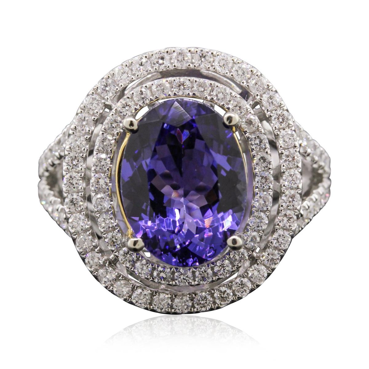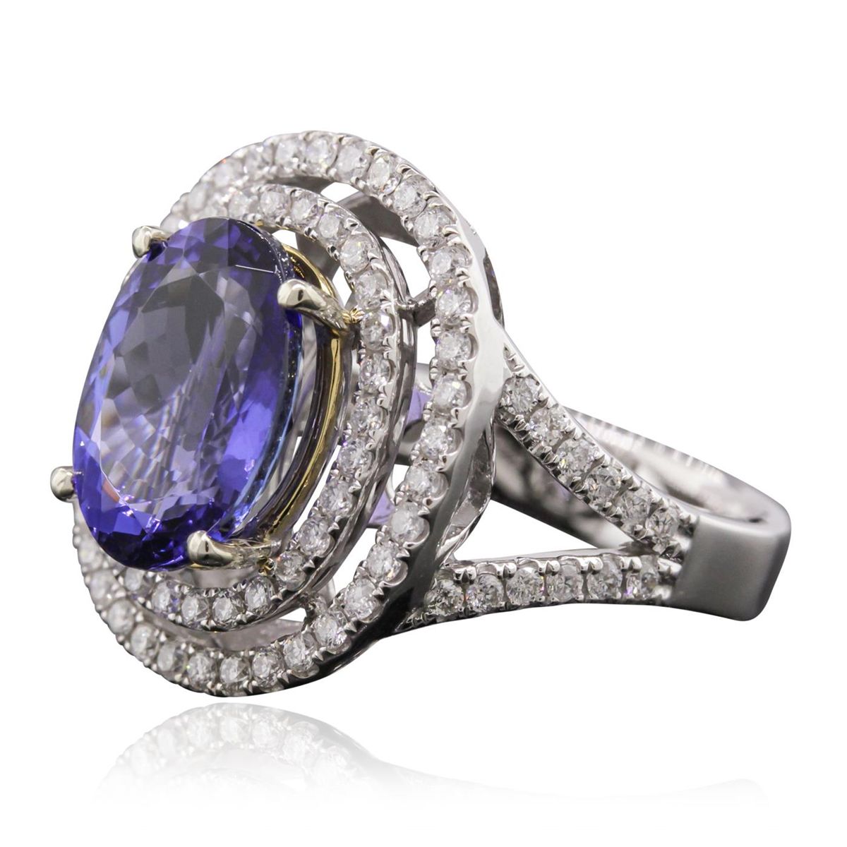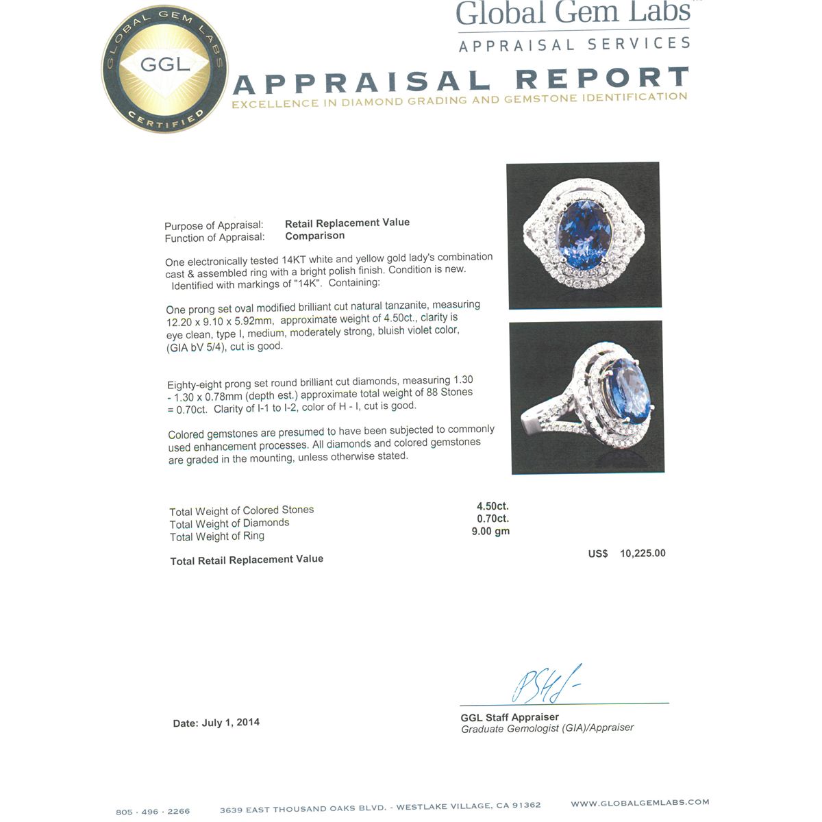 One electronically tested 14KT white and yellow gold Ladies combination cast & assembled ring with a bright polish finish. Condition is new. Identified with markings of "14K". Containing: One prong set oval modified brilliant cut natural tanzanite, measuring 12.20 x 9.10 x 5.92mm, approximate weight of 4.50ct., clarity is eye clean, type I, medium, moderately strong, bluish violet color, (GIA bV 5/4), cut is good. Eighty-Eight prong set round brilliant cut diamonds, measuring 1.30 - 1.30 x 0.78mm (depth est.) approximate total weight of 88 Stones = 0.70ct. Clarity: I-1 to I-2. Color: H - I, Cut is Good. Colored gemstones are presumed to have been subjected to commonly used enhancement processes. All diamonds and colored gemstones are graded in the mounting, unless otherwise stated. Total Weight of Colored Stones 4.50ct. Total Weight of Diamonds 0.70ct. Total Weight of Ring 9.00 grams. GGL Appraised at $10,225.00.