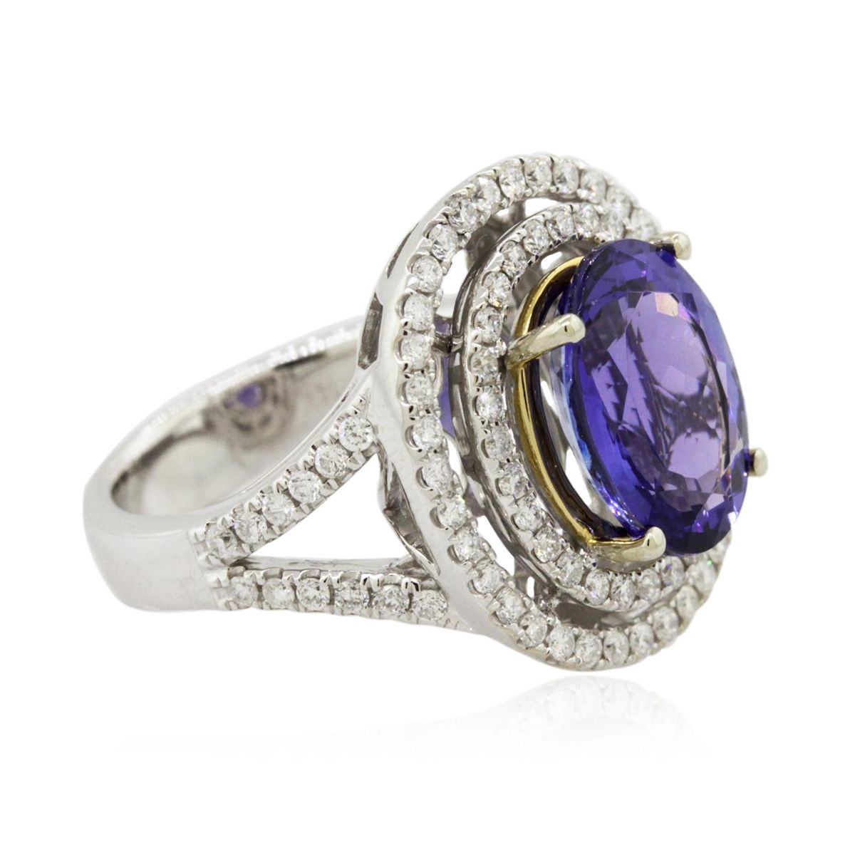 One electronically tested 14KT white and yellow gold Ladies combination cast & assembled ring with a bright polish finish. Condition is new. Identified with markings of "14K". Containing: One prong set oval modified brilliant cut natural tanzanite, measuring 12.20 x 9.10 x 5.92mm, approximate weight of 4.50ct., clarity is eye clean, type I, medium, moderately strong, bluish violet color, (GIA bV 5/4), cut is good. Eighty-Eight prong set round brilliant cut diamonds, measuring 1.30 - 1.30 x 0.78mm (depth est.) approximate total weight of 88 Stones = 0.70ct. Clarity: I-1 to I-2. Color: H - I, Cut is Good. Colored gemstones are presumed to have been subjected to commonly used enhancement processes. All diamonds and colored gemstones are graded in the mounting, unless otherwise stated. Total Weight of Colored Stones 4.50ct. Total Weight of Diamonds 0.70ct. Total Weight of Ring 9.00 grams. GGL Appraised at $10,225.00.