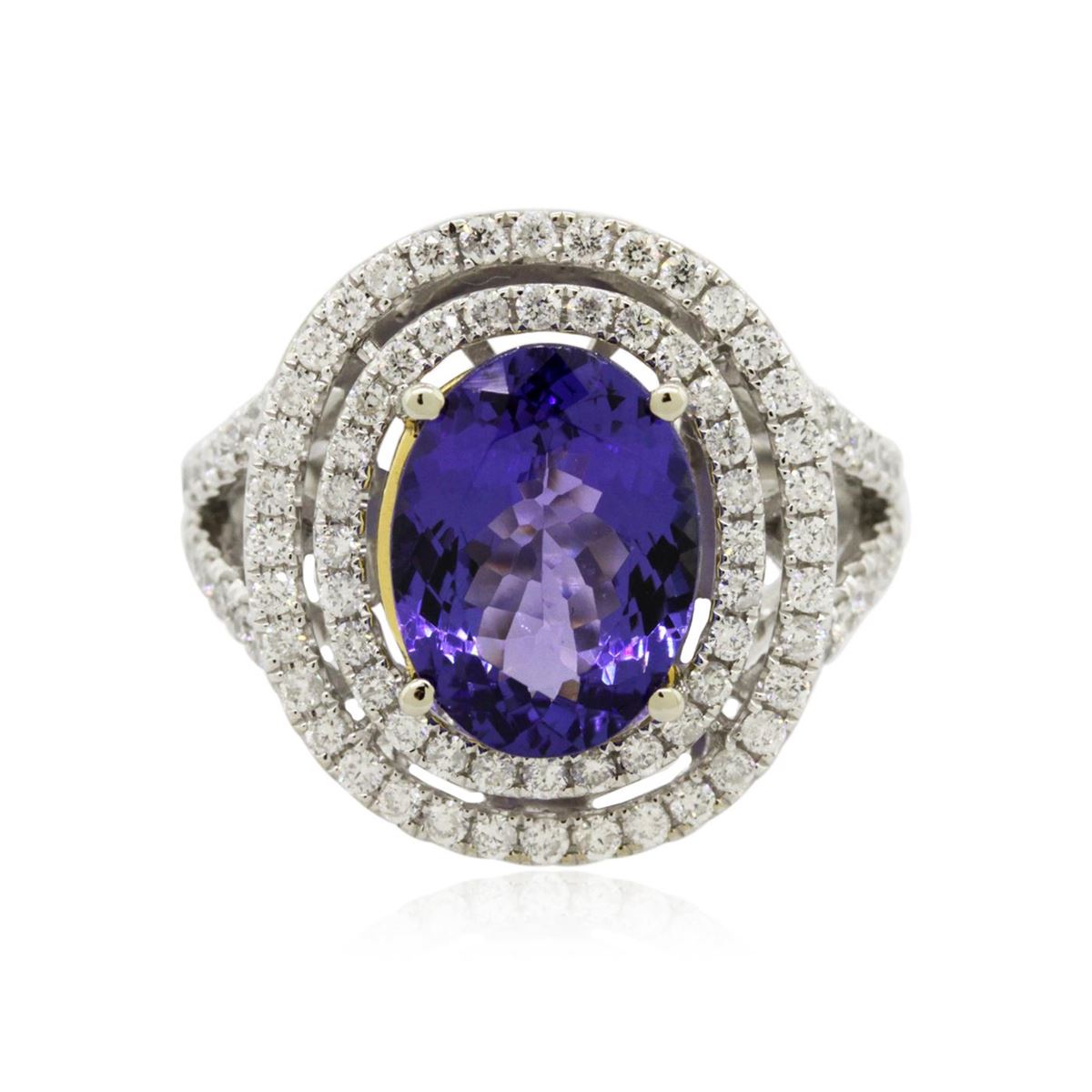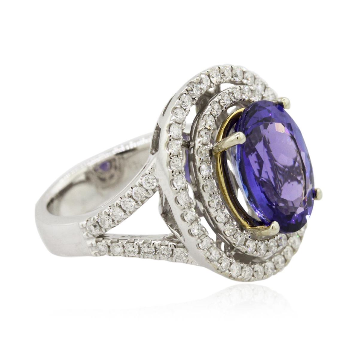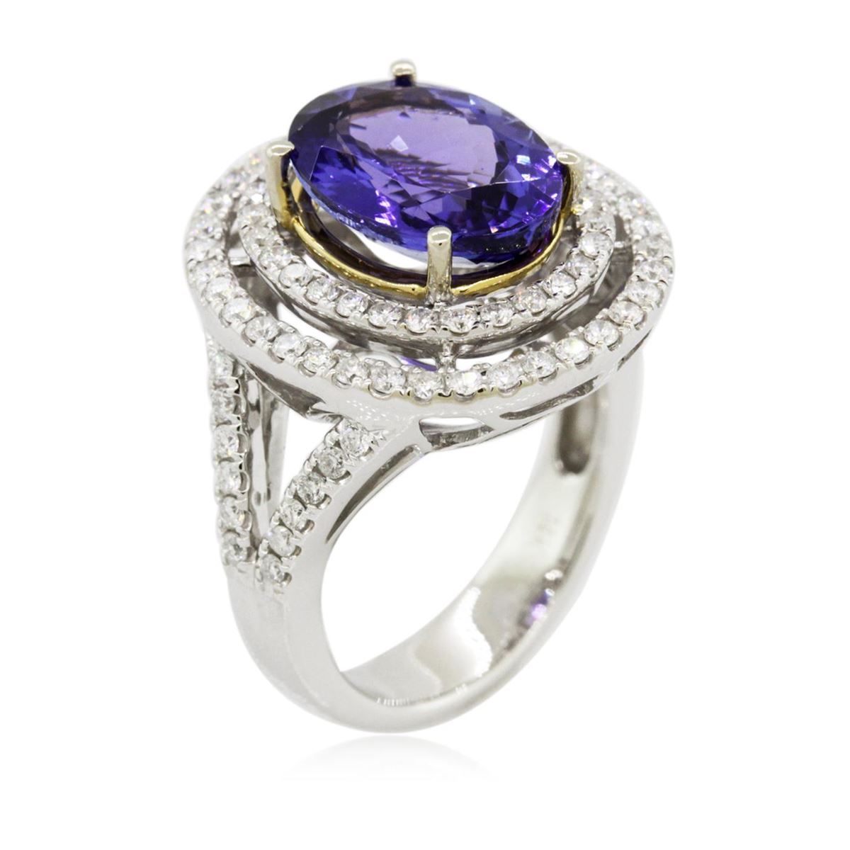 One electronically tested 14KT white and yellow gold Ladies combination cast & assembled ring with a bright polish finish. Condition is new. Identified with markings of "14K". Containing: One prong set oval modified brilliant cut natural tanzanite, measuring 12.20 x 9.10 x 5.92mm, approximate weight of 4.50ct., clarity is eye clean, type I, medium, moderately strong, bluish violet color, (GIA bV 5/4), cut is good. Eighty-Eight prong set round brilliant cut diamonds, measuring 1.30 - 1.30 x 0.78mm (depth est.) approximate total weight of 88 Stones = 0.70ct. Clarity: I-1 to I-2. Color: H - I, Cut is Good. Colored gemstones are presumed to have been subjected to commonly used enhancement processes. All diamonds and colored gemstones are graded in the mounting, unless otherwise stated. Total Weight of Colored Stones 4.50ct. Total Weight of Diamonds 0.70ct. Total Weight of Ring 9.00 grams. GGL Appraised at $10,225.00.