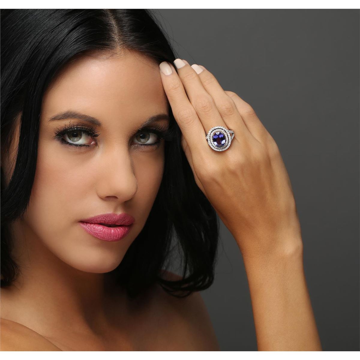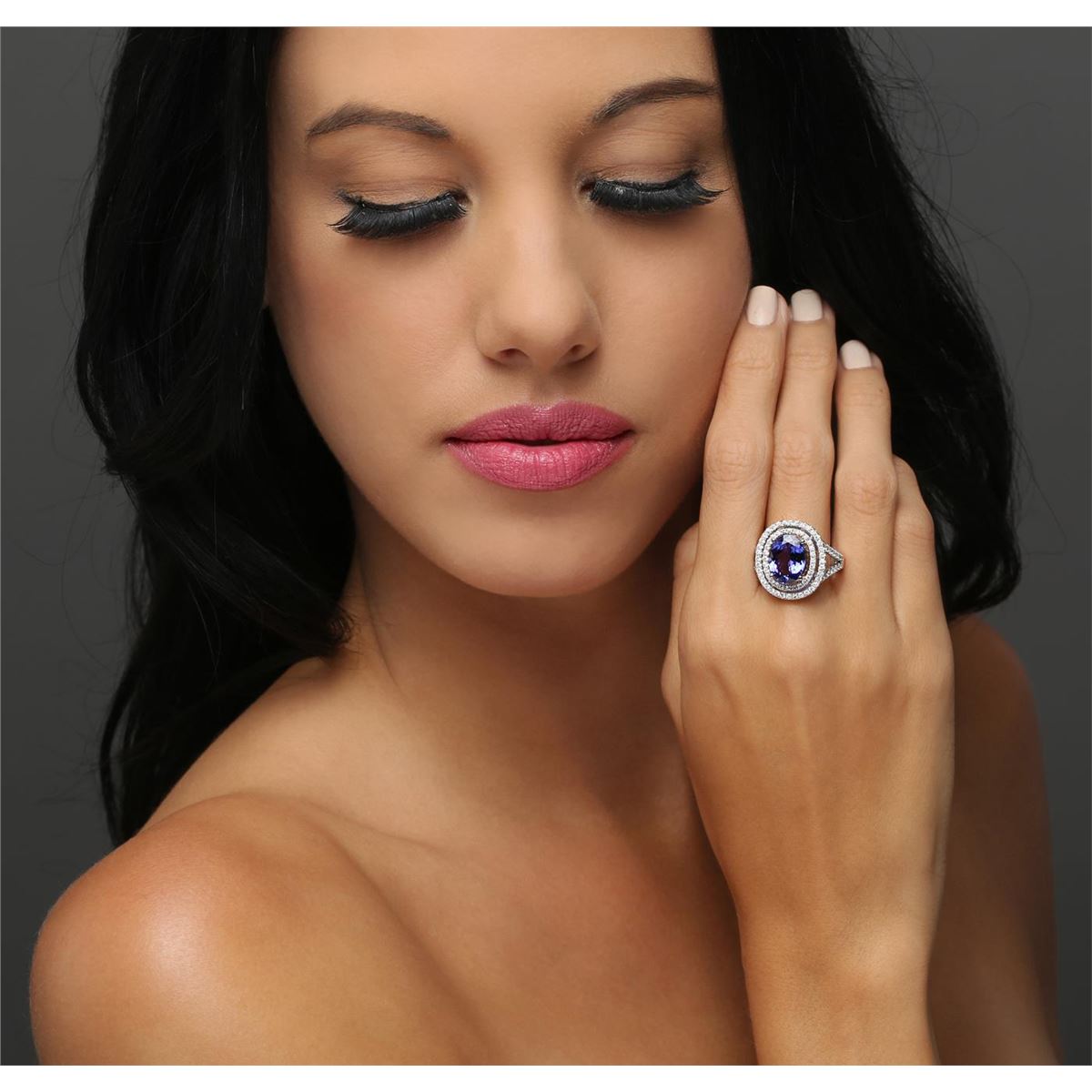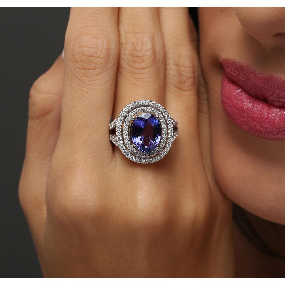 One electronically tested 14KT white and yellow gold Ladies combination cast & assembled ring with a bright polish finish. Condition is new. Identified with markings of "14K". Containing: One prong set oval modified brilliant cut natural tanzanite, measuring 12.20 x 9.10 x 5.92mm, approximate weight of 4.50ct., clarity is eye clean, type I, medium, moderately strong, bluish violet color, (GIA bV 5/4), cut is good. Eighty-Eight prong set round brilliant cut diamonds, measuring 1.30 - 1.30 x 0.78mm (depth est.) approximate total weight of 88 Stones = 0.70ct. Clarity: I-1 to I-2. Color: H - I, Cut is Good. Colored gemstones are presumed to have been subjected to commonly used enhancement processes. All diamonds and colored gemstones are graded in the mounting, unless otherwise stated. Total Weight of Colored Stones 4.50ct. Total Weight of Diamonds 0.70ct. Total Weight of Ring 9.00 grams. GGL Appraised at $10,225.00.