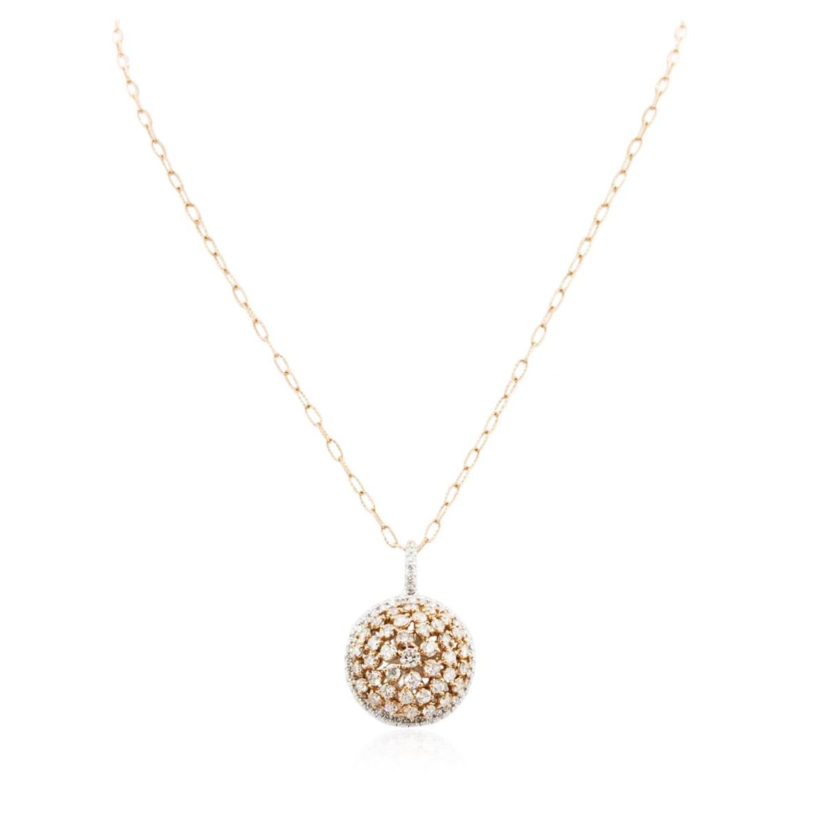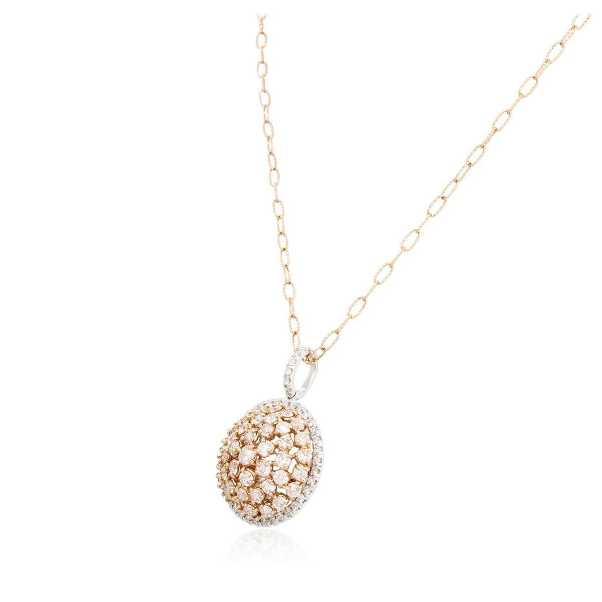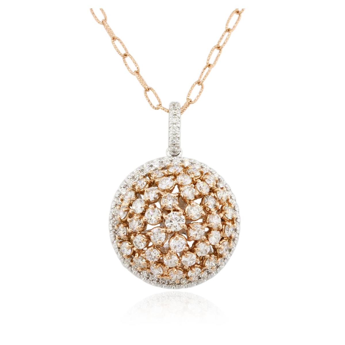 One electronically tested 14KT rose and white gold ladies cast & assembled diamond pendant with chain. The pendant features a rose gold diamond cluster set within a white gold diamond bezel, completed by a white gold diamond set bail. The pendant is supported by an eighteen inch length 14KT rose gold designer style link chain, terminating in a lobster claw clasp. Bright polish finish. Identified with markings of "K14". Condition is new, good workmanship. Containing: Forty prong set round brilliant cut diamonds, measuring 3.20 - 2.80 x 1.80mm (depth est.) approximate total weight of 40 Stones = 4.05ct. Graded in the setting. Clarity: SI-1 to I-1 . Color: G - I Forty-Four prong set round brilliant cut diamonds, measuring 1.60 - 1.50 x 0.93mm (depth est.) approximate total weight of 44 Stones = 0.69ct. Graded in the setting. Clarity: SI-1 to I-1 . Color: G - I. Total Weight of Diamonds 4.74ct. Total Weight of Pendant With Chain 14.38 grams. AIG Appraised at $16,225.00.