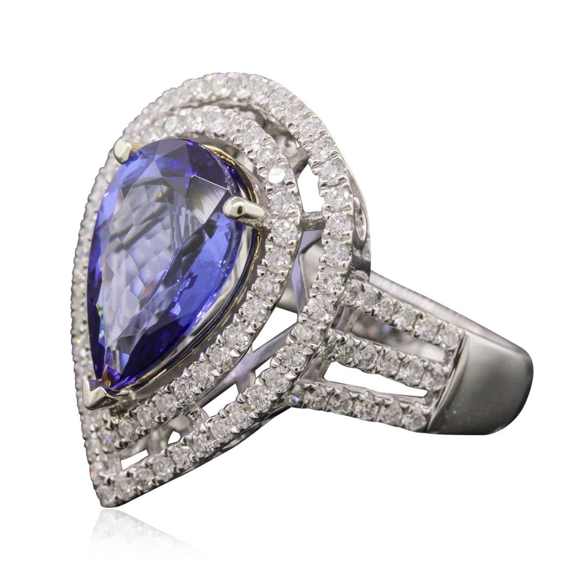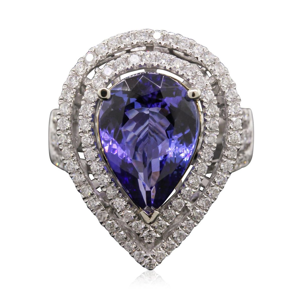 One electronically tested 14KT white and yellow gold Ladies combination cast & assembled ring with a bright polish finish. Condition is new. Identified with markings of "14K". Containing: One prong set pear modified brilliant cut natural tanzanite, measuring 14.00 x 9.40 x 6.11mm, approximate weight of 5.39ct., clarity is eye clean, type I, medium, moderately strong, bluish violet color, (GIA bV 5/4), cut is good. One Hundred Twelve prong set round brilliant cut diamonds, measuring 1.30 - 1.30 x 0.78mm (depth est.) approximate total weight of 112 Stones = 0.90ct. Clarity: I-1 to I-2. Color: H - I, Cut is Good. Colored gemstones are presumed to have been subjected to commonly used enhancement processes. All diamonds and colored gemstones are graded in the mounting, unless otherwise stated. Total Weight of Colored Stones 5.39ct. Total Weight of Diamonds 0.90ct. Total Weight of Ring 8.10 grams. GGL Appraised at $11,450.00.
