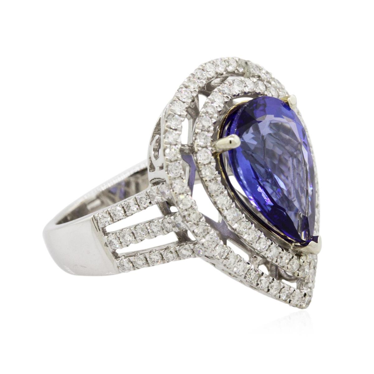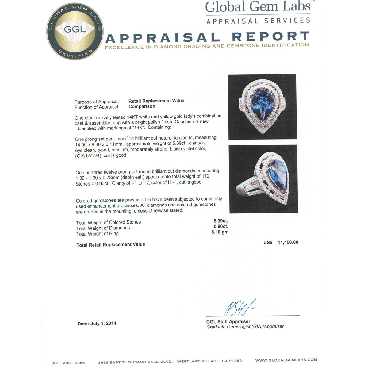 One electronically tested 14KT white and yellow gold Ladies combination cast & assembled ring with a bright polish finish. Condition is new. Identified with markings of "14K". Containing: One prong set pear modified brilliant cut natural tanzanite, measuring 14.00 x 9.40 x 6.11mm, approximate weight of 5.39ct., clarity is eye clean, type I, medium, moderately strong, bluish violet color, (GIA bV 5/4), cut is good. One Hundred Twelve prong set round brilliant cut diamonds, measuring 1.30 - 1.30 x 0.78mm (depth est.) approximate total weight of 112 Stones = 0.90ct. Clarity: I-1 to I-2. Color: H - I, Cut is Good. Colored gemstones are presumed to have been subjected to commonly used enhancement processes. All diamonds and colored gemstones are graded in the mounting, unless otherwise stated. Total Weight of Colored Stones 5.39ct. Total Weight of Diamonds 0.90ct. Total Weight of Ring 8.10 grams. GGL Appraised at $11,450.00.