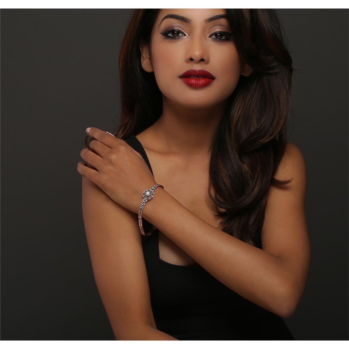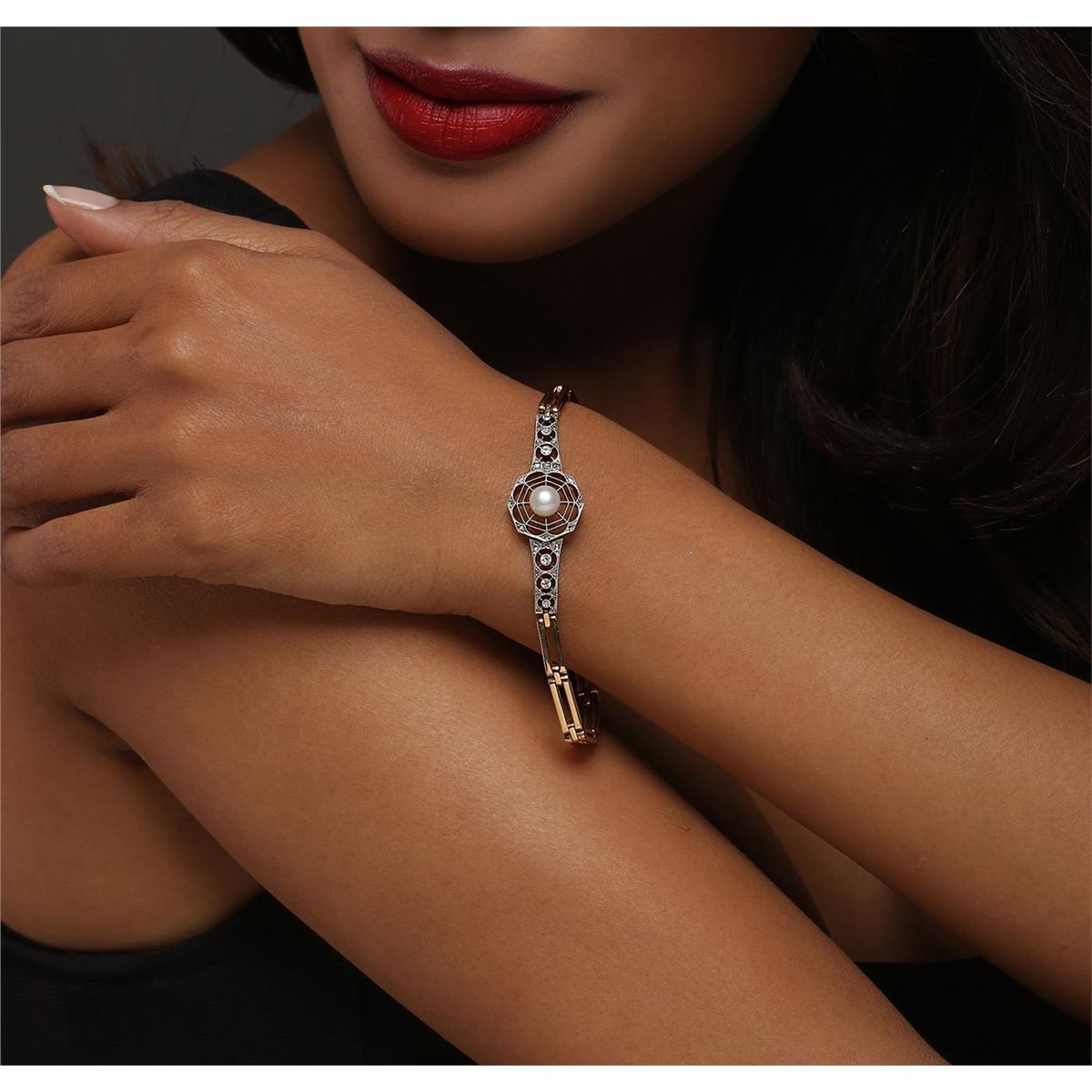 One electronically tested 14KT rose and white gold ladies hand assembled antique bracelet with a hidden box clasp with safety closer with a antiqued finish. Measurements: 7.50" in length. Condition is very good. Containing: One akoya cultured pearl, 6.5mm in size to 6.5mm in size. The pearl is white in color with a good luster, acceptable nacre, near round to off round, moderately blemished. Six gypsy set transitional cut diamonds, measuring 2.00 - 1.50 x 0.93mm (depth est.) approximate total weight of 6 Stones = 0.10ct. Clarity: SI-2 to I-1. Color: I - J, Cut is Good. Twenty-Six bead set rose cut diamonds, measuring 1.30 - 1.30 x 0.81mm (depth est.) approximate total weight of 26 Stones = 0.15ct. Clarity: I-1 to I-2. Color: I - J. Colored gemstones are presumed to have been subjected to commonly used enhancement processes. All diamonds and colored gemstones are graded in the mounting, unless otherwise stated. Total Weight of Diamonds 0.26ct. Total Weight of Bracelet 18.20 grams. GGL Appraised at $6,885.00.