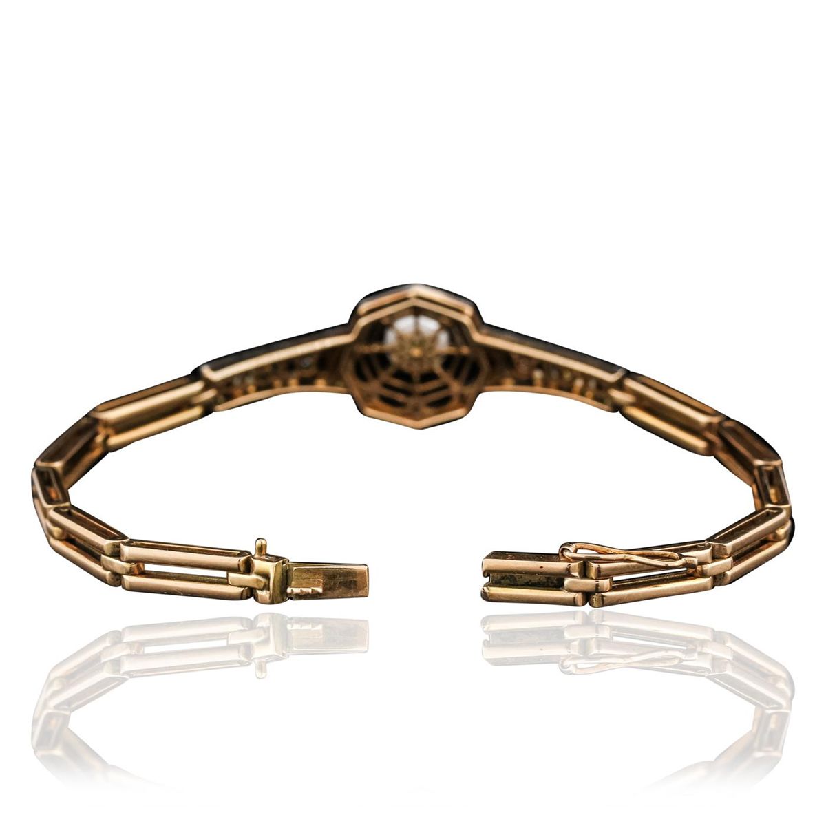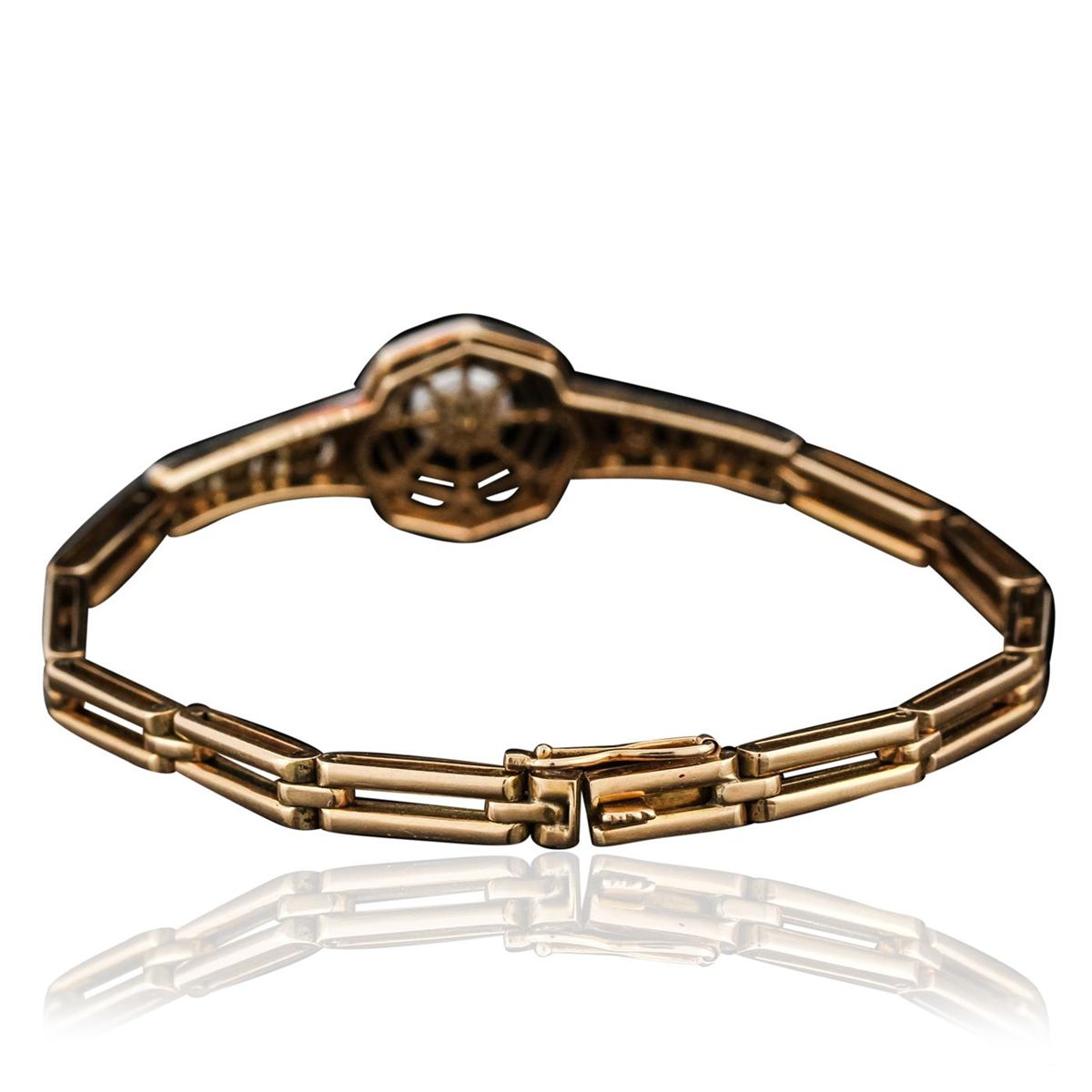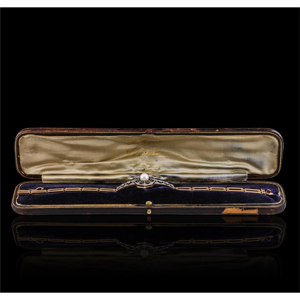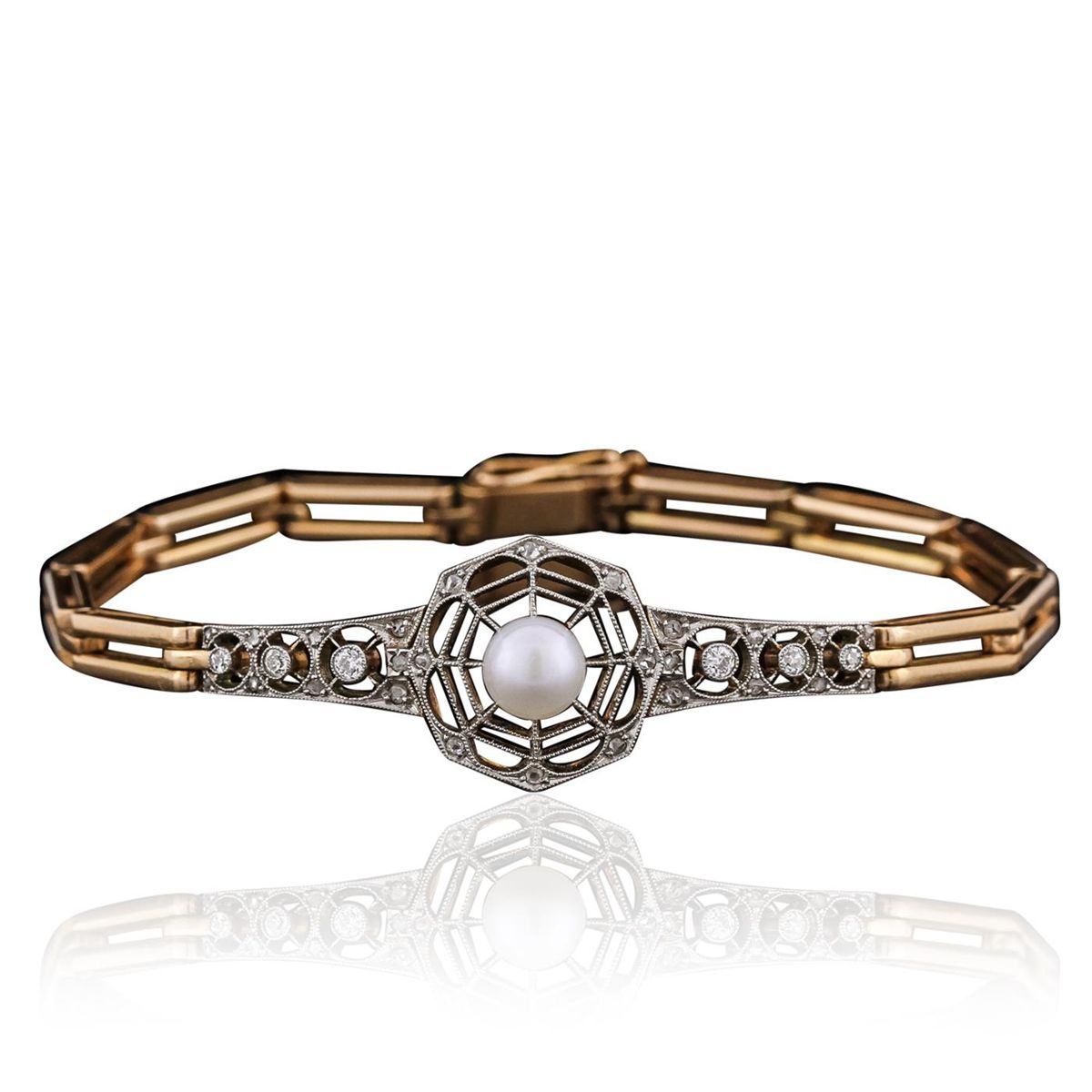One electronically tested 14KT rose and white gold ladies hand assembled antique bracelet with a hidden box clasp with safety closer with a antiqued finish. Measurements: 7.50" in length. Condition is very good. Containing: One akoya cultured pearl, 6.5mm in size to 6.5mm in size. The pearl is white in color with a good luster, acceptable nacre, near round to off round, moderately blemished. Six gypsy set transitional cut diamonds, measuring 2.00 - 1.50 x 0.93mm (depth est.) approximate total weight of 6 Stones = 0.10ct. Clarity: SI-2 to I-1. Color: I - J, Cut is Good. Twenty-Six bead set rose cut diamonds, measuring 1.30 - 1.30 x 0.81mm (depth est.) approximate total weight of 26 Stones = 0.15ct. Clarity: I-1 to I-2. Color: I - J. Colored gemstones are presumed to have been subjected to commonly used enhancement processes. All diamonds and colored gemstones are graded in the mounting, unless otherwise stated. Total Weight of Diamonds 0.26ct. Total Weight of Bracelet 18.20 grams. GGL Appraised at $6,885.00.