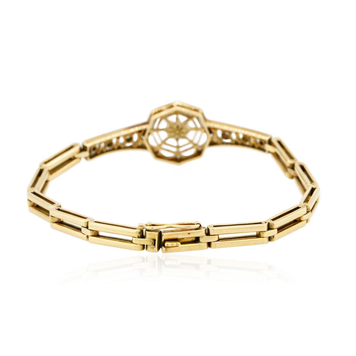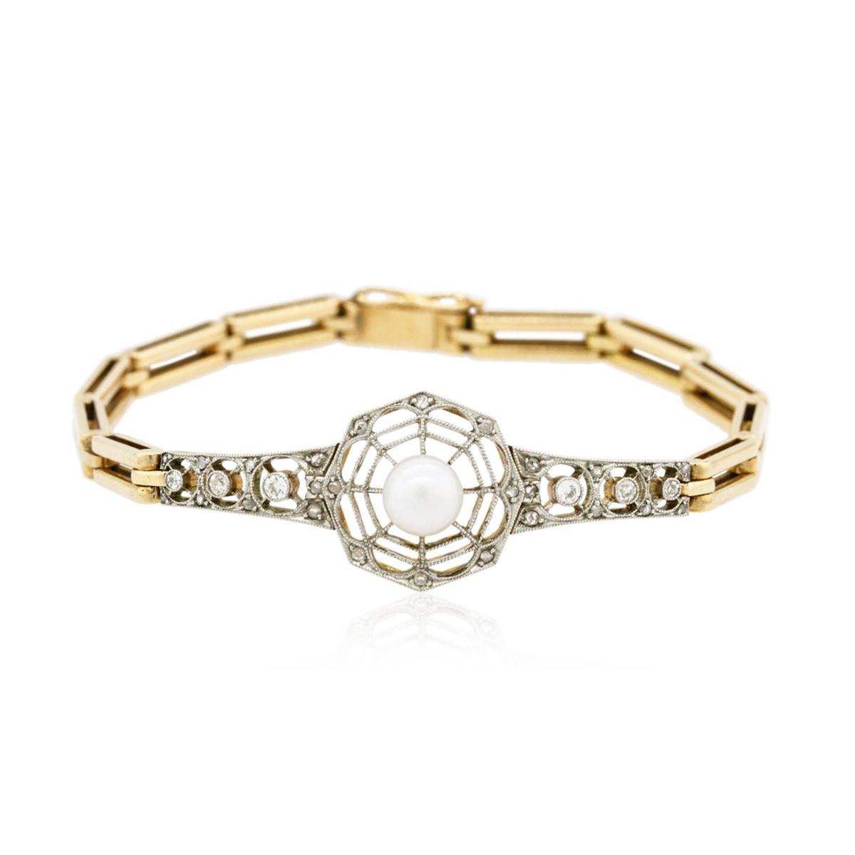 One electronically tested 14KT rose and white gold ladies hand assembled antique bracelet with a hidden box clasp with safety closer with a antiqued finish. Measurements: 7.50" in length. Condition is very good. Containing: One akoya cultured pearl, 6.5mm in size to 6.5mm in size. The pearl is white in color with a good luster, acceptable nacre, near round to off round, moderately blemished. Six gypsy set transitional cut diamonds, measuring 2.00 - 1.50 x 0.93mm (depth est.) approximate total weight of 6 Stones = 0.10ct. Clarity: SI-2 to I-1. Color: I - J, Cut is Good. Twenty-Six bead set rose cut diamonds, measuring 1.30 - 1.30 x 0.81mm (depth est.) approximate total weight of 26 Stones = 0.15ct. Clarity: I-1 to I-2. Color: I - J. Colored gemstones are presumed to have been subjected to commonly used enhancement processes. All diamonds and colored gemstones are graded in the mounting, unless otherwise stated. Total Weight of Diamonds 0.26ct. Total Weight of Bracelet 18.20 grams. GGL Appraised at $6,885.00.