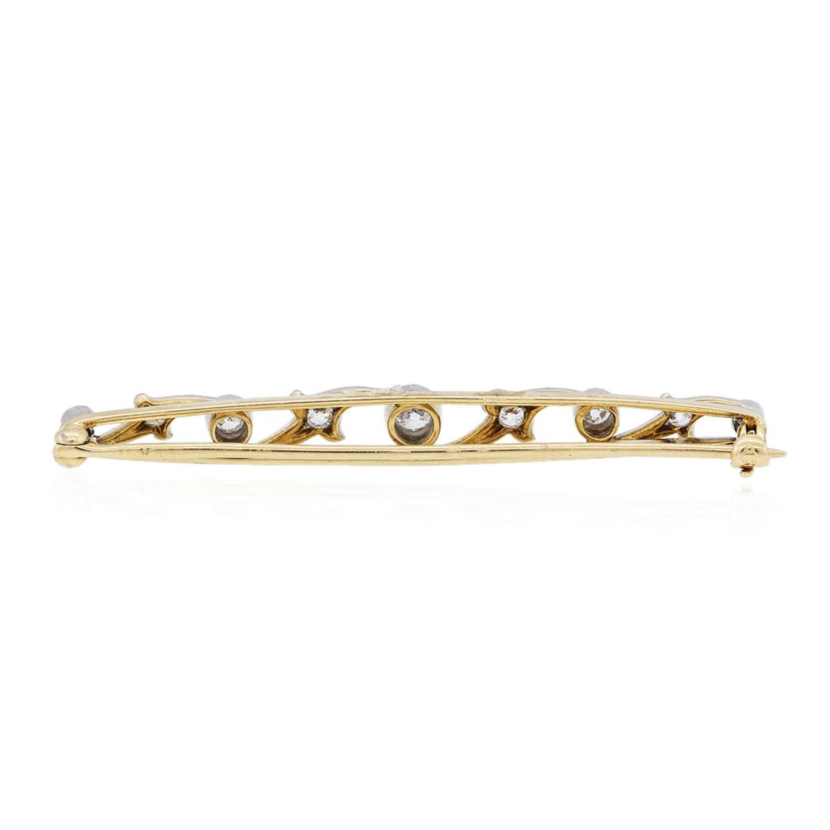 One electronically tested 14KT yellow and white gold ladies hand made antique pin with a bright polish finish. Condition is very good. Containing: Five gypsy set Old European cut diamonds, measuring 3.50 - 2.00 x 1.24mm (depth est.) approximate total weight of 5 Stones = 0.29ct. Clarity: SI-2. Color: H - I. Four prong set Old European cut diamonds, measuring 1.80 - 1.80 x 1.12mm (depth est.) approximate total weight of 4 Stones = 0.09ct. Clarity: I-1. Color: H - I. All diamonds are graded in the mounting, unless otherwise stated. Total Weight of Diamonds 0.37ct. Total Weight of Pin 4.40 grams. GGL Appraised at $2,245.00.