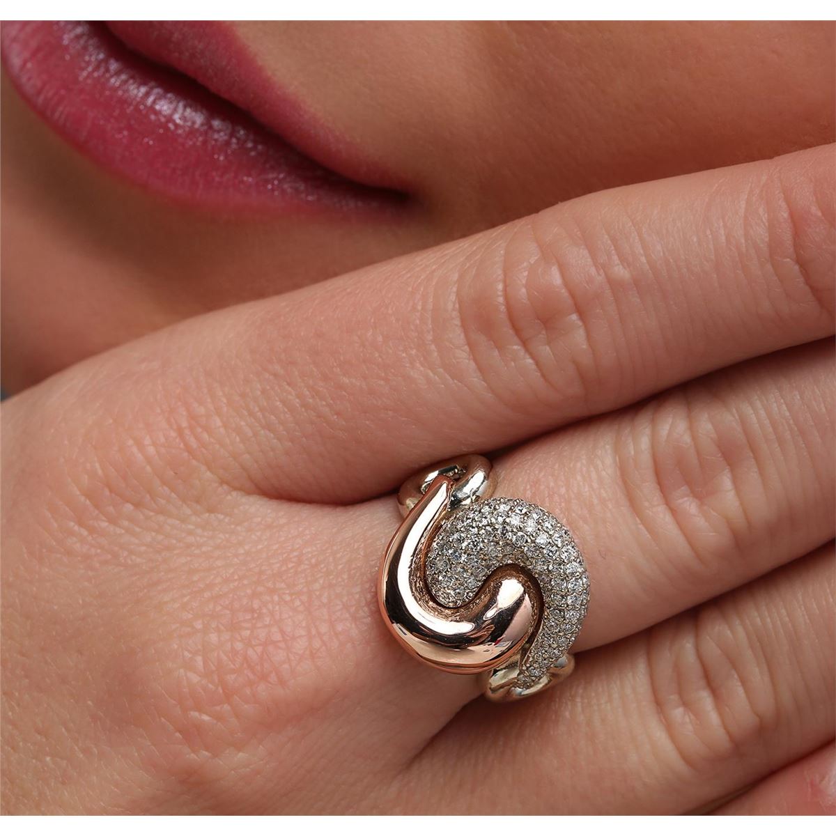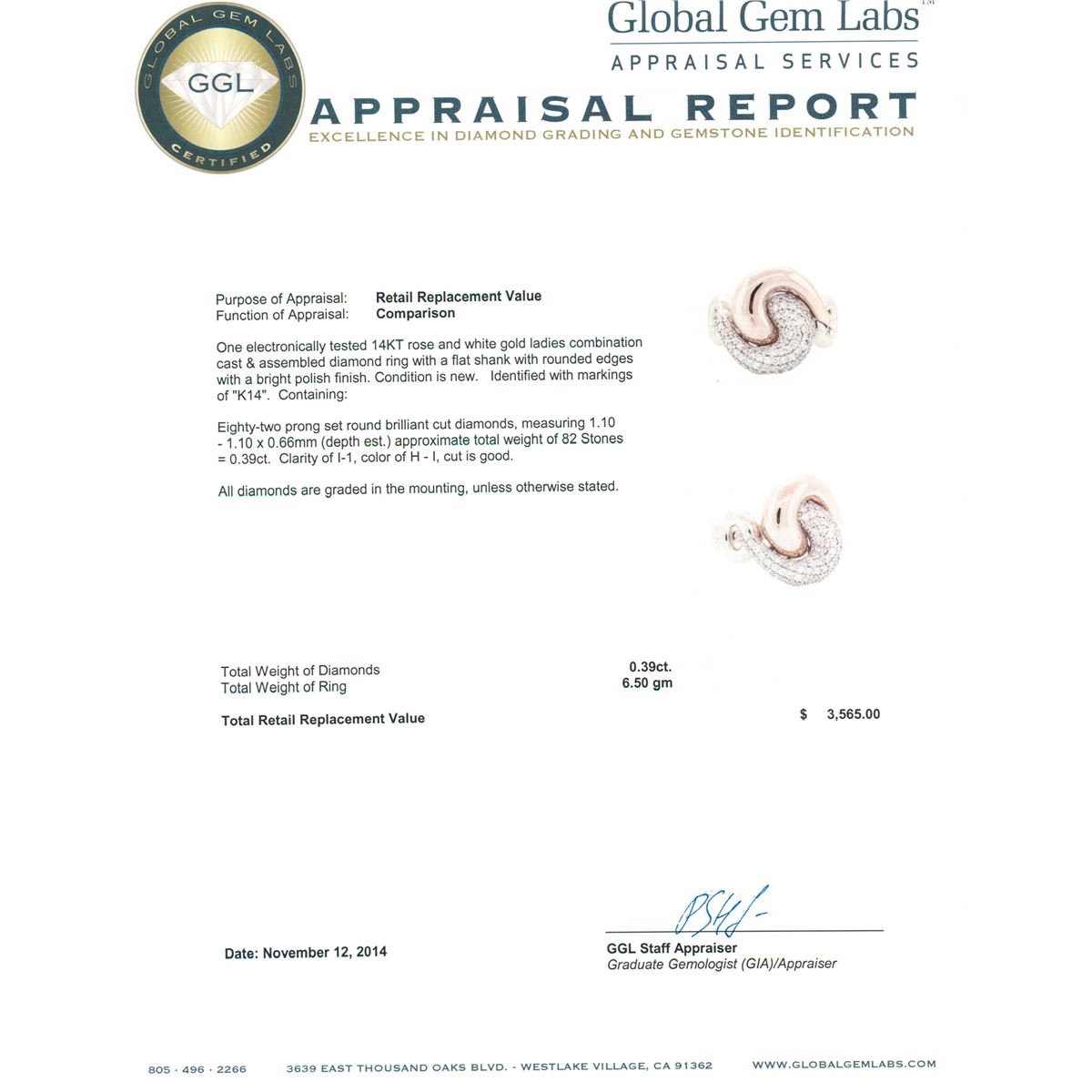 One electronically tested 14KT rose and white gold ladies combination cast & assembled diamond ring with a flat shank with rounded edges with a bright polish finish. Identified with markings of "K14". Condition is new. Containing: Eighty-Two prong set round brilliant cut diamonds, measuring 1.10 - 1.10 x 0.66mm (depth est.) approximate total weight of 82 Stones = 0.39ct. Clarity: I-1. Color: H - I, Cut is Good. All diamonds are graded in the mounting, unless otherwise stated. Total Weight of Diamonds 0.39ct. Total Weight of Ring 6.50 grams. GGL Appraised at $3,565.00.