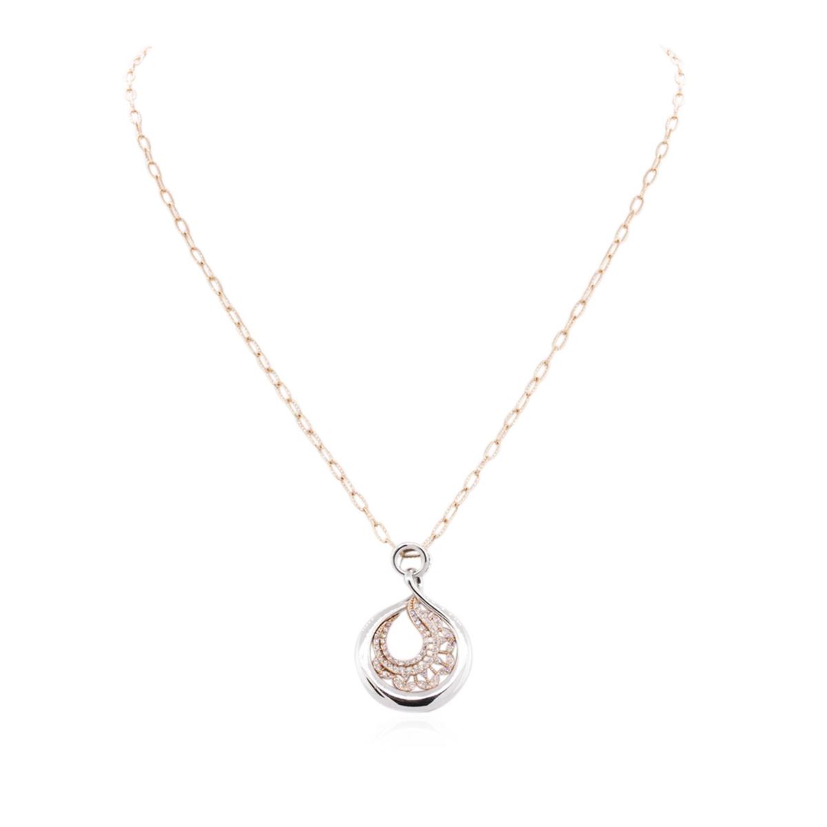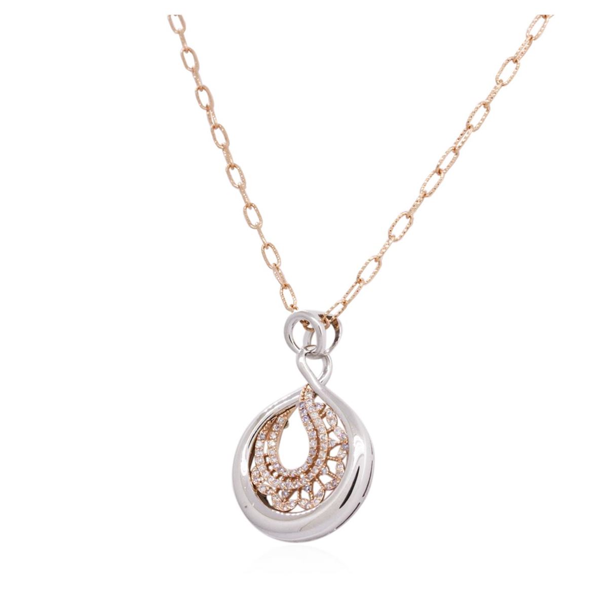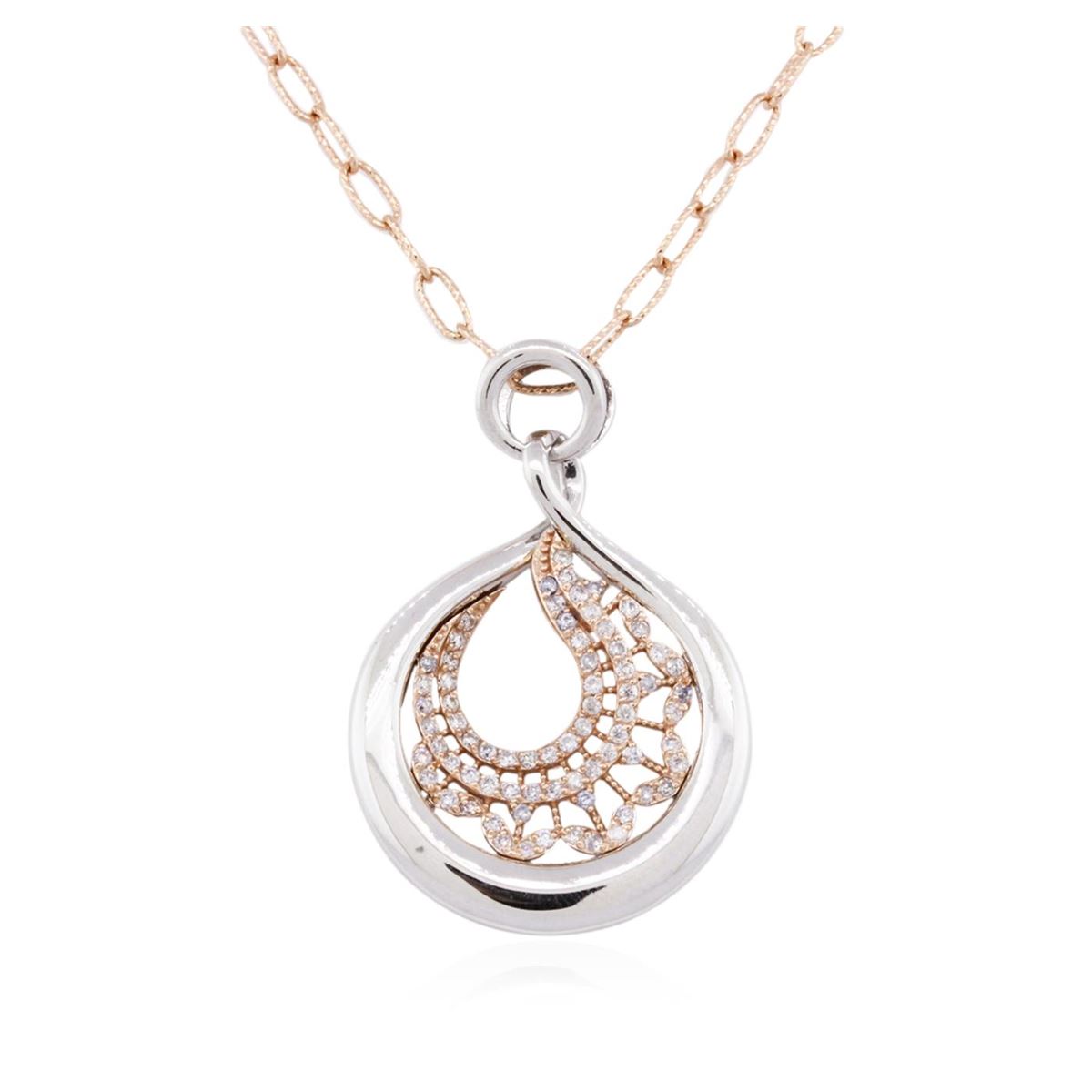 One electronically tested 14KT rose and white gold ladies combination cast & assembled diamond pendant & chain 18.0" long, figaro link with a lobster claw clasp with a bright polish finish. Identified with markings of "585". Condition is new. Containing: Seventy-One prong set round brilliant cut diamonds, measuring 1.20 - 1.20 x 0.72mm (depth est.) approximate total weight of 71 Stones = 0.45ct. Clarity: SI-2 to I-1. Color: H - I, Cut is Good. All diamonds are graded in the mounting, unless otherwise stated. Total Weight of Diamonds 0.45ct. Total Weight of Pendant & Chain 10.50 grams. GGL Appraised at $4,985.00.