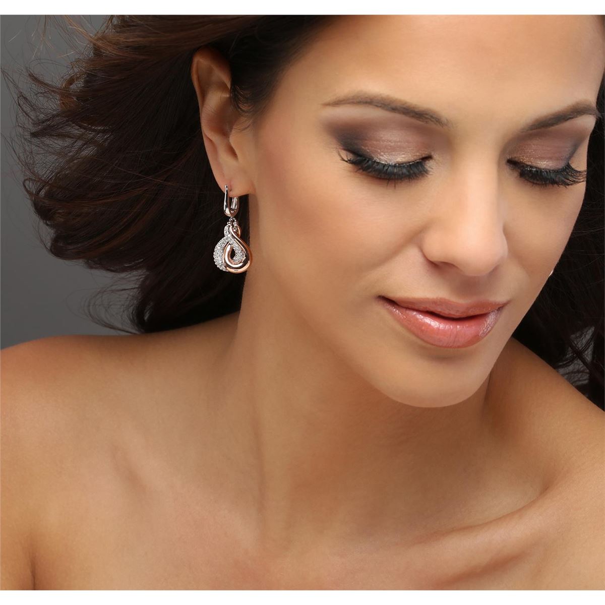 One pair electronically tested 14KT rose and white gold ladies cast diamond earrings with hinged clip backs with a bright polish finish. Identified with markings of "K14". Condition is new. Containing: One Hundred Ten bead set round brilliant cut diamonds, measuring 1.10 - 1.10 x 0.66mm (depth est.) approximate total weight of 110 Stones = 0.53ct. Clarity: I-1 to I-2. Color: I - J, Cut is Good. All diamonds are graded in the mounting, unless otherwise stated. Total Weight of Diamonds 0.53ct. Total Weight of Earrings 8.00 grams. GGL Appraised at $3,685.00.