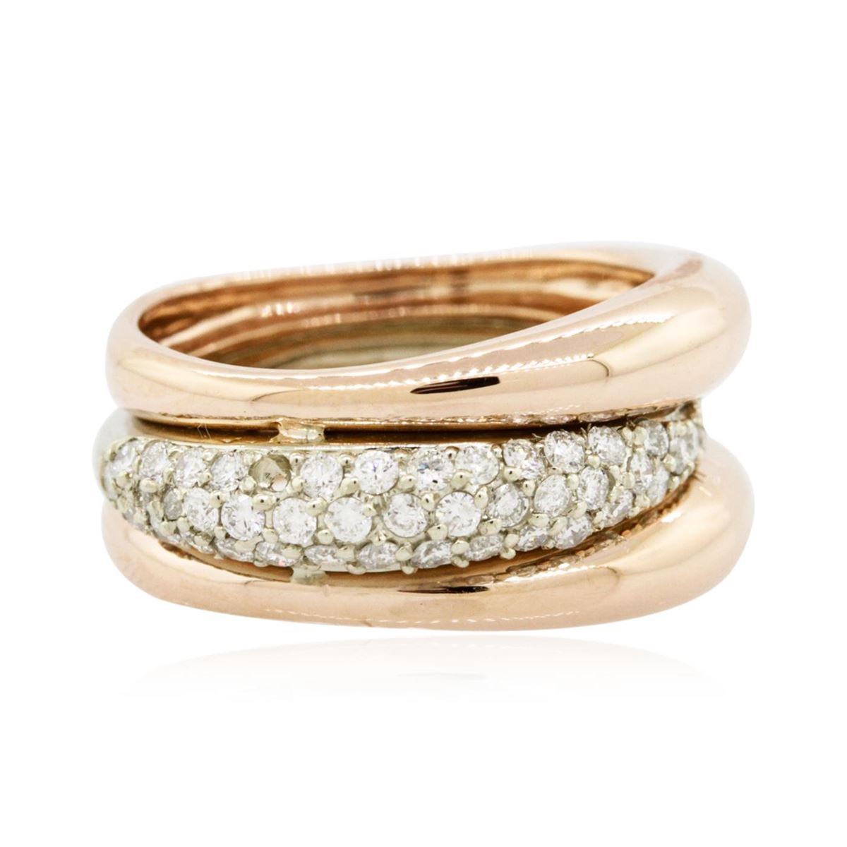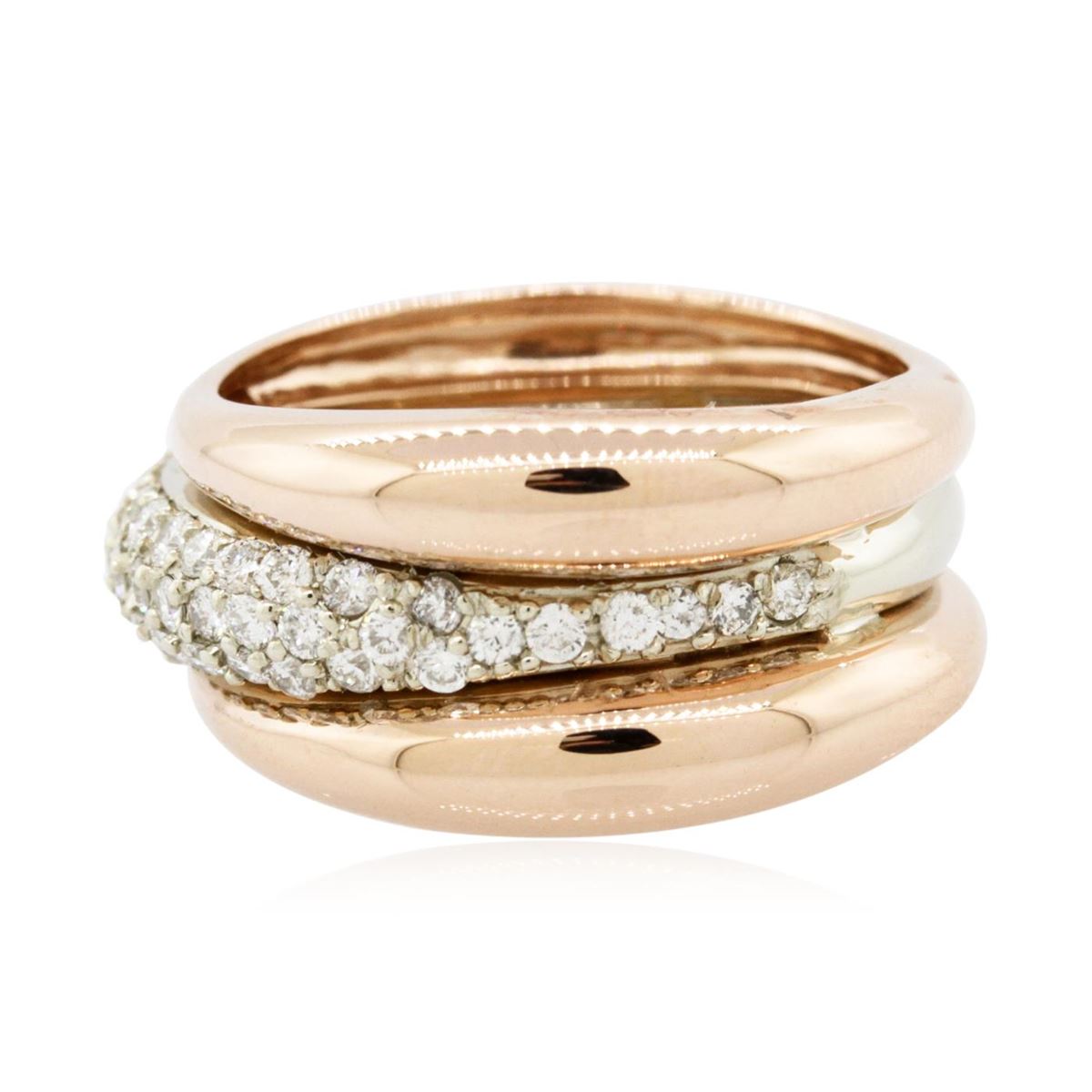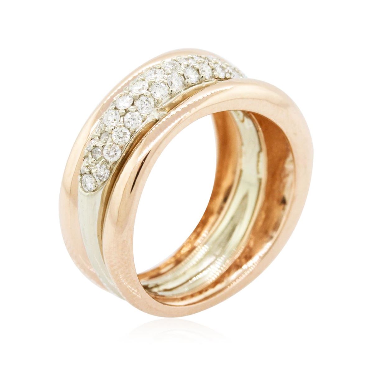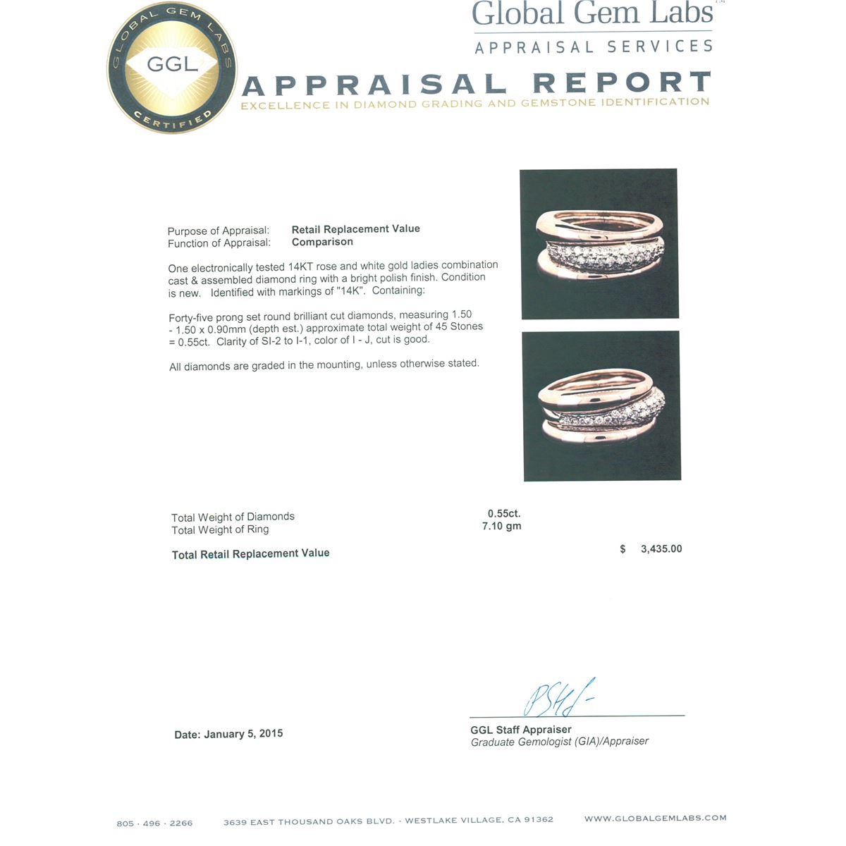 One electronically tested 14KT rose and white gold ladies combination cast & assembled diamond ring with a bright polish finish. Identified with markings of "14K". Condition is new. Containing: Forty-Five prong set round brilliant cut diamonds, measuring 1.50 - 1.50 x 0.90mm (depth est.) approximate total weight of 45 Stones = 0.55ct. Clarity: SI-2 to I-1. Color: I - J, Cut is Good. All diamonds are graded in the mounting, unless otherwise stated. Total Weight of Diamonds 0.55ct. Total Weight of Ring 7.10 grams. GGL Appraised at $3,435.00.