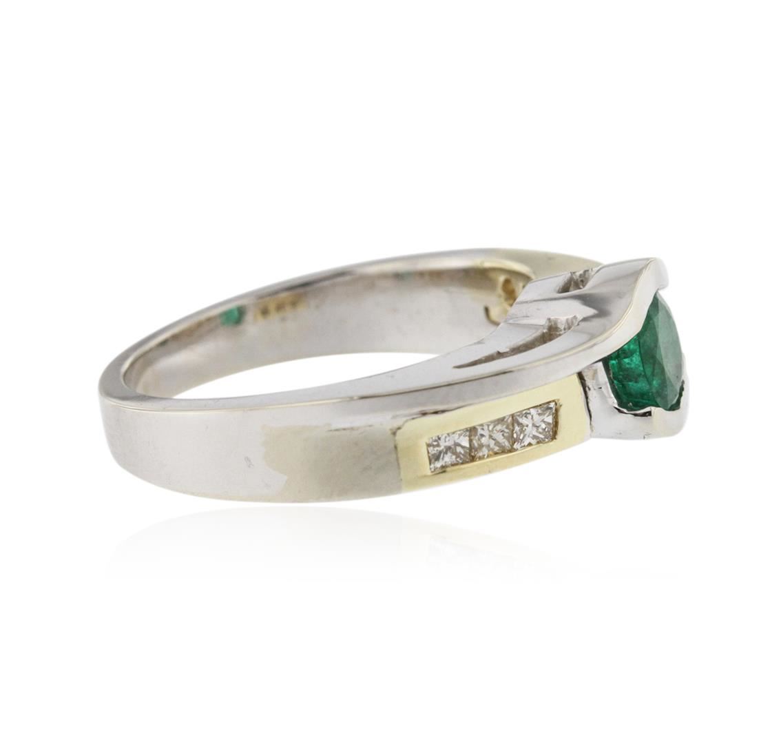 One ring featuring: 14KT white and yellow gold weighing 5.53 grams containing one round cut emerald center weighing 0.55ct and six princess cut diamonds weighing a total of 0.28ct.