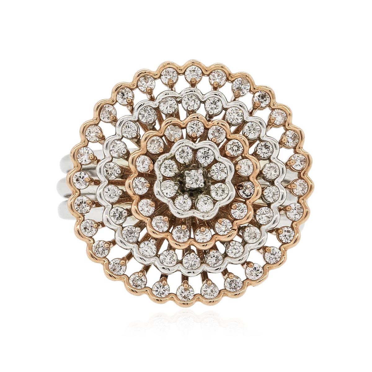 One electronically tested 14KT white and rose gold ladies combination cast & assembled "spin" ring with a bright polish finish. Condition is new. Identified with markings of "14K". Containing: Seventy-Three prong set round brilliant cut diamonds, measuring 1.30 - 1.30 x 0.78mm (depth est.) approximate. Total Weight of 73 Stones = 0.58ct. Clarity: SI-2 to I-1. Color: J - K, Cut is Good. All diamonds are graded in the mounting, unless otherwise stated. Total Weight of Diamonds 0.58ct. Total Weight of Ring 10.30 grams. GGL Appraised at $6,585.00.